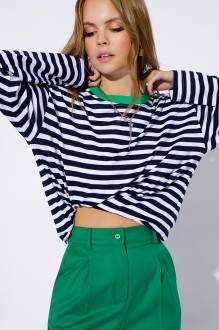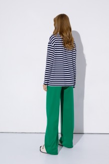 Комплект-двойка из свободного трикотажного джемпера в полоску и прямых брюк с высокой посадкой. Детали: джемпер прямого силуэта, круглая горловина переда с контрастной отделкой, спущенная линия плеча, длинные рукава. Брюки с высокой посадкой на притачном поясе со шлевками, застежка на молнию и пуговицу, боковые карманы, передние половины с заутюженными стрелками и двумя небольшими складками