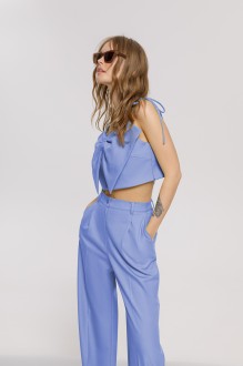Костюм-двойка из укороченного топа с декоративным элементом-бантом и широких брюк с высокой посадкой. Детали: топ полуприлегающего силуэта, нагрудные вытачки, глубокий V-образный вырез переда и спинки, застежка на потайную молнию в шве. Брюки с высокой посадкой на притачном поясе со шлевками, передние половины с небольшими застроченными мягкими складками и заутюженными стрелками, застежка на молнию и пуговицу, боковые карманы