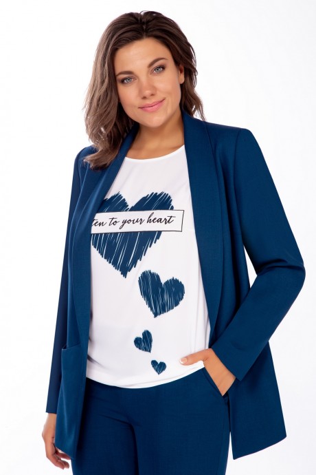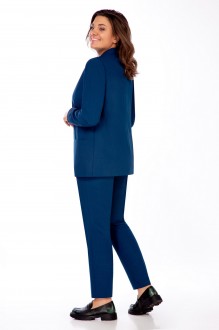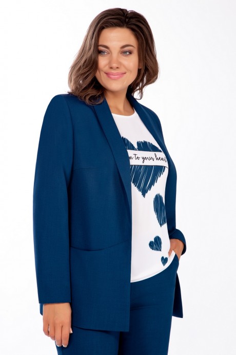 Стильный костюм состоящий из жакета, брюк и блузы. Жакет прямого силуэта на подкладке и без застежки. По переду обработаны горизонтальные карманы в швах. Рукава длинный. Брюки на поясе с резинкой, без застежки, к низу заужены. В боковых швах обработаны карманы с отрезным бочком. Блуза с коротким рукавом.