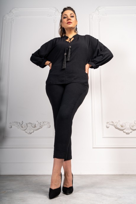 Костюм женский для любого мероприятия. Блузка женская как для праздников так и для любого повода, , покроя "летучая мышь" , со стойкой на которую настрочена завязка с декоративными кисточками из бахромы, со швом по центру полочки, рукава цельнокроеные, застёгивающиеся на петлю и пуговицу. низ блузки по спинке длиннее, по полочке короче. Брюки женские классического кроя , на притачном поясе с резинкой по спинке, с боковыми наклонными карманами. Задние половинки с талевыми вытачками.
