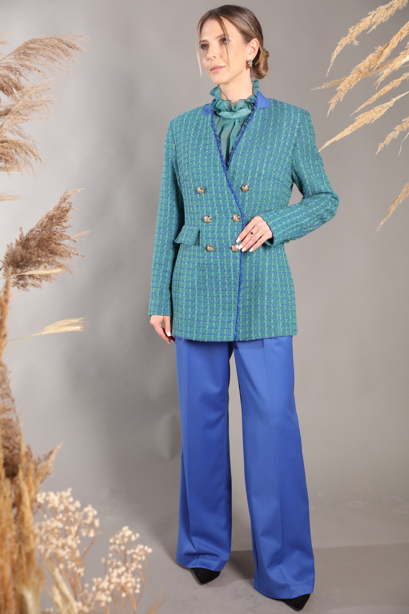 Классический двубортный жакет без лацканов и воротника из мягкого твида, среднего объема, полуприталенного силуэта. Застёжка на 2 пуговицы.