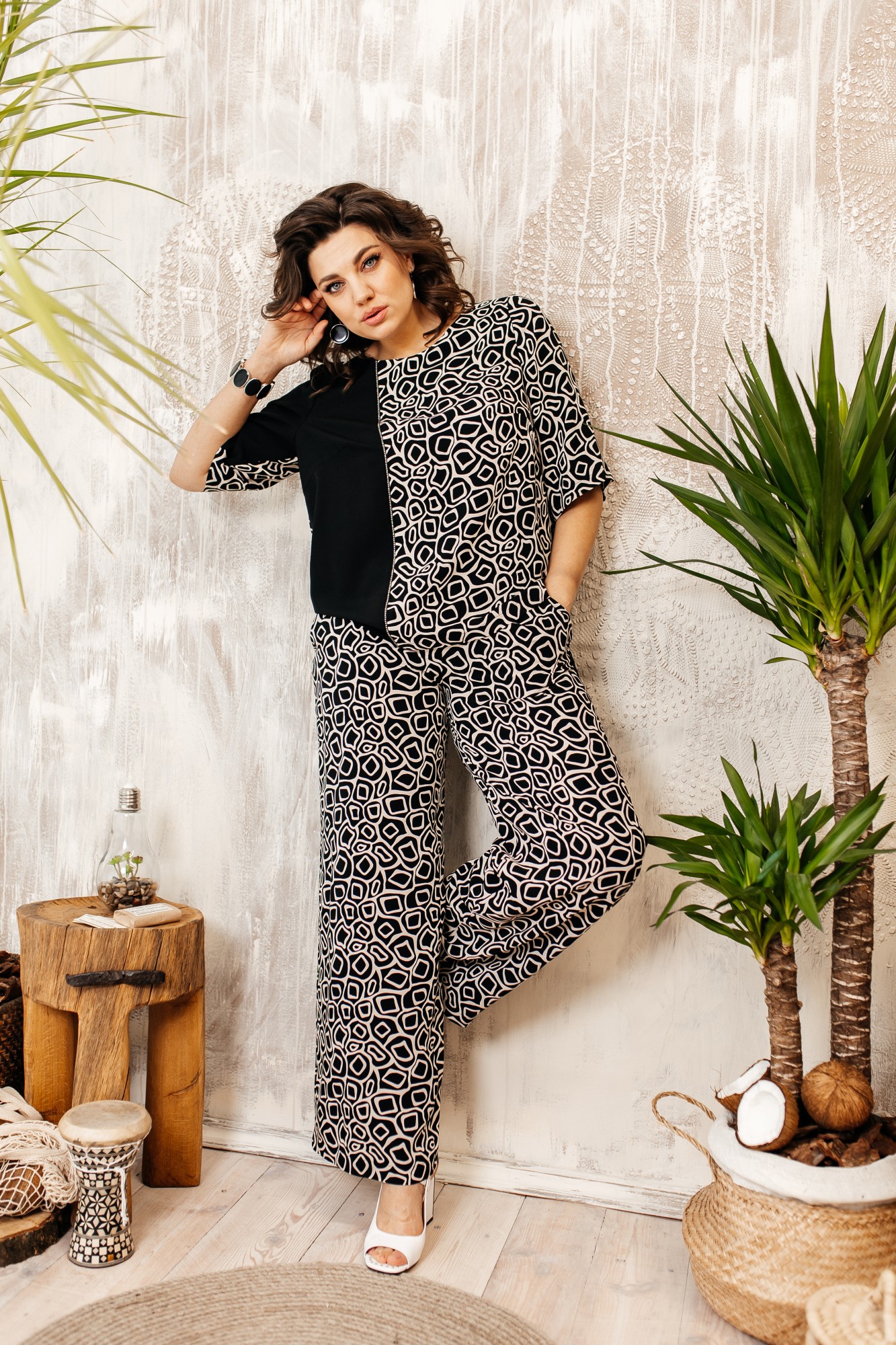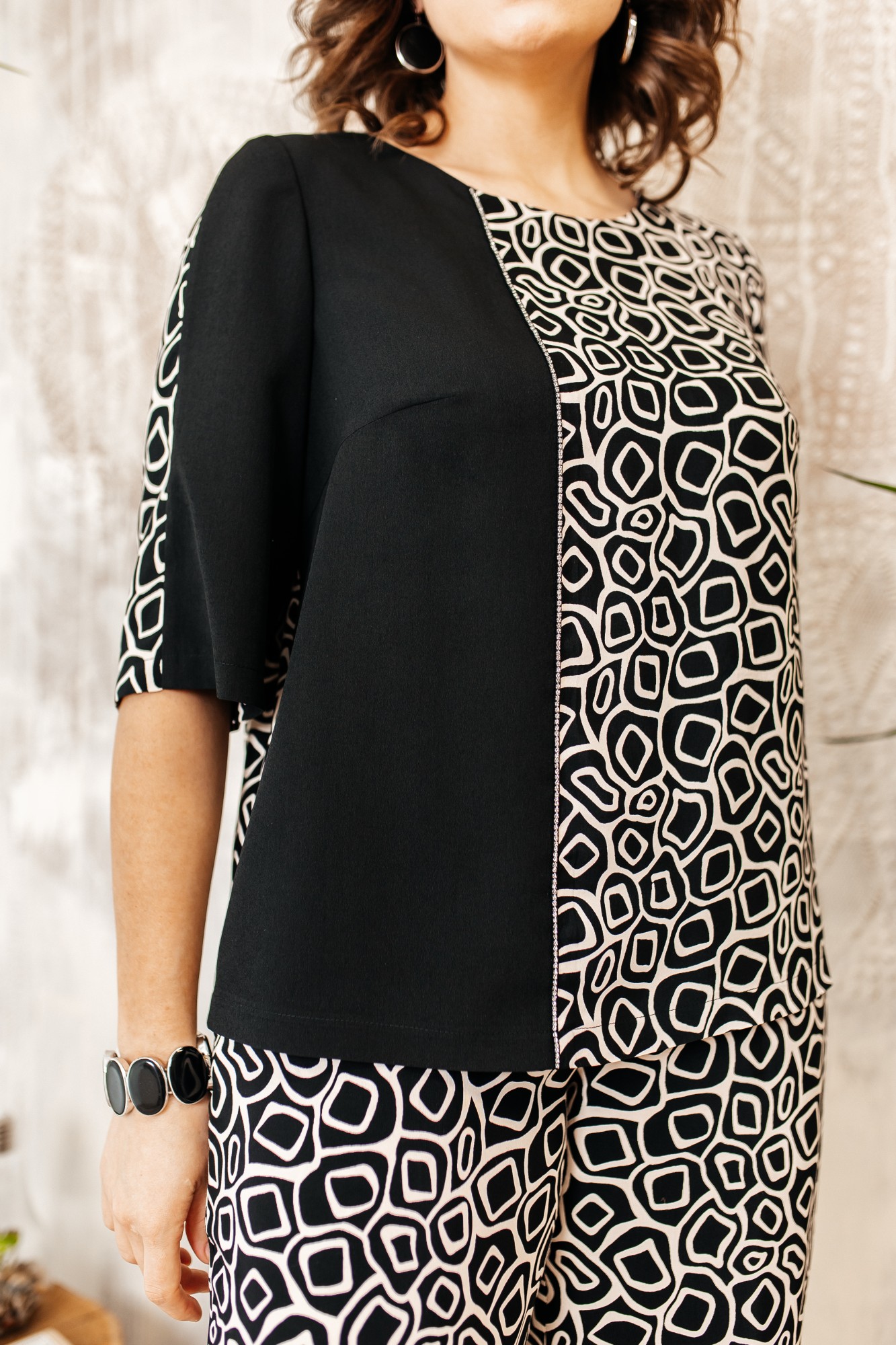 Костюм женский относится к нарядной торжественной одежде. Костюм двухпредметный: блузон и брюки. Блузон прямого силуэта, ниже линии бедер. Центральная часть переда с нагрудной вытачкой, с отрезным рельефом из отделочной ткани, с нагрудной вытачкой, шов соединения декорирован кантом. Спинка цельнокроенная. Горловина круглая, обтачная, без воротника, V-образный вырез по спинке, фиксирующийся на две завязки. Левый рукав втачной, одно шовный, длиной за локоть, первый-втачной, двух шовный, длинный. Передняя часть из отделочной ткани. Брюки длинные, прямые. Передние половинки с карманами в боковых швах. Левый боковой шов декорирован лампасом из отделочной ткани. Брюки с притачным поясом, собранным на эластичную тесьму, закреплённую двумя отделочными строчками.