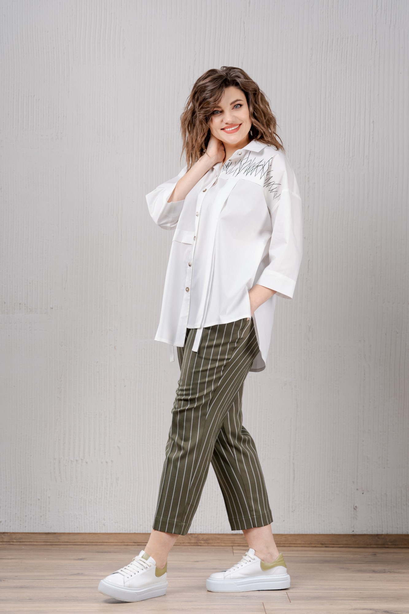Комплект женский двухпредметный. Рубашка свободного силуэта из хлопковой ткани. Воротник рубашечного типа. Застежка на петли и пуговицы. Рукава на базе цельнокроеных. Левая часть переда с кокеткой по груди, подрезом от кокетки. На правой части кокетка выше талии и от неё подрез до низа. Левая часть переда короче правой. В подрезы переда вставлены отлетные паты. На спинке кокетка и встречная складка от неё. В боковых швах разрезы. Низ асимметричный, фигурный. Левая часть переда и кокетка спинки с печатью. Длина по спинке - 77 см. Длина рукава от горловины - 62 см. Брюки свободного покроя из льна с вискозой в полоску, зауженные к низу. Пояс отрезной со вставкой эластичной тесьмы, застежка на молнию и петлю с пуговицей. В боковых швах карманы с отрезным бочком. Длина с учетом пояса - 100 см.