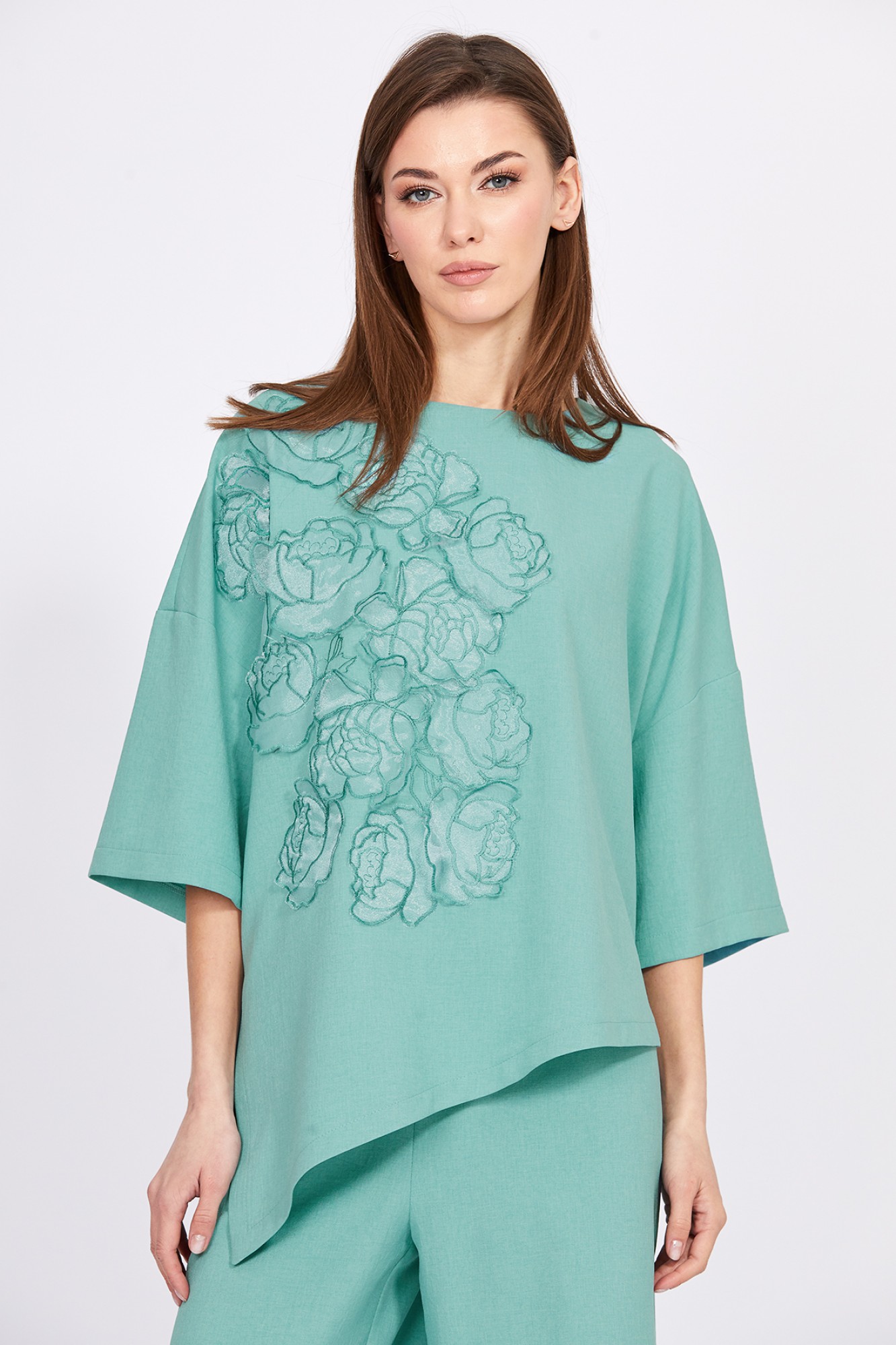 Комплект: блузка + брюки. Комплект выполнен из плательной ткани. Блузка прямого силуэта, длиной ниже линии бедер. Перед и спинка цельная. Горловина округлой формы. Застежка сзади на навесную петлю и пуговицу. Плечевой шов слегка спущен. Рукав одношовный, длиной ниже линии локтя. Низ переда ассиметричный. В боковых швах разрезы. Блузка декорирована 3d-аппликацией из органзы. Брюки на притачном поясе с эластичной тесьмой, прямого покроя, длиной в пол. Спереди карманы с наклонным входом.