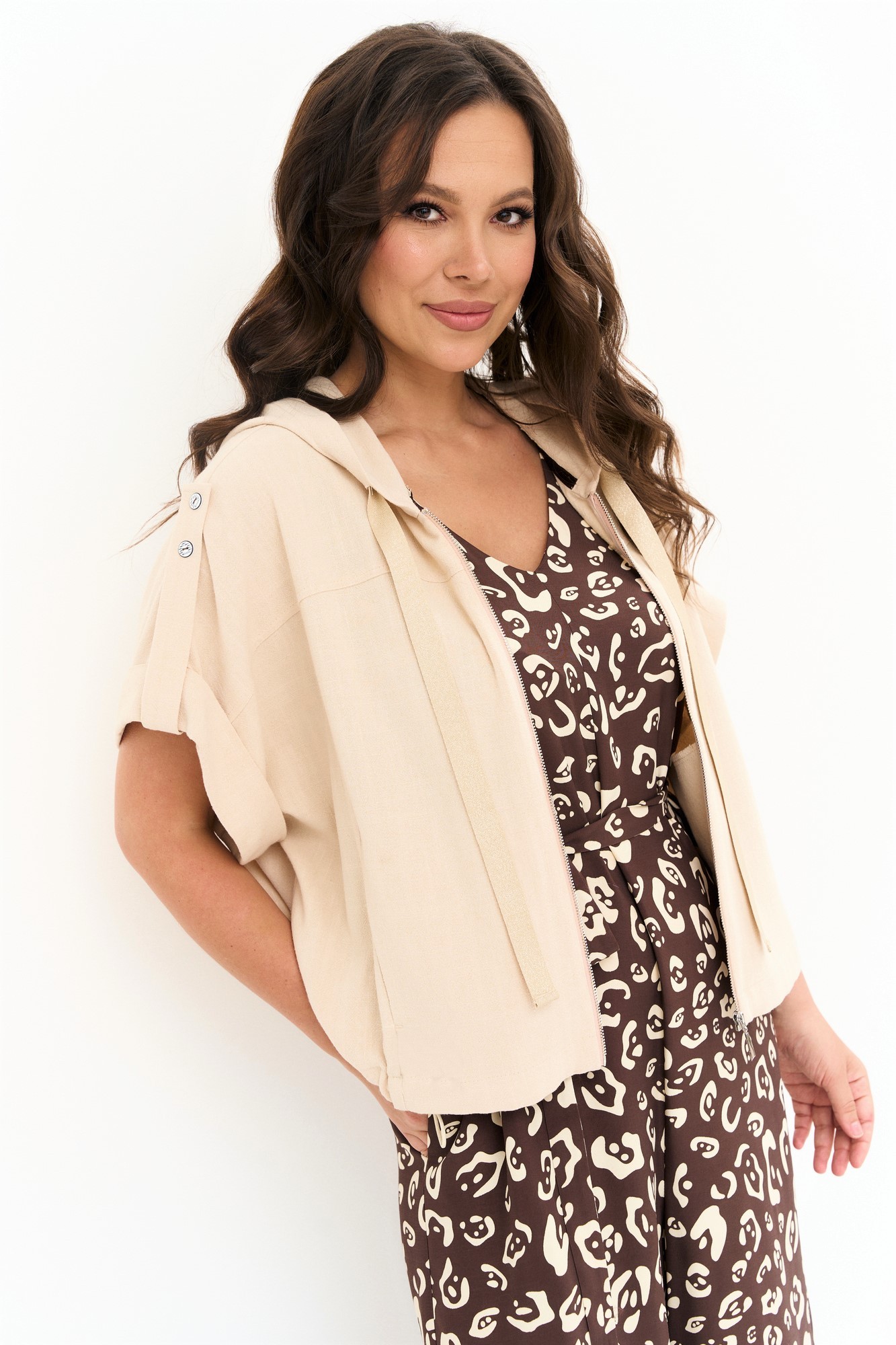 Стильный легкий комплект из блузы и комбинезона. Блуза свободного кроя с застежкой на металлическую молнию. Дополнена капюшоном и боковыми карманами. Легкий комбинезон из вискозы, прямого силуэта длиной 7/8, без рукавов, с V-образным вырезом горловины. Дополнен удобными боковыми карманами. Притален съемным поясом, выполненным из основной ткани. Застежка комбинезона на молнию в среднем шве спинки.