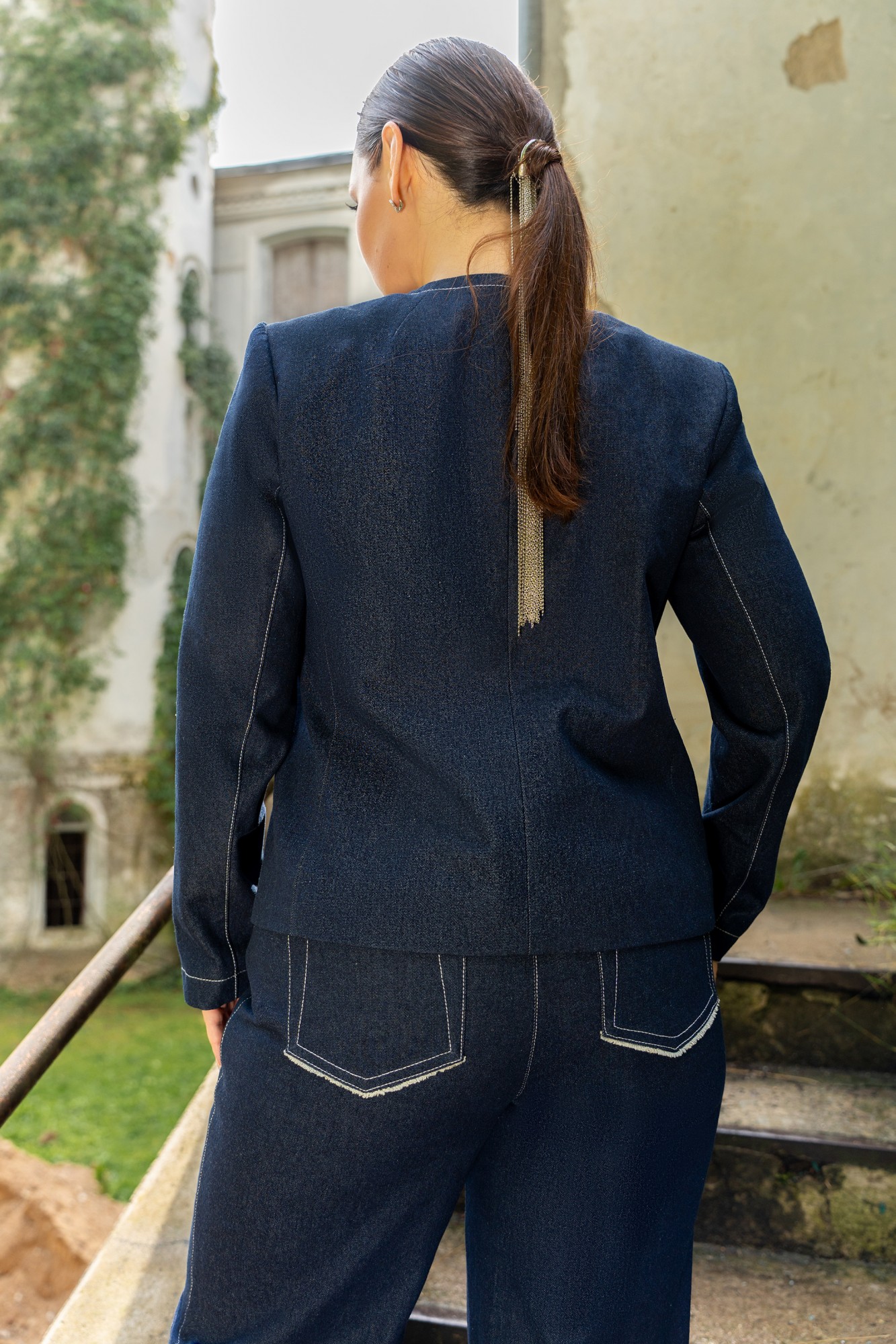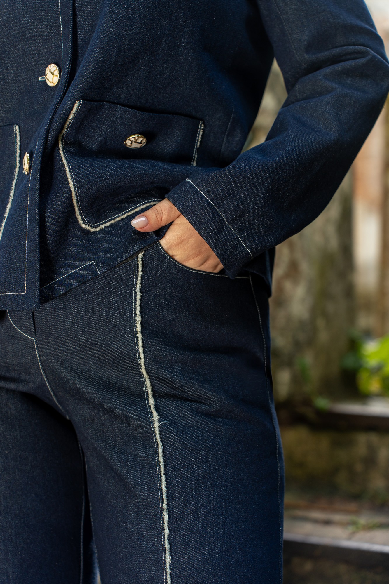 Костюм жакет на подкладке и брюки, из джинса. Безусловная классика современная и всегда привлекает взгляды. Жакет прямого кроя, с круглым вырезом горловины, воротник пиджачного типа. Жакет с центральной бортовой застёжкой на петли и пуговицы. На полочках обработаны накладные карманы с бахромой. жакет с плечевыми накладками. Брюки женские прямого силуэта, современная классическая, по переду пояс со шлёвками, и застёжка на тесьму-молнию и пуговицу, по спинке пояс с эластичной резинкой. Брюки с боковыми наклонными карманами. Брюки со складками по переду. Задние половинки с накладными фигурными карманами с бахромой.