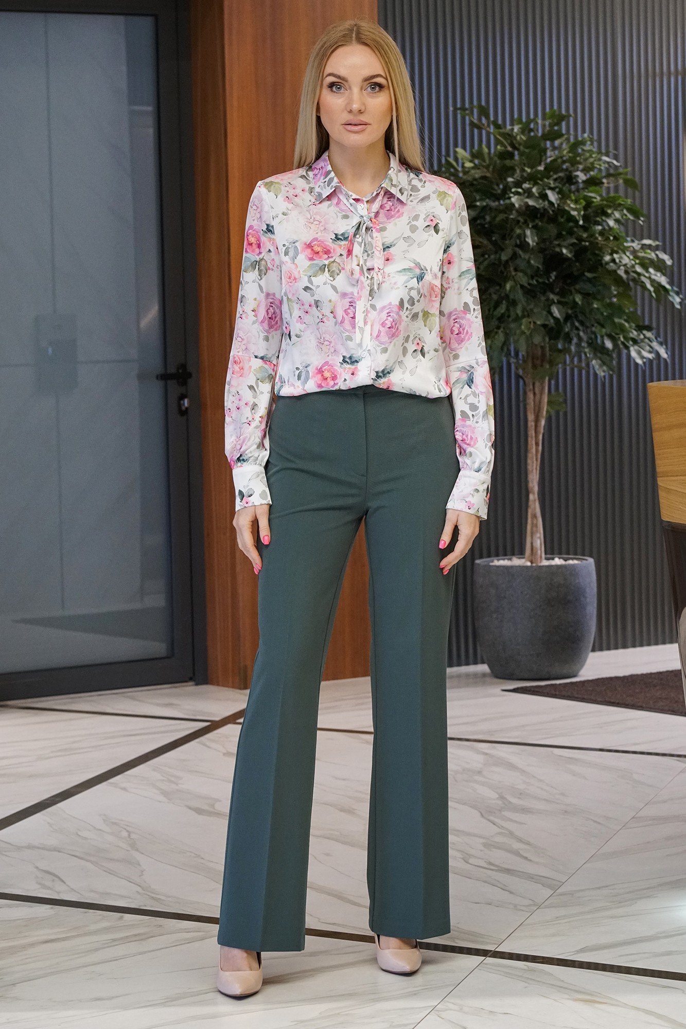 Комплект женский 2-х предметный состоит из блузки и брюк. Блузка женская полуприлегающего силуэта, с застёжкой по цельнокроеной планке на петли и пуговицы, низ фигурной формы.