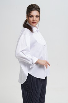 Блузка прямого, свободного силуэта, с застёжкой на петли, пуговицы, со спущенной линией плеча, с фигурной линией низа. Спинка со средним швом с драпировкой, с V- образным вырезом по кокетке. Рукава втачные, одношовные, длинные, понизу с разрезом, с мягкими складками и притачными широкими манжетами на петлю, пуговицу. Воротник стояче-отложной на отрезной стойке на петлю, пуговицу.