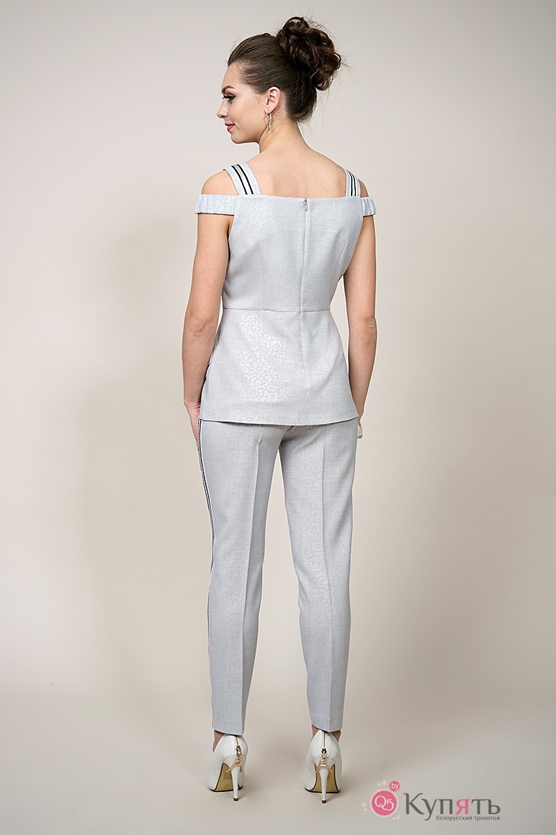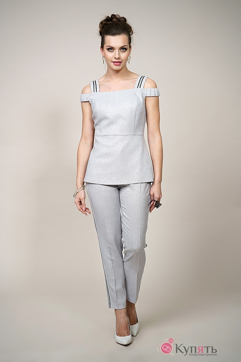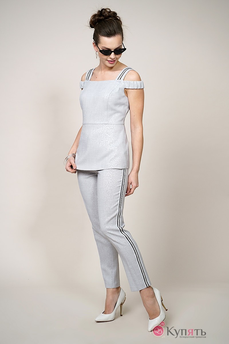 Комплект брючный. Блуза полуприлегающего силуэта, отрезная по линии талии. Спинка со средним швом, в который вставлена потайная тесьма-молния. Блуза на бретелях и шлейках на предплечье с широкой эластичной тесьмой. Украшает блузу отделочная тесьма. Полотно блузы похоже на натуральный лен, облегченное, почти без стрейча. Брюки длиной до щиколотки, на притачном поясе с застежкой в среднем шве на тесьму-молнию и одну петлю и пуговицу. Передние части с косыми боковыми карманами. Задние части с талиевыми вытачками. Брюки декорированы отделочной тесьмой по боковым швам.