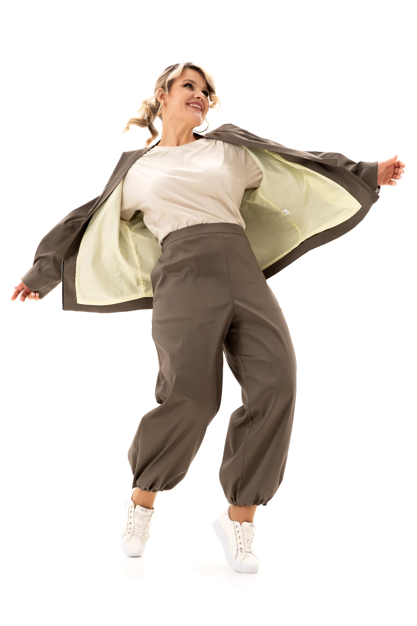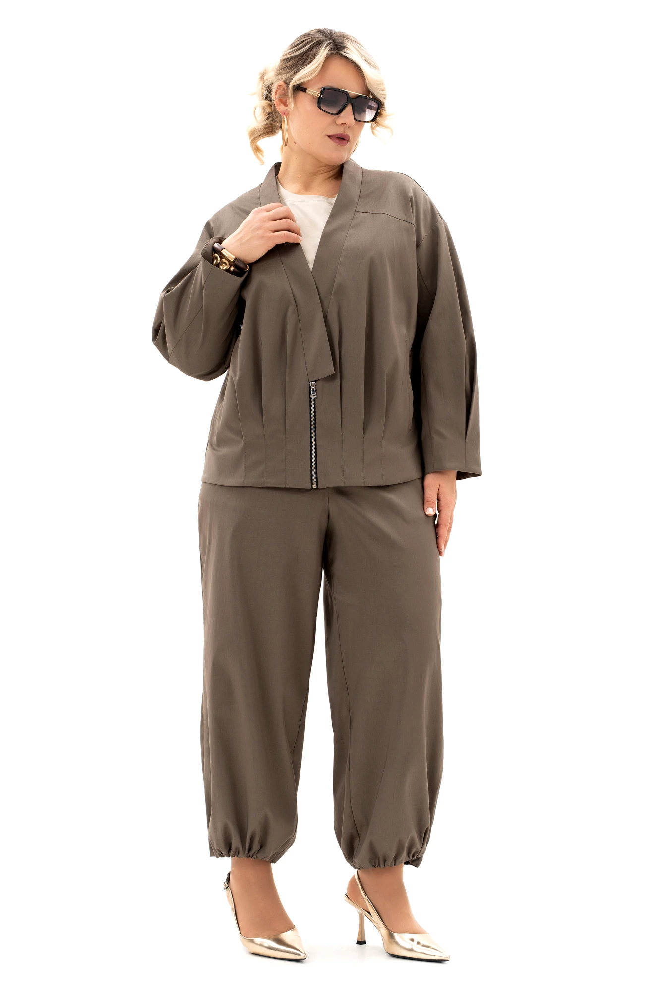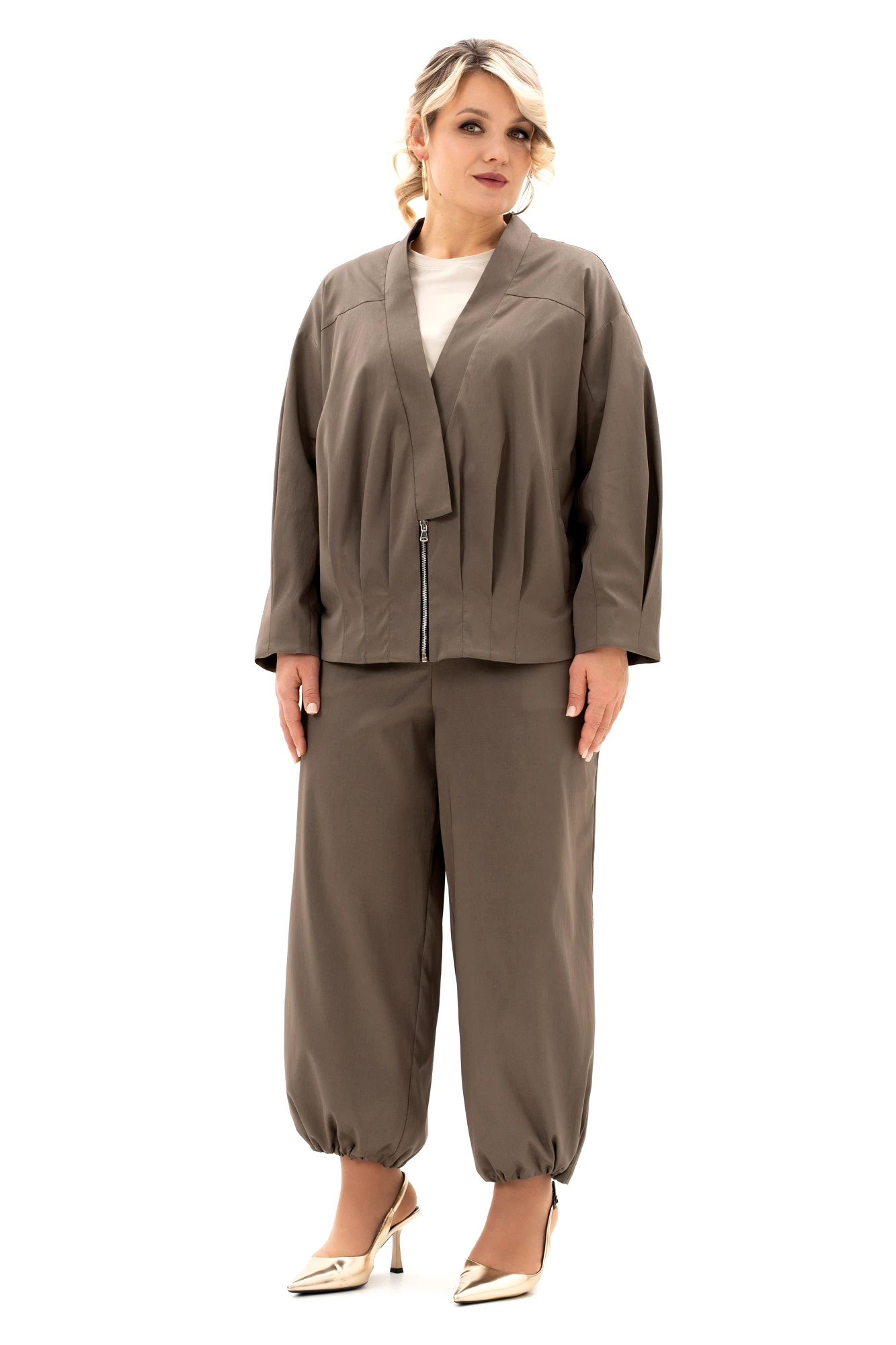 Представляем трех предметный комплект "Алладин". Лёгкий жакет-курточного типа на подкладке, майка и брюки-алладины подходит для девушек любого возраста. Костюмная ткань с хорошим стрейч-эффектом добавит комфорта при носке изделия. Жакет свободного силуэта на подкладке с воротником-стойка. Спинка без среднего шва c отрезной кокеткой, где заложены небольшие складки. По переду жакета есть застроченные складки от низа, карман в листочку, застёжка на молнию и потайной магнит. Рукав втачной, длинный, по низу есть также застроченные складки. Этот демисезонный жакет станет отличным вариантом для весенних и осенних дней, когда хочется выглядеть привлекательно и чувствовать себя комфортно и модно. Майка из вискозы с круглым вырезом горловины, спущенным плечом, коротким рукавом. Удобные и комфортные брюки-алладины-это универсальная модель для повседневной носки, отдыха, прогулок. Этот комплект- незаменимая в гардеробе вещь, которая подчеркнёт всю утончённость женской натуры и позволит всегда чувствовать себя комфортно. Брюки идут с карманами в боковых швах. Пояс в области задней части брюк дополнен эластичной тесьмой, по низу брюк есть фиксаторы и эластичный шнур для регулировки ширины. Свободный широкий силуэт ,мягкая посадка и комфортная резинка на талии обеспечит удобство и свободу движений. Элегантная повседневная модель для города. Замечательный комплект в Ваш гардероб!