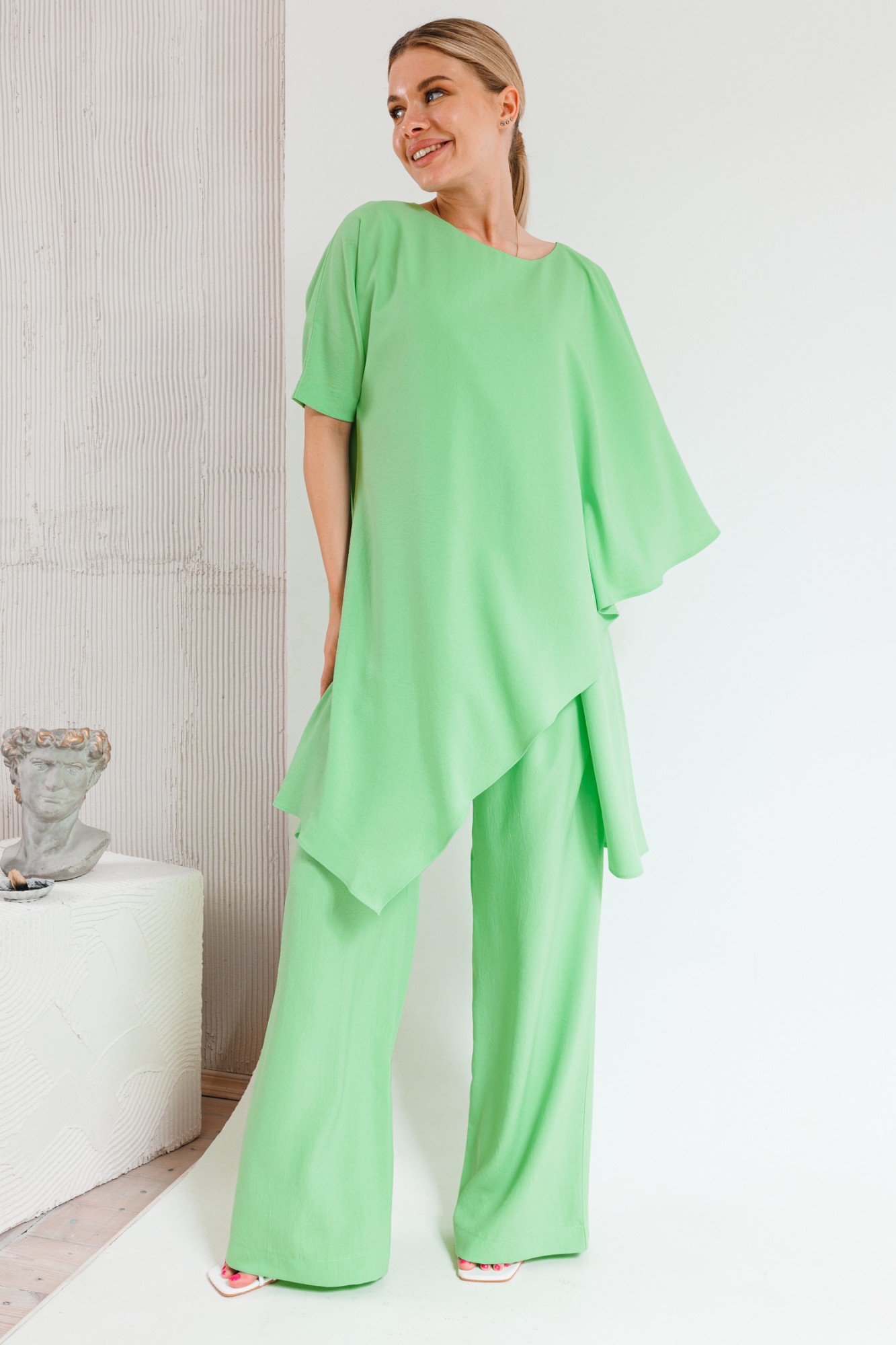 Костюм двухпредметный: состоящий из Блузки и брюк .Блузка-Туника А-силуэта,двойная с фигурным низом.Вырез горловины круглый,рукав летучая мышь.Брюки палаццо свободного кроя с притачным поясом на резинеке.В боковых шах прорезные карманы.