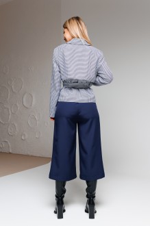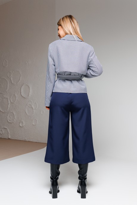 Жакет прямого силуэта,с воротником пиджачного типа.По переду и спинке отлетные кокетки.По переду в области талии декоративные клапаны.Жакет на подкладке с поясом.Застежка на пришивные кнопки.Брюки -Кюлоты прямого силуэта.По талии притачной пояс,частично на резинке для лучшего прилегания.По переду в боковых швах прорезные карманы с наклонным входом.По переду застежка на тесьму-молнию