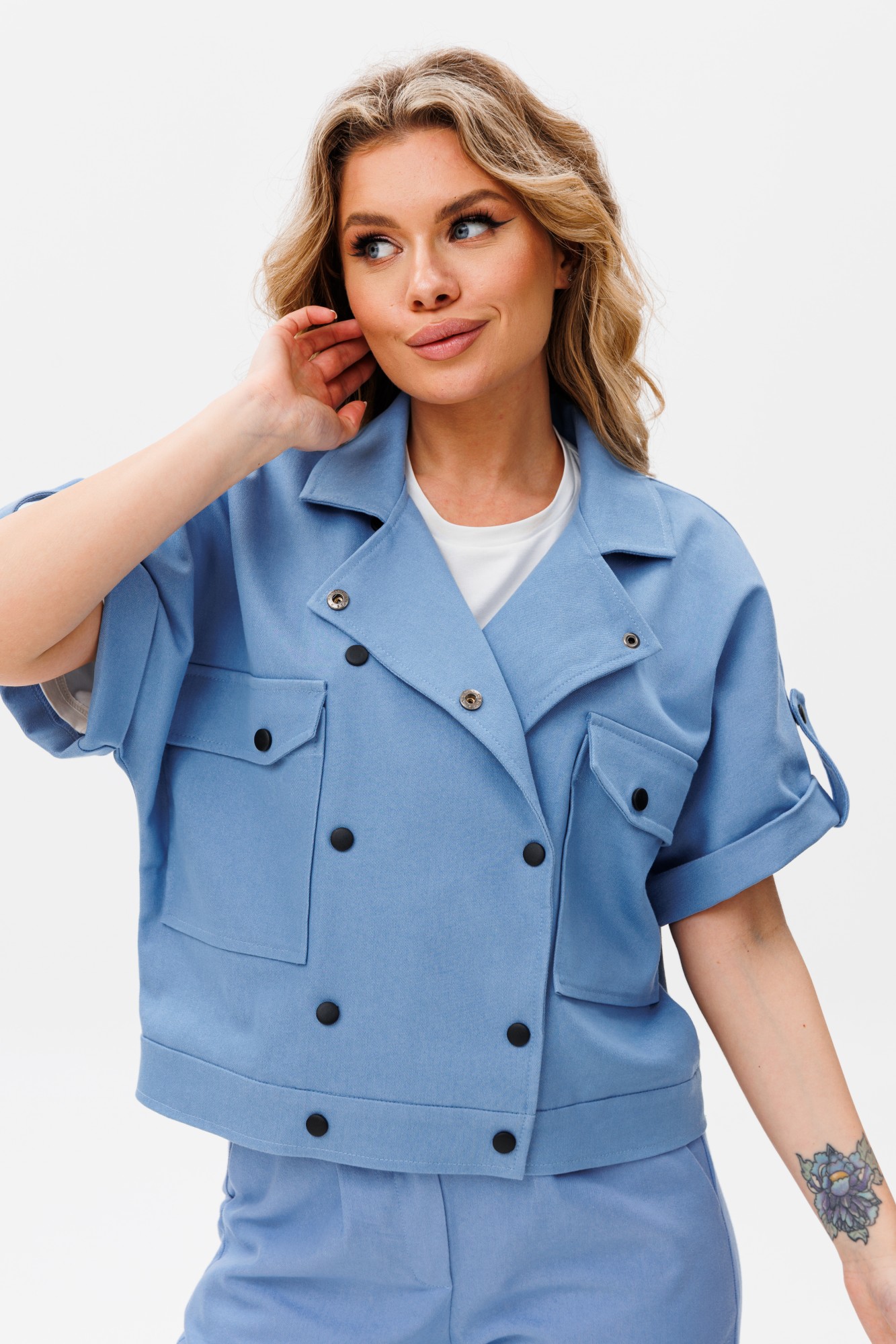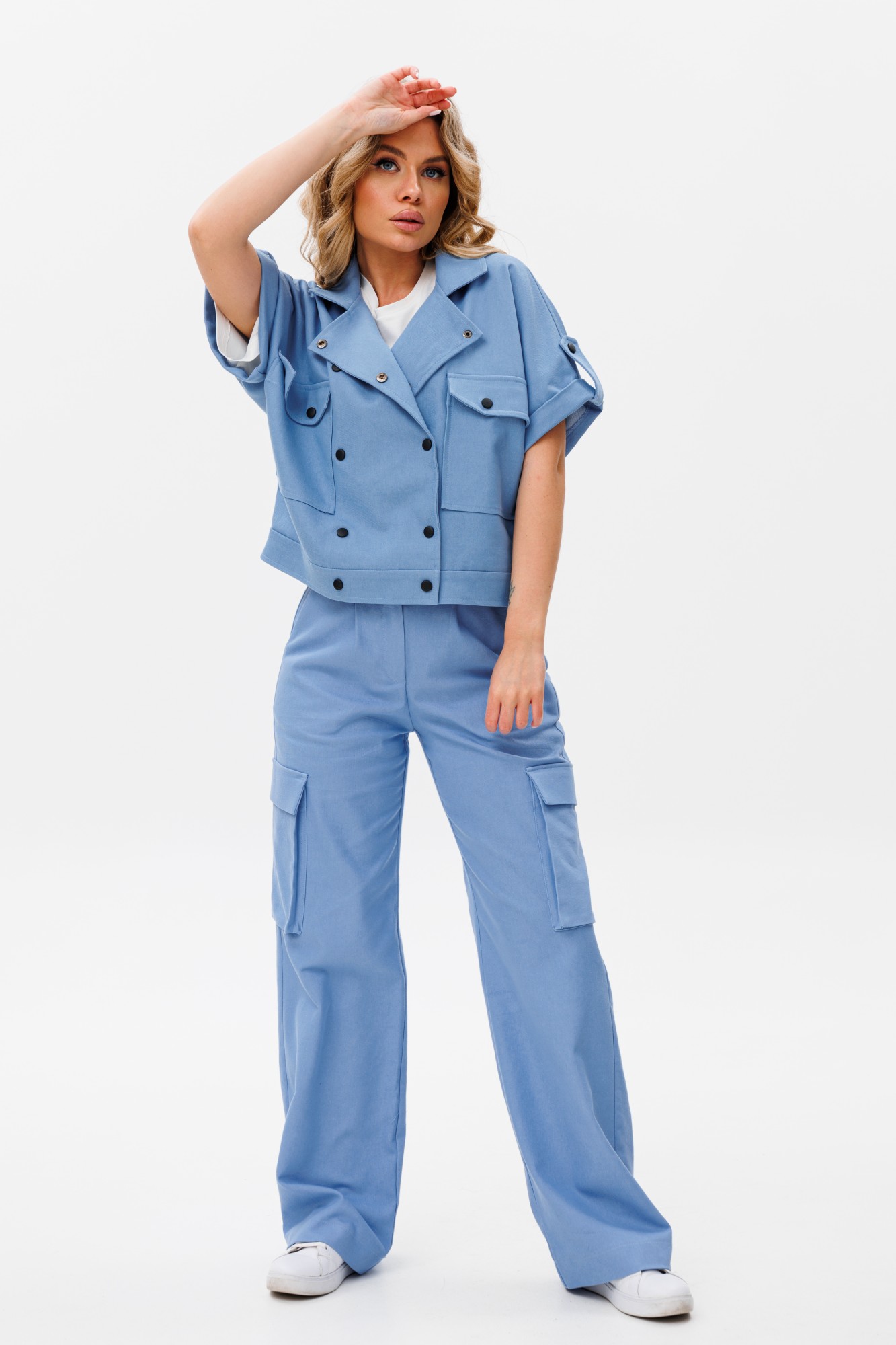 Жакет женский двубортный прямого силуэта с цельнокроеным рукавом. Рукав короткий с отложной манжетой на пате. По переду накладные карманы с клапаном. Спинка со швом. Брюки прямого силуэта, на притачном поясе с застежкой на тесьму-молнию по переду. По боковым угловые карманы. По левому и правому полотнищу брюк накладной карман "Книга" с клапаном