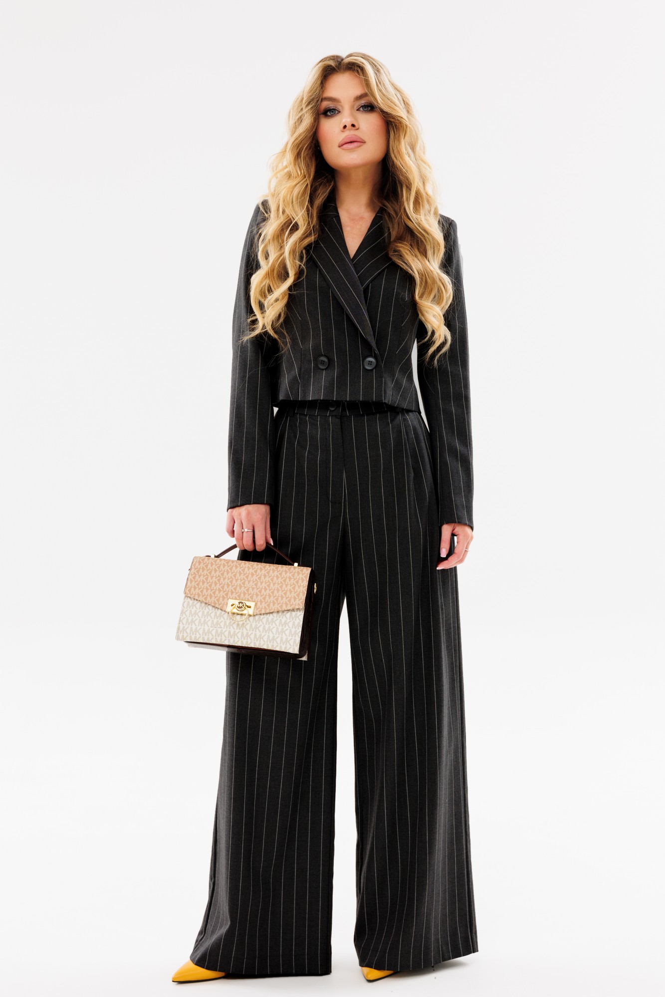 Костюм двухпредметный: состоящий из Жакета и Брюк.Жакет укороченный полуприлегающего силуэта. По переду нагрудная вытачка. Двухбортная застёжка на петли-пуговицы.Жакет на подкладке.Брюки женские,свободного силуэта,на поясе со шлевками.Застежка на молнию и пуговицу.По переду заложены складки.По бокам действующие угловые карманы.185