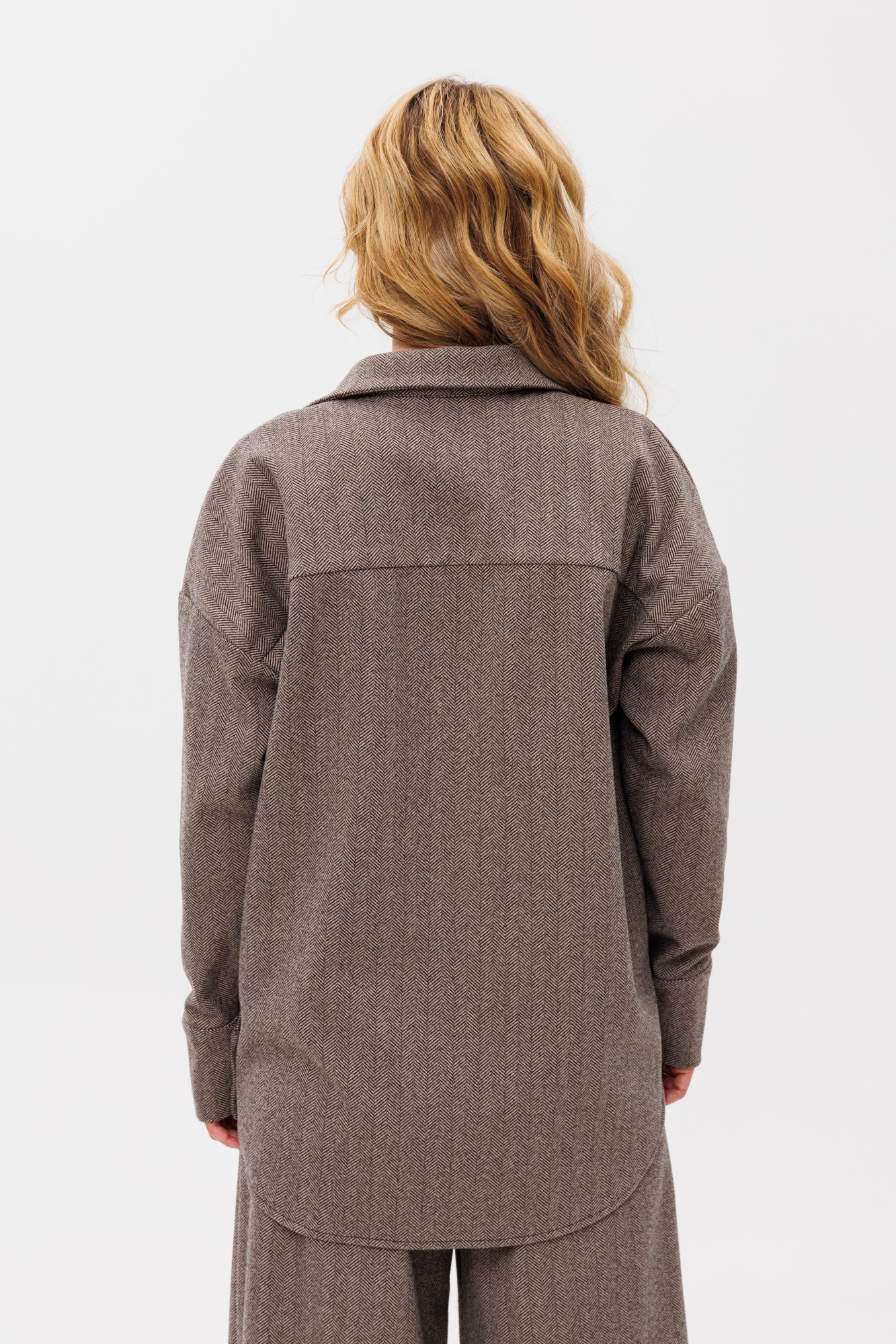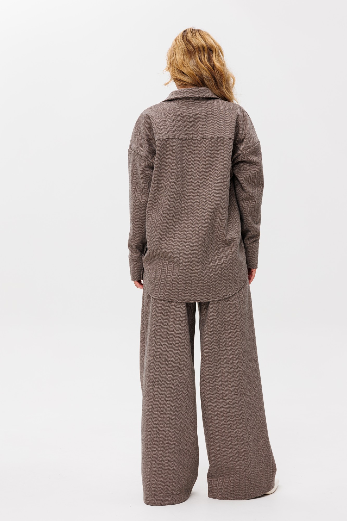 Костюм двойка: Рубашка свободного силуэта, с центрально бортовой застежкой по переду на петли пуговицы. Воротник отложной стойка. По переду на линии груди накладные карманы с клапанами. Спинка на кокетке. Рукав длинный на манжете. Брюки женские, свободного силуэта, на поясе со шлевками. Застежка на молнию и пуговицу. По переду заложены складки. По бокам действующие угловые карманы.