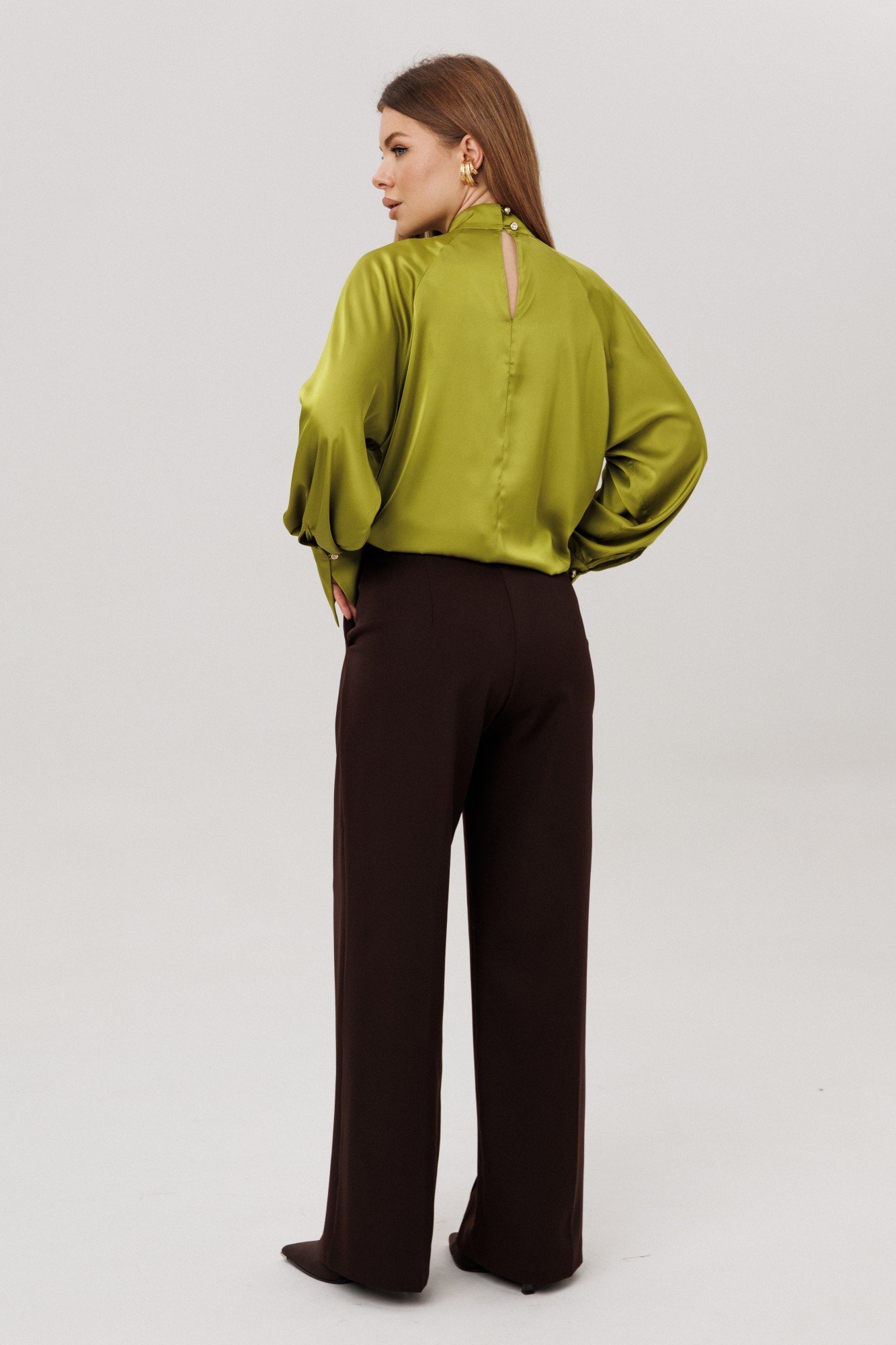 Костюм двухпредметный: Блузка прямого силуэта с акцентными рукавами. По спинке застежка на две петли пуговицы. Рукав покроя реглан. По переду блузки заложены складки. Элегантные женские брюки прямого кроя ,по переду на брючинах стрелки. Модель с высокой посадкой на притачном поясе обеспечивает идеальное прилегание. Спереди расположена практичная застежка на тесьму-молнию, добавляющая удобства при носке. Брюки укомплектованы функциональными боковыми карманами, что придает модели дополнительную практичность и удобство.