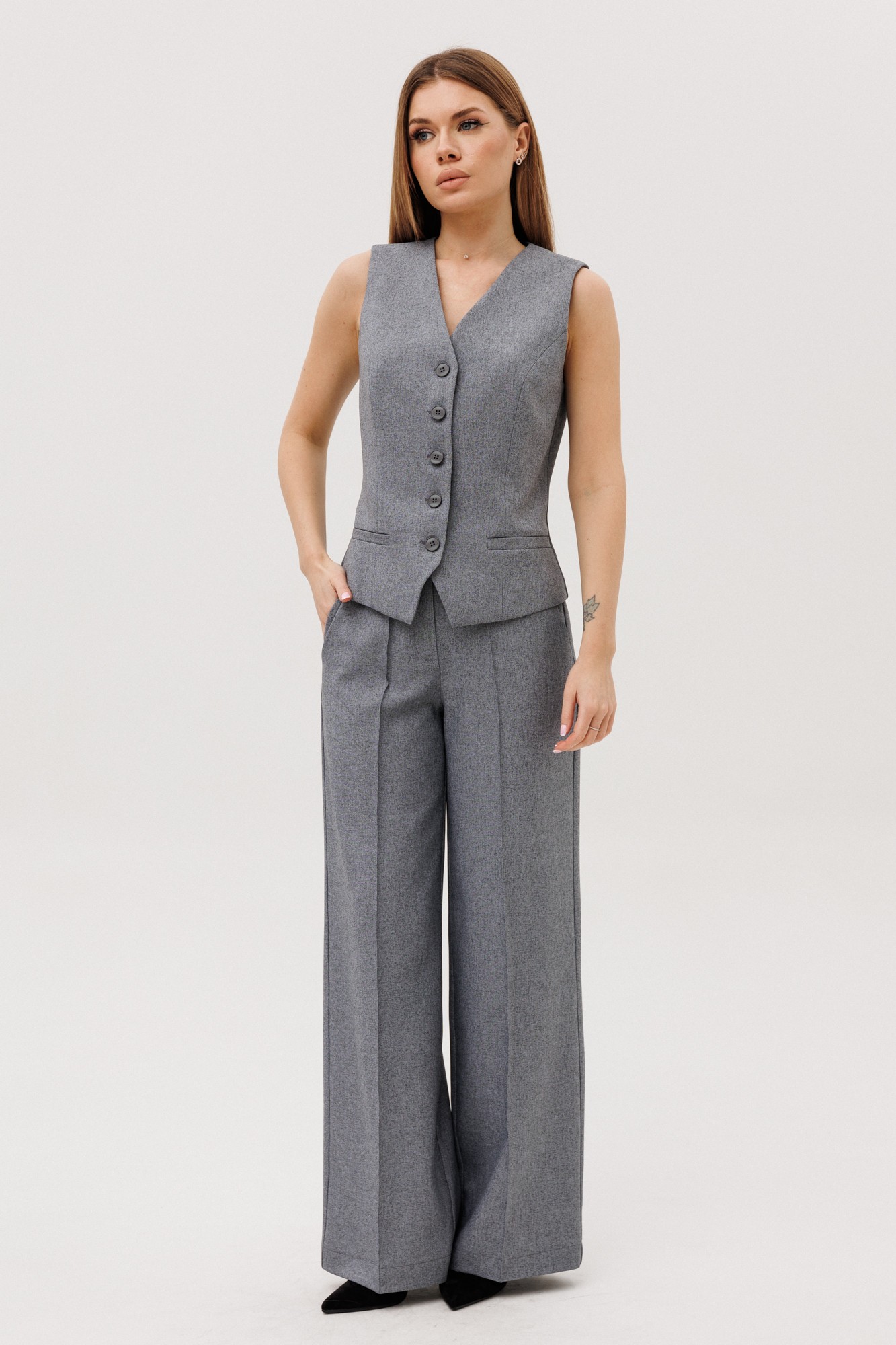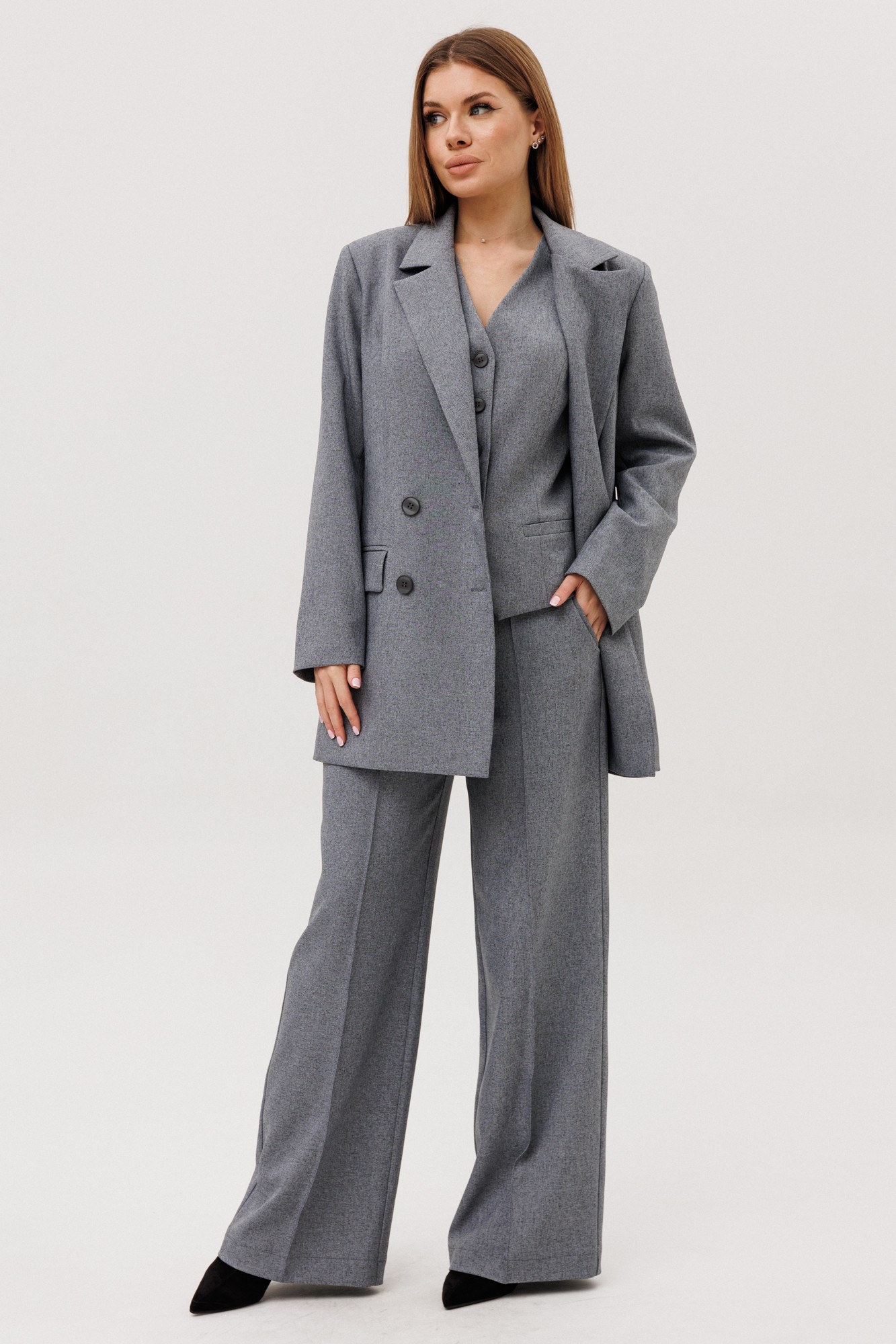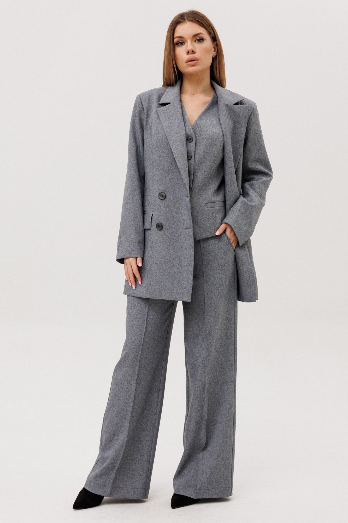 Элегантный трехпредметный брючный костюм идеальное сочетание стиля и комфорта. Жакет прямого силуэта, оснащен двубортной застежкой на петли-пуговицы, что добавляет образу официальности. Детализированный дизайн включает нагрудную вытачку, переходящую в прорезной карман с клапаном на передней части, и фигурный рельеф на спинке с щпицей, обеспечивающий отличную посадку по фигуре. Рукав жакета двухшовный, подчеркивающий линии рук. Жакет на подкладке для дополнительного комфорта. Жилет прилегающего силуэта, с V- образным вырезом, на подкладке. По переду рельефа карманы ""листочки"", застёжка на петли-пуговицы. По спинке вытачки Брюки прямого кроя с высокой посадкой на притачном поясе, застежка на тесьму-молнию гарантирует удобство при носке. Удобные боковые карманы повышают функциональность изделия. Модель выполнена из качественного тканевого материала, который хорошо держит форму и подходит для деловых встреч, официальных мероприятий или повседневной носки в офисе. Этот костюм — прекрасный выбор для женщин, ценящих в одежде универсальность и изысканность.