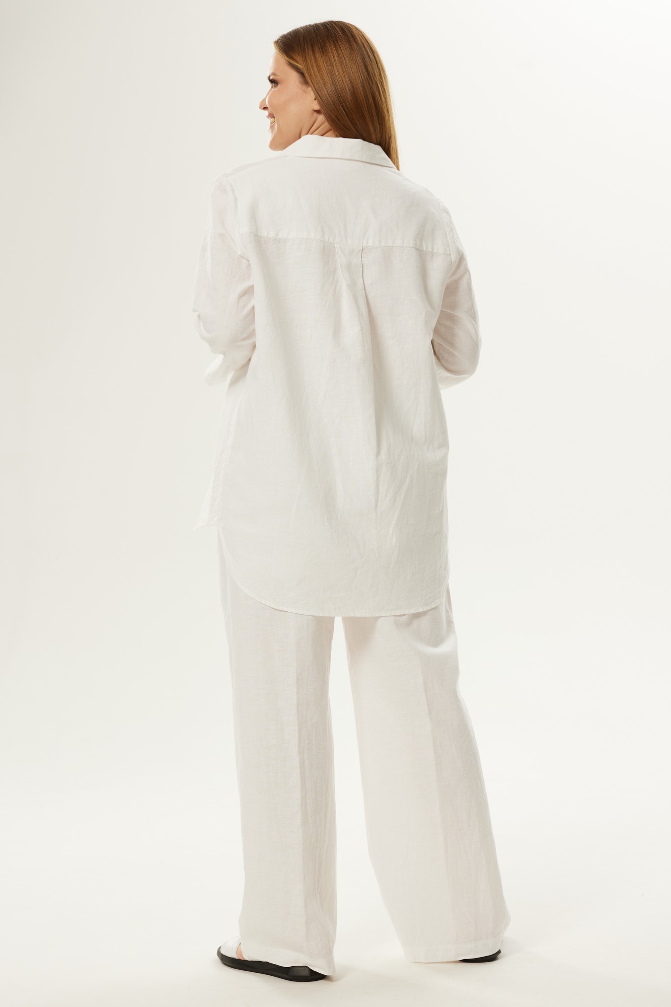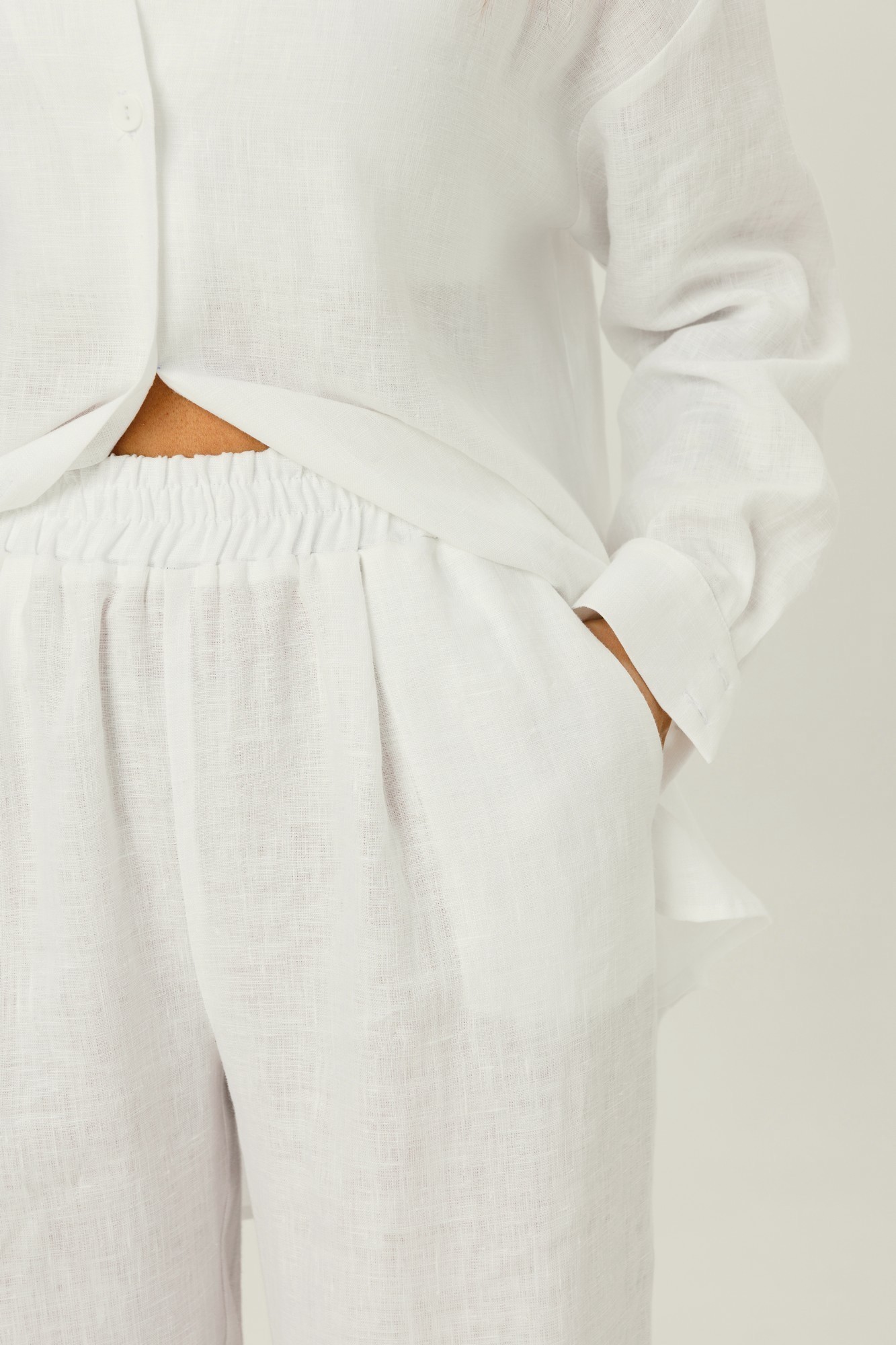 Стильный льняной oversize-костюм AMIE в свободном стиле, состоящий из рубашки и брюк. Рубашка свободного силуэта. Полочка с нагрудной вытачкой, идущей из бокового шва. Застежка на фигурную планку на петли и пуговицы. Горловина с отложным воротником на полустойке. Рукав втачной, длиной 7/8, низ рукава прямой. Спинка с кокеткой и бантовой вертикальной складкой. Низ фигурный с удлиненной спинкой. Длина изделия 85 см, длина рукава 55 см. Брюки-палаццо. Пояс притачной на резинке. Передняя половинка брюк с функциональными карманами с диагональным входом. Длина по боковому шву 114 см. Костюм выполнен из качественного белорусского льняного полотна (пр-во Орша). Ткань не тянется. В больших размерах костюм представлен в нашей линейке MaCherie (модель 3161)/ Идеальный стильный образ для прогулки на свежем воздухе с друзьями. Рубашку и брюки можно приобрести раздельно. Модели 6007 и 7000 соответственно.