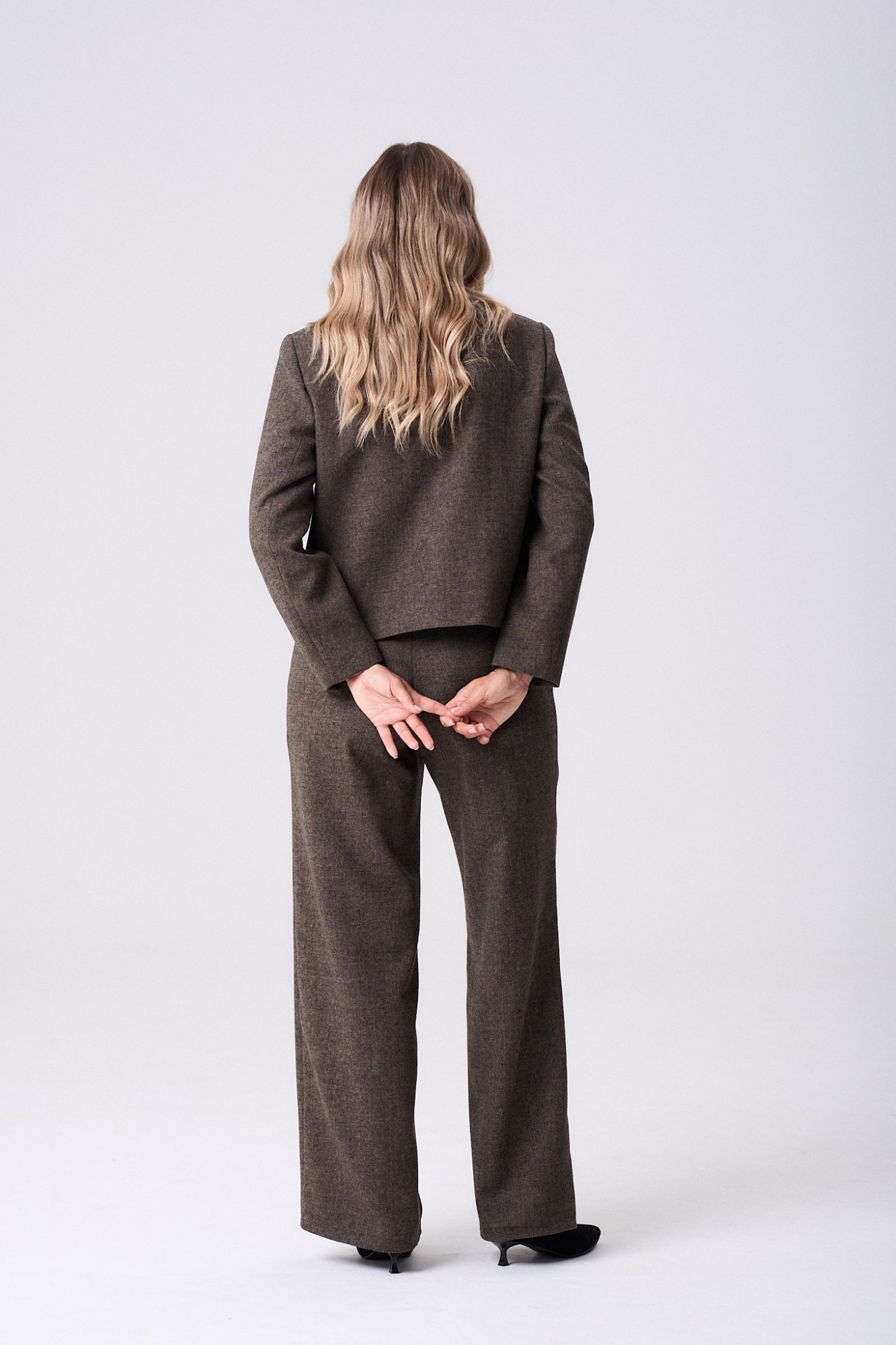 Костюм женский из костюмной ткани состоящий из жакета полуприлегающего силуэта на подкладки и брюк классического прямого кроя. Жакет с круглой горловиной и центральной застёжкой на петли и декоративные пуговицы. По полочке обработана нагрудная вытачка, в области груди настрочен клапан, закрепленный пуговицей. Спинка цельнокроеная. Рукав втачной двухшовный, длинный. Брюки прямого силуэта в боковых швах обработаны карманы. Верхний срез обработан притачным поясом со шлёвками для ремня, по задним половинкам для лучшей посадки вставлена резинка, застегивающийся на петлю и пуговицу, застёжка центральна с гульфиком и откоском на тесьму молнию.
