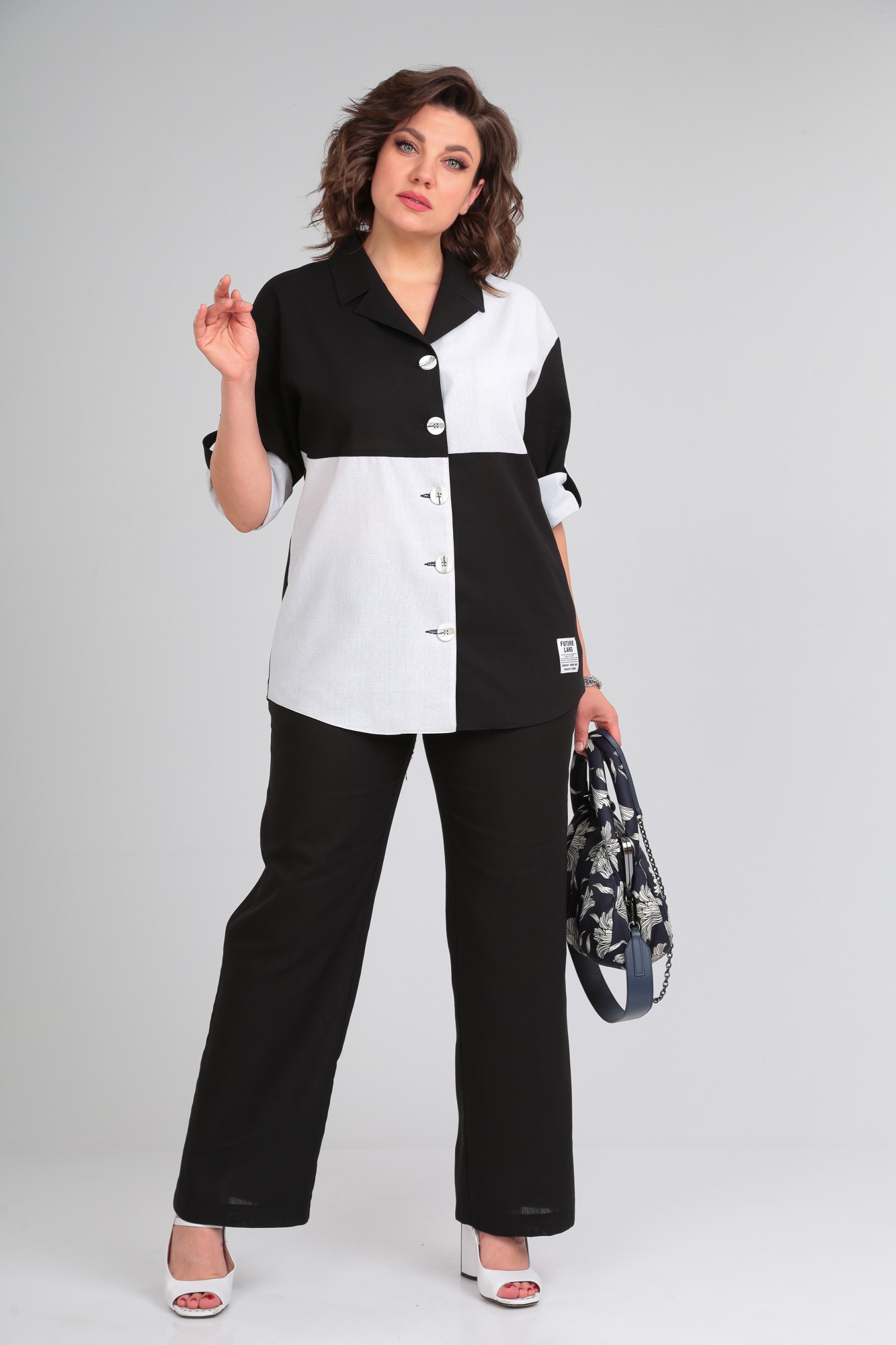 Комплект женский 2-х предметный (жакет, брюки). Жакет прямого силуэта, на застежку петли и пуговицы. Воротник пиджачного типа, по полочке идут подрезы в шахматном порядке. Плечо спущенное, рукав 3/4 длины, с отложной манжетой которая фиксируется патой. Низ фигурный. Брюки прямые, пояс на резинке, по бокам карманы. Комплект свободный, удобный, из натуральных тканей.