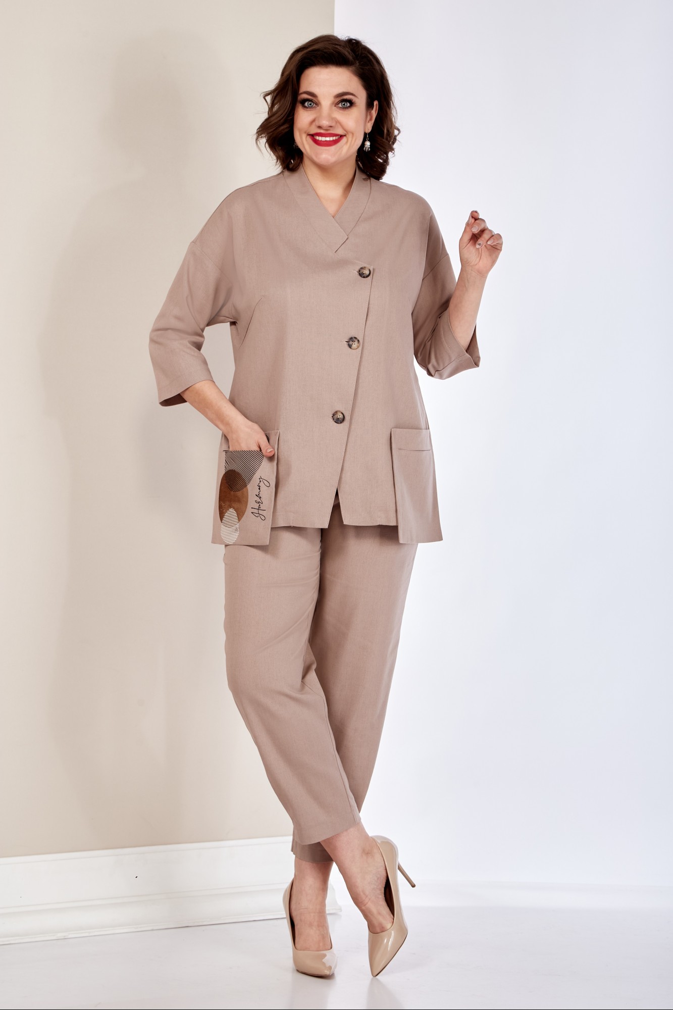 Комплект женский 2-хпредметный (жакет и брюки). Жакет из текстильной ткани прямого силуэта со спущенным плечом. По полочке идут грудовые выточки из бокового шва. Застежка ассиметричная. Воротник стойка. По спинке встречная складка. Рукав 3/4. По полочке идут отлетные накладные карманы с декором (термонаклейка). Брюки прямые, зауженные к низу за счет защипов. Пояс на резинке, по бокам карманы.