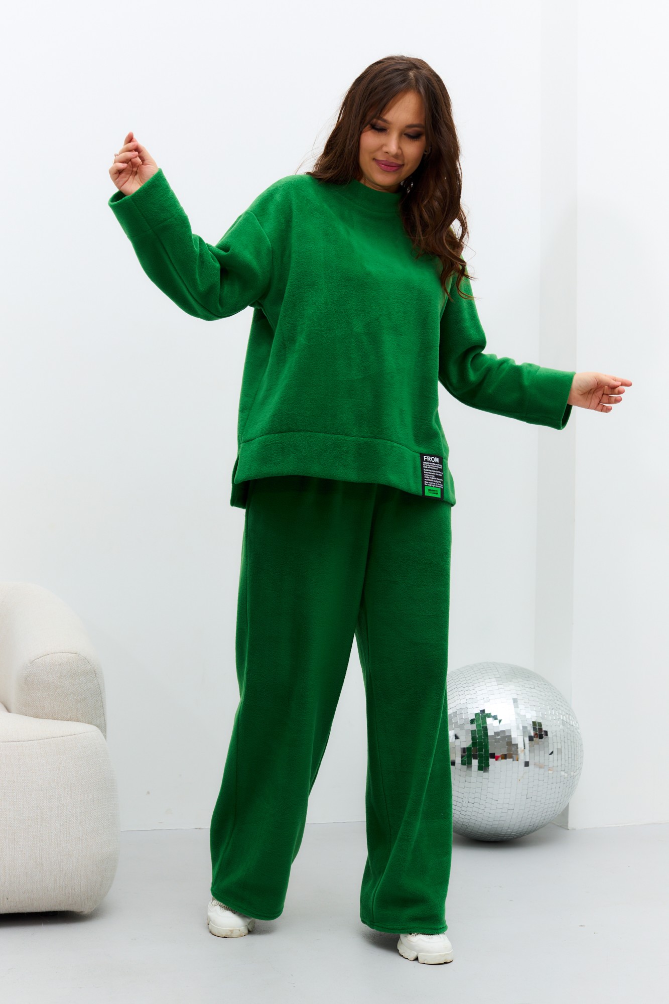 Комплект женский 2-х предметный ( джемпер, брюки) из флисовой ткани "OVERSIZE". Джемпер прямого силуэта со спущенным плечом, по бокам разрезы, по горловине - стойка, спинка длиннее полочки. Низ рукава можно отвернуть как манжету. По низу джемпера идет декоративная нашивка. Брюки прямые, по бокам карманы, пояс на резине. Длина спинки: (46-50)-68 см., (52-56)-71 см. Длина рукава: (46-50)-50 см., (52-56)-51 см., Длина брюк: (46-50) - 104 см, (52-56) - 107 см