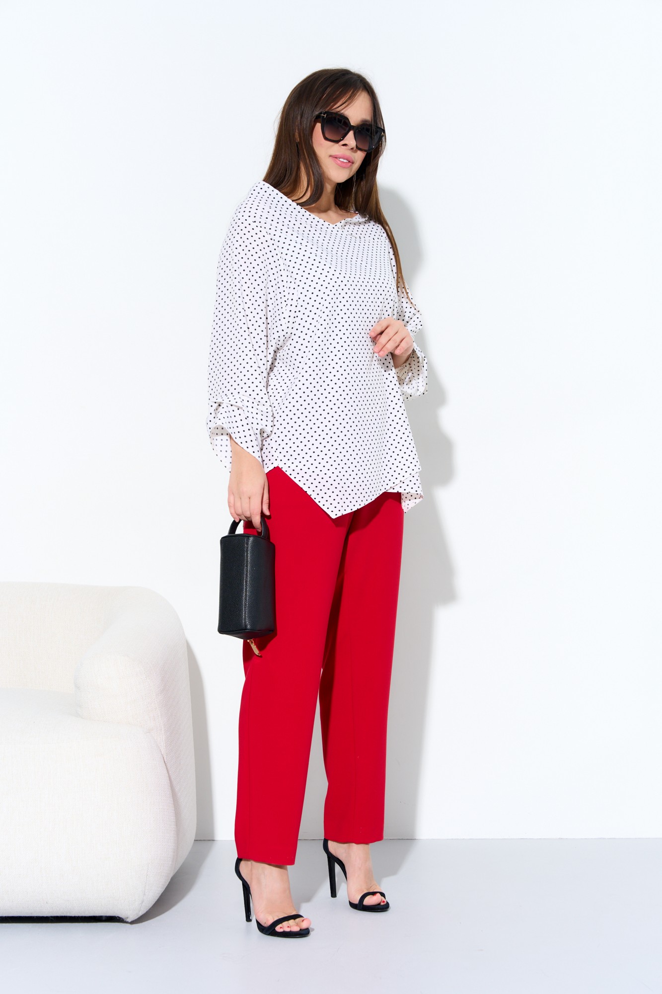 Комплект женский 2-х предметный (блузка, брюки). Блузка из текстильной, блузочной ткани. Модель прямого силуэта, рукав углублённый , рубашечного типа. Перед идет с запахом, низ блузы ассиметричный, по полочке углы, спинка закруглённая, удлинённая. По рукаву идут защипы. По горловине полочки пришит логотип бренда. Брюки зауженные к низу, пояс на резинке, по бокам карманы. Длина по спинке: 82 см. Длина рукава: 47 см. Длина брюк: 97см.