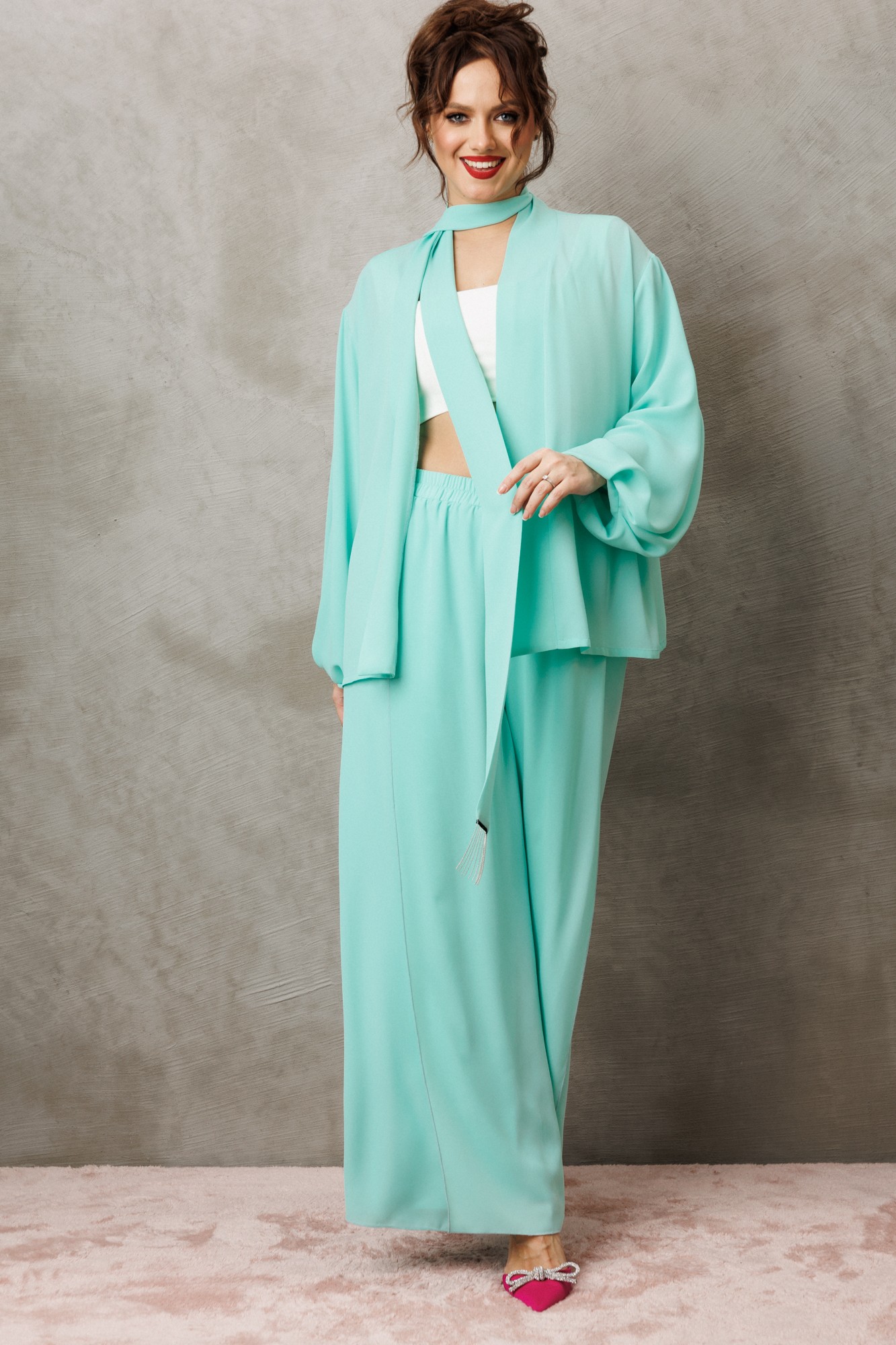 Элегантный вечерний костюм-двойка, состоящий из блузки свободного кроя и широких брюк. Красивый и эффектный брючный костюм - это идеальный образ для особых случаев, вечерних выходов, праздничных и торжественных мероприятий, будь то корпоратив, свадьба, юбилей, выпускной, день рождения, Новый год Блузка прямого силуэта со пущенной линией плеча. Рукав двойной, расширенный к низу со складками. По спинке и полочке идет планка. В комплекте с блузкой идет съемный пояс. На концах пояса металлизированная бахрома. Брюки прямые с запахом по переду, пояс на резинке. Благодаря фасону и крою, костюм визуально вытянет силуэт, сделает фигуру стройнее, подчеркнет ее достоинства, скроет недостатки. Элегантный брючный костюм от Anastasia- комфорт и уверенность в себе на любом мероприятии.