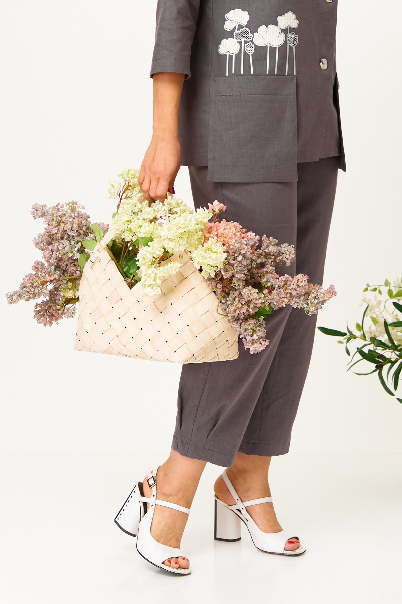 Женский брючный костюм из премиального льна — это идеальное сочетание стиля, комфорта и универсальности, которое станет вашим верным спутником как на деловых встречах, так и при повседневной носке. Изготовленный из высококачественной ткани, этот костюм обеспечивает легкость и приятные ощущения при носке. Костюм женский 2-хпредметный (жакет и брюки). Жакет из текстильной ткани прямого силуэта со спущенным плечом. По полочке идут грудовые выточки из бокового шва. Застежка ассиметричная. Воротник стойка. По спинке встречная складка. Рукав 3/4. По полочке идут отлетные накладные карманы. В качестве декора- термонаклейка. Брюки прямые, зауженные к низу за счет защипов. Пояс на резинке, по бокам карманы.