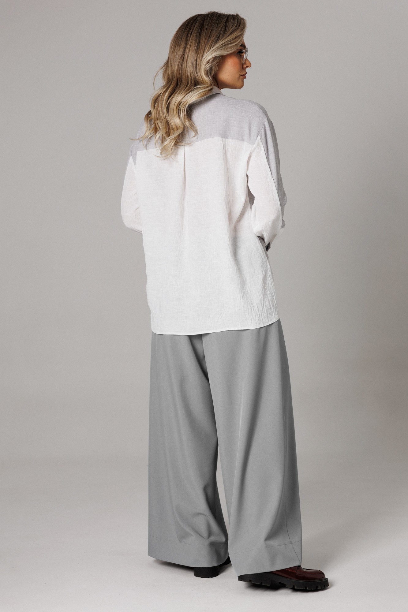 Комплект из костюмной ткани создан для тех, кто ценит комфорт и элегантность в каждой детали. В комплект входит блузка и штаны палаццо. Оверсайз крой придаёт костюму особый шарм и дает свободу движений. Высокая посадка и резинка по поясу подчёркивает талию и делает силуэт более изящным. Благодаря свободному крою костюм подойдёт для разных типов фигуры. Он подчеркнёт вашу индивидуальность. Блузка прямого силуэта, застежка на планку и пуговицы. Воротник на отрезной стойке. По полочке идет ассиметричный подрез со вставками из 2-х видов однотона и разрезом. Плечо спущенное, рукав длинный со вставками, на манжете. По спинке идет кокетка и встречная складка. Брюки палаццо, прямые с односторонней складкой и запахом по центру. По низу брюк широкая подгибка. Пояс на резинке. В качестве декора- брендированная металлическая нашивка по подрезу полочке.
