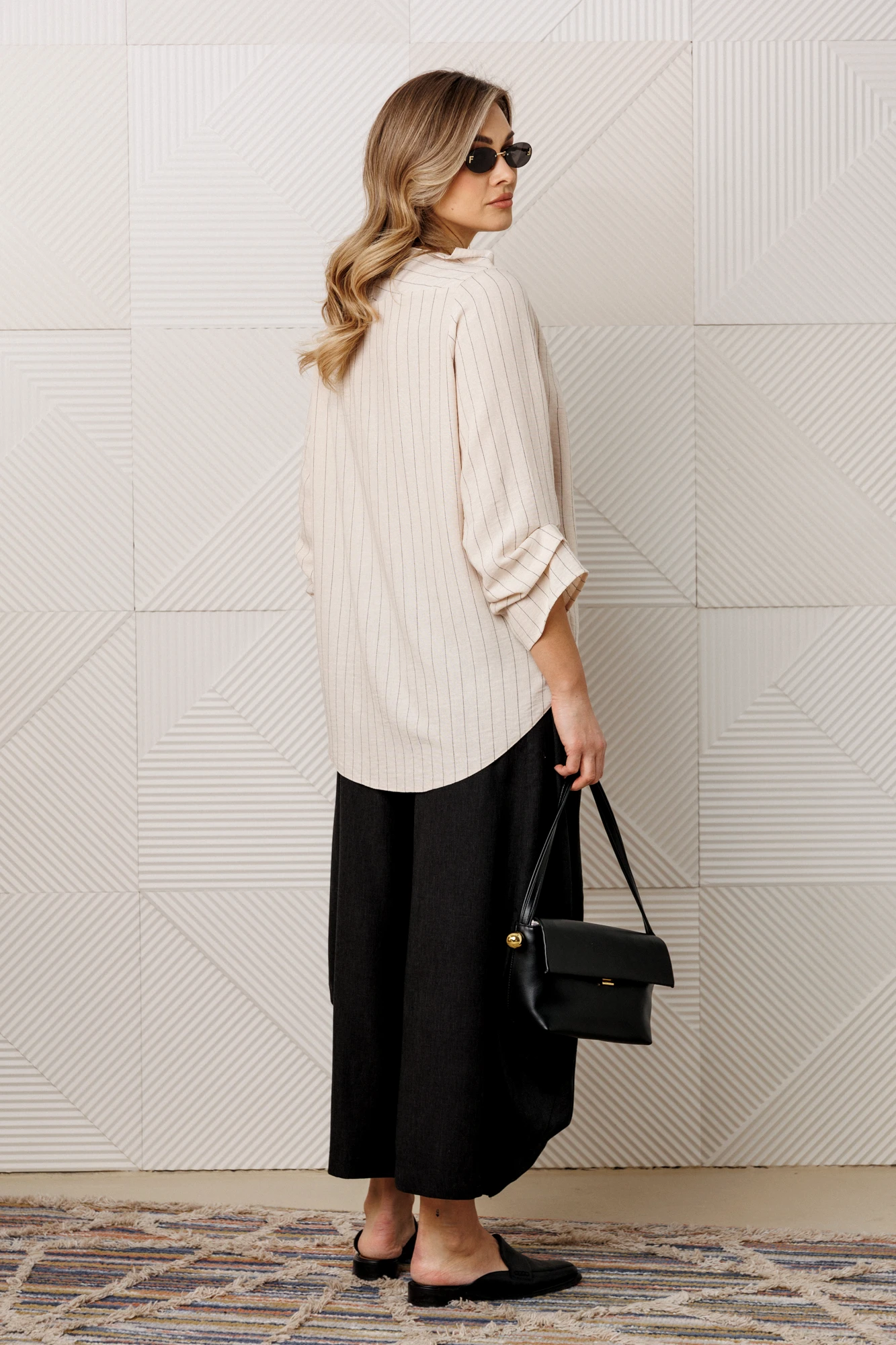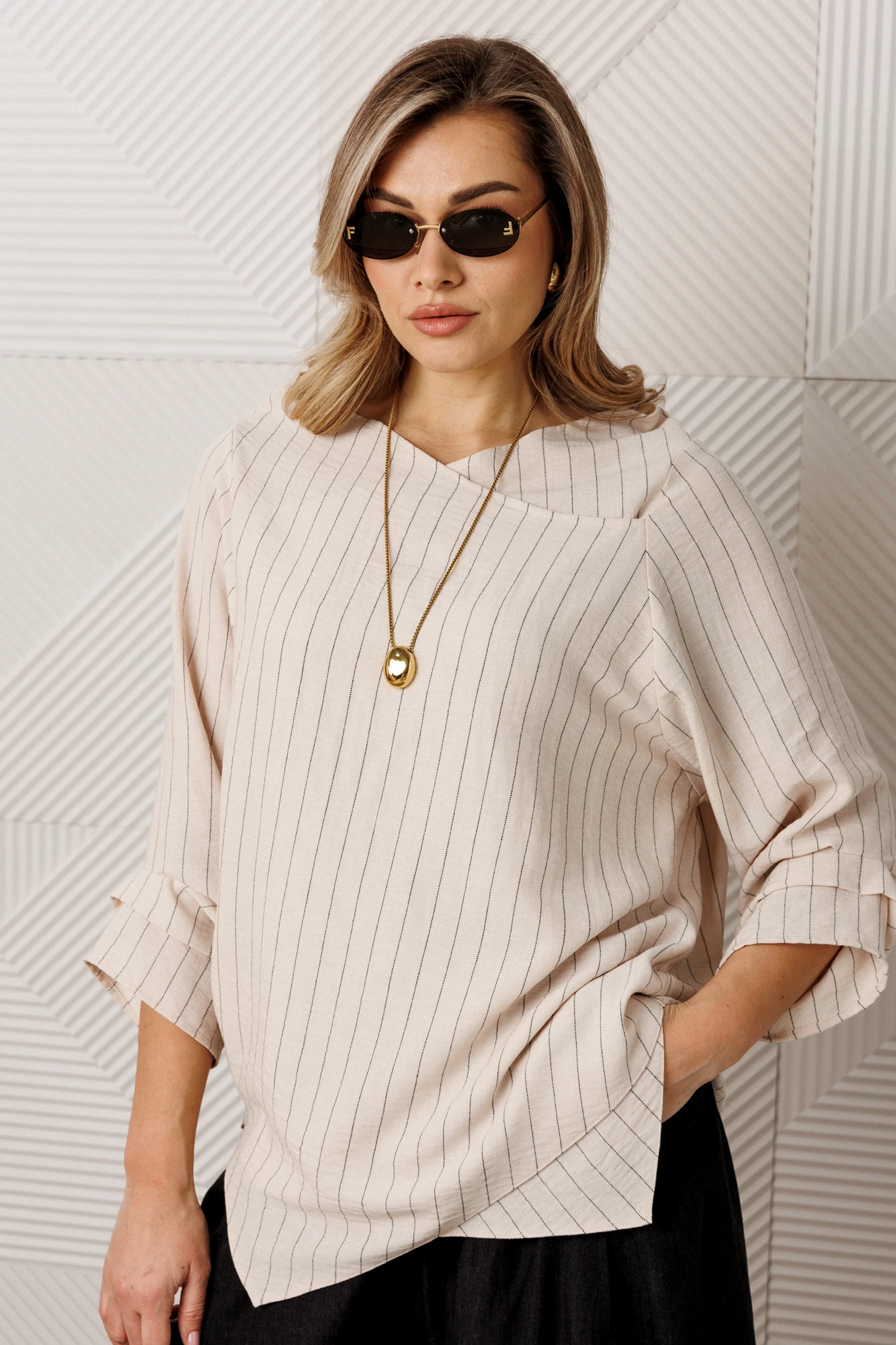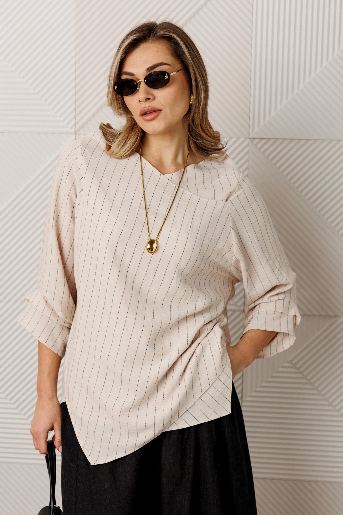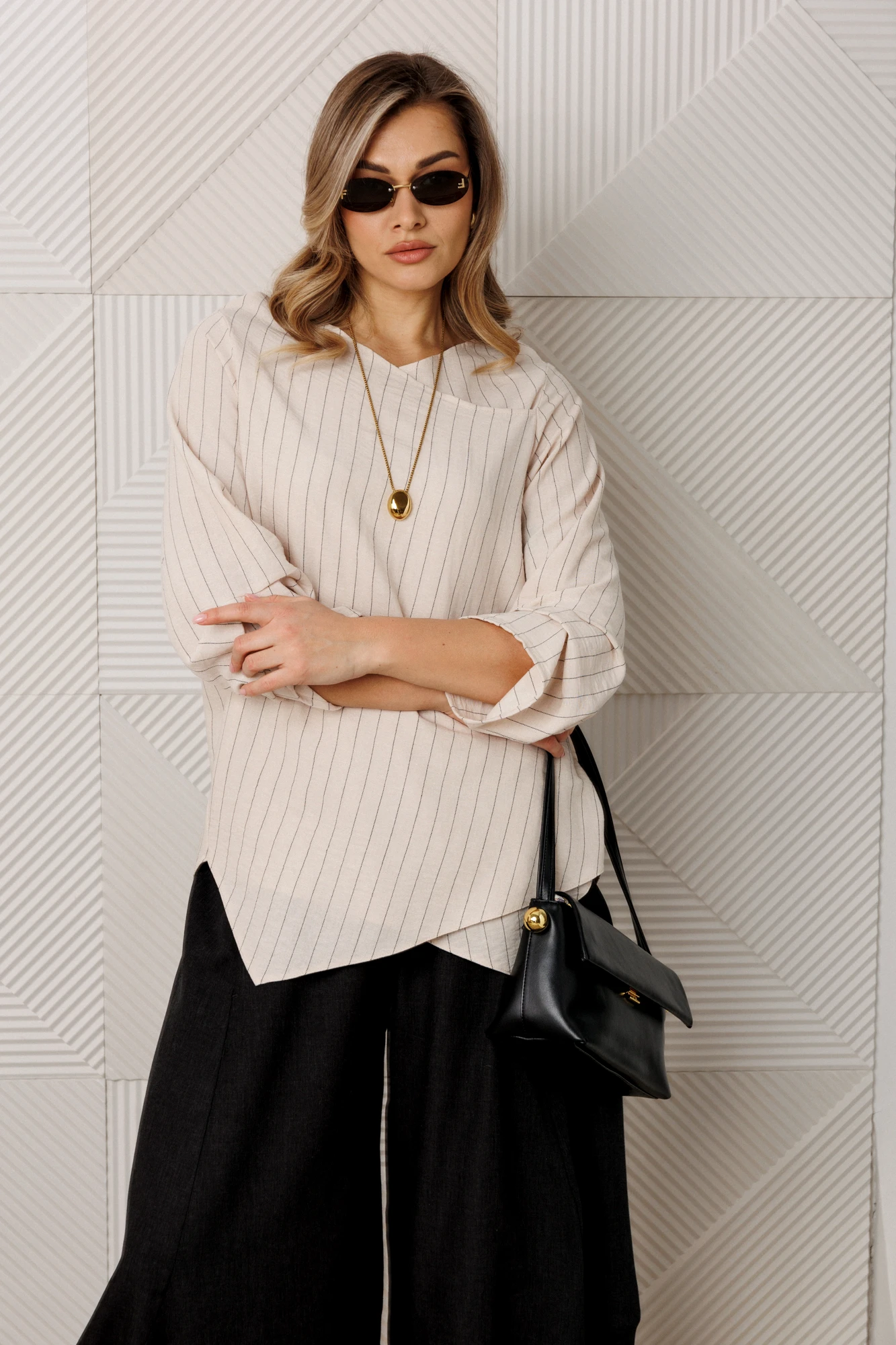 Блузка: Полиэстр-45%, вискоза-44%, хлопок-8%, лен-3%, брюки: полиэстер -75%, лен-15%, хлопок-10%