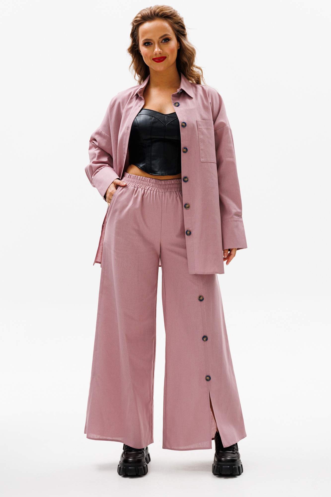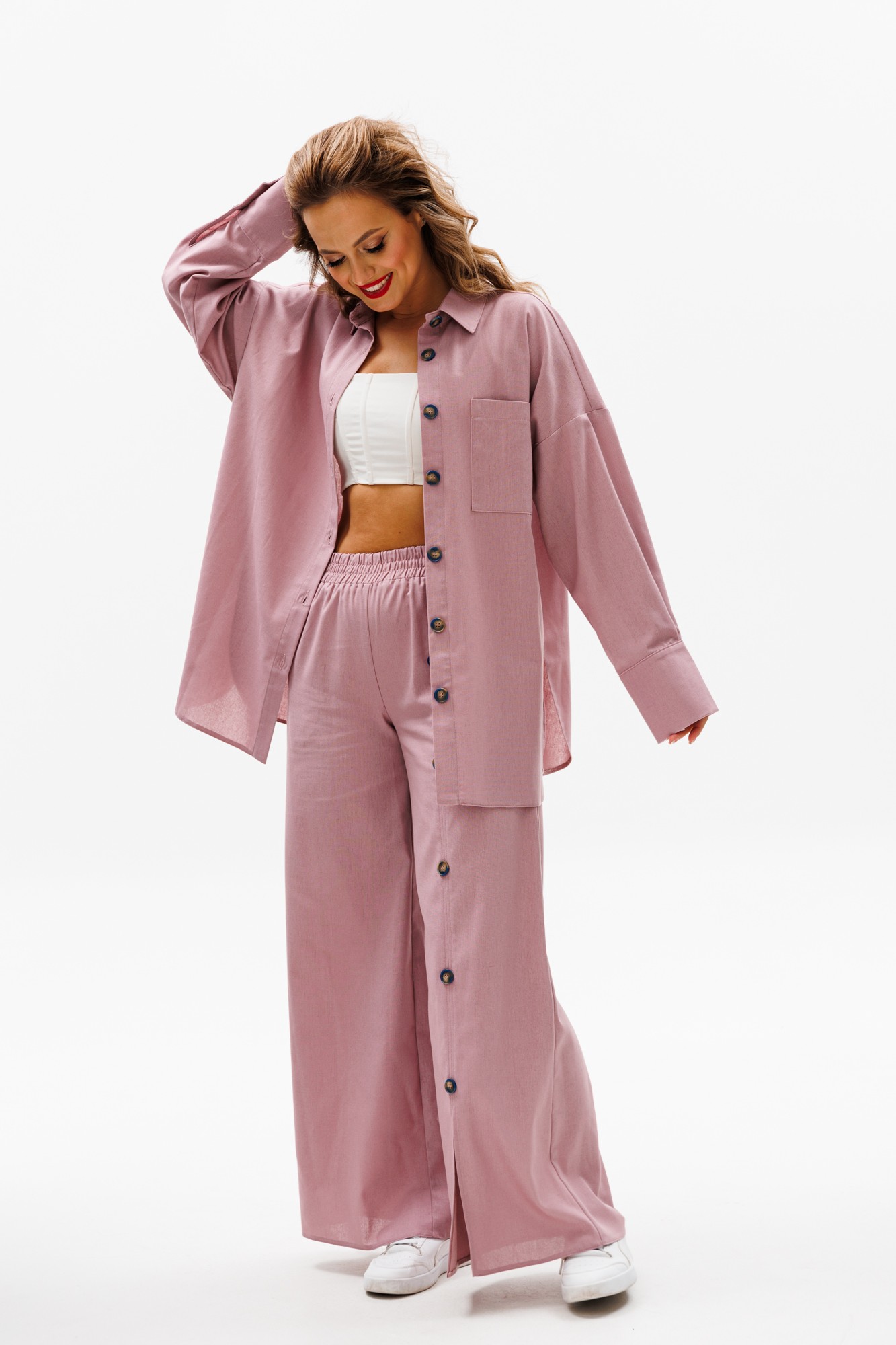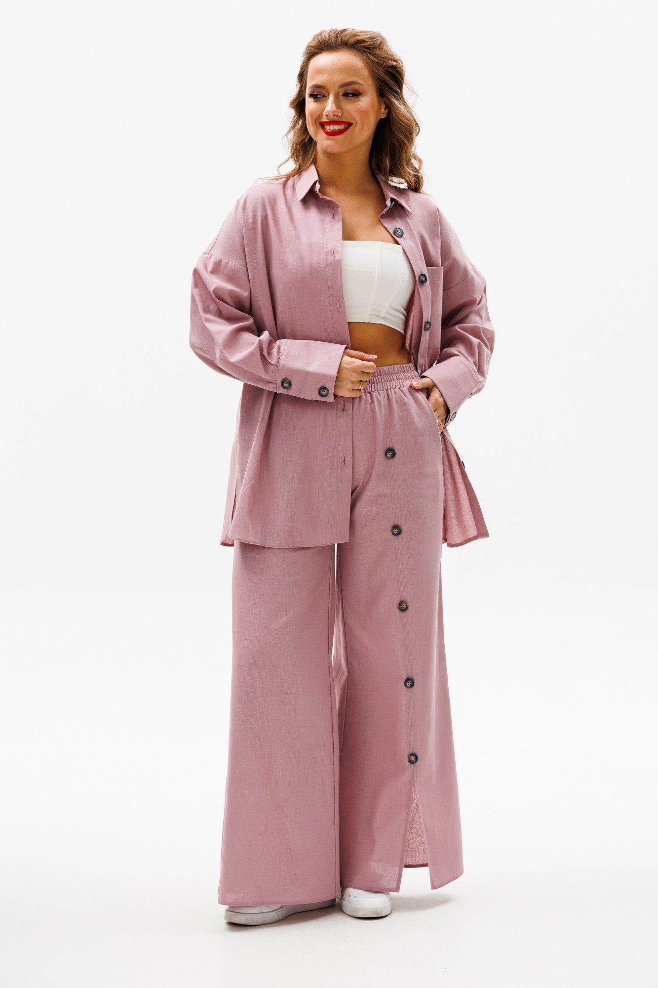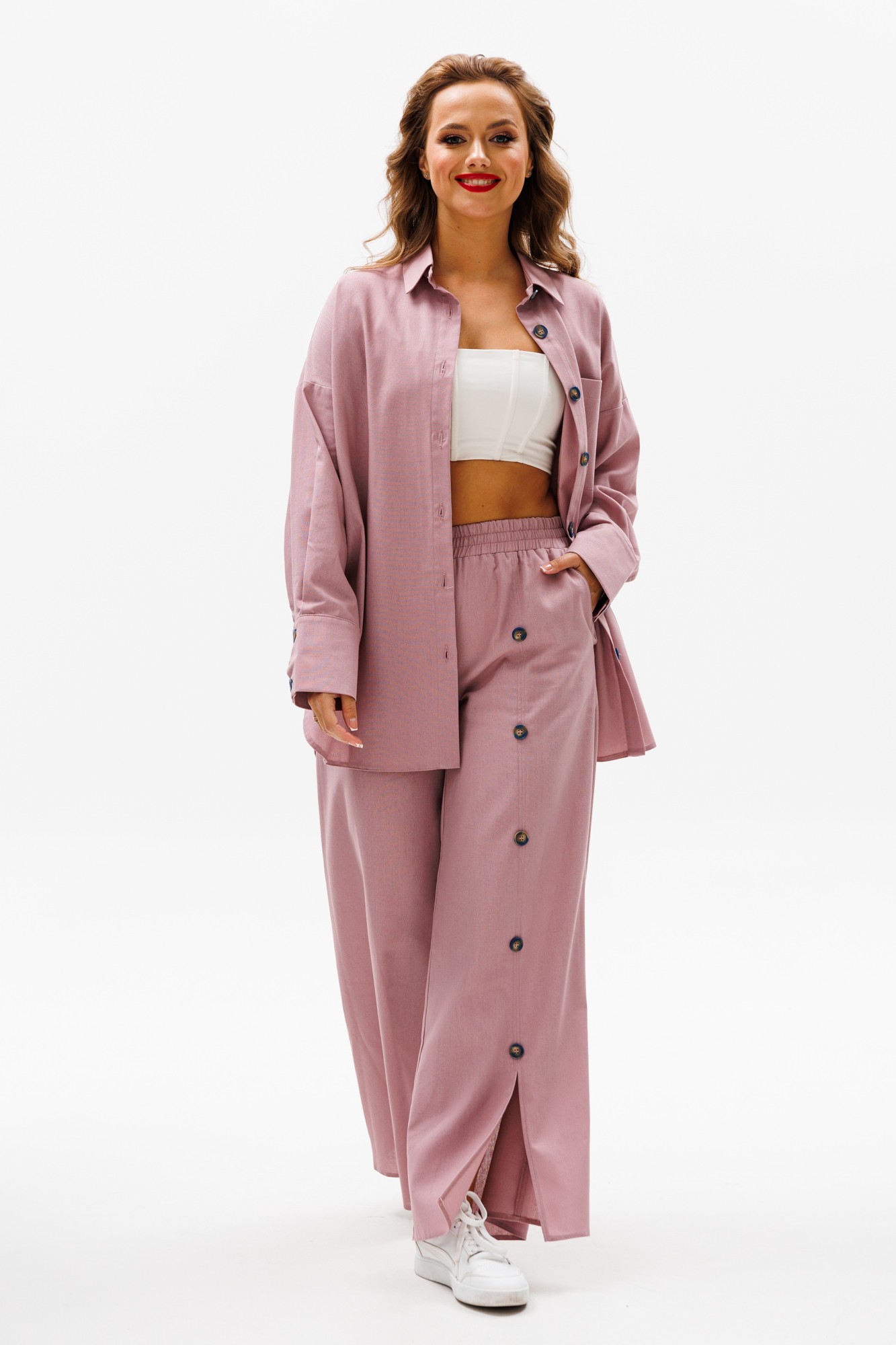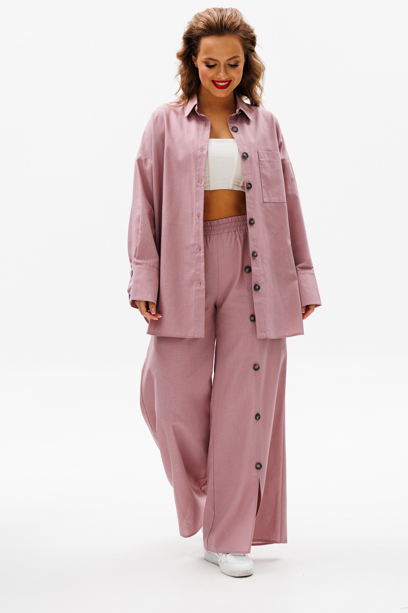 Комплект женский 2-х предметный ( блуза, брюки) из текстильной ткани. Блуза прямого силуэта со спущенным плечом. Рукав на высокой манжете, застежка на планку и пуговицы, воротник на стойке, по бокам разрезы и закругленные низа. С левой стороны полочки накладной карман. По спинке идет встречная складка. Брюки немного расширенные к низу от бедра, по передней части брюк с левой стороны идет разрез и пуговицы. Пояс на резинке, по бокам карманы.