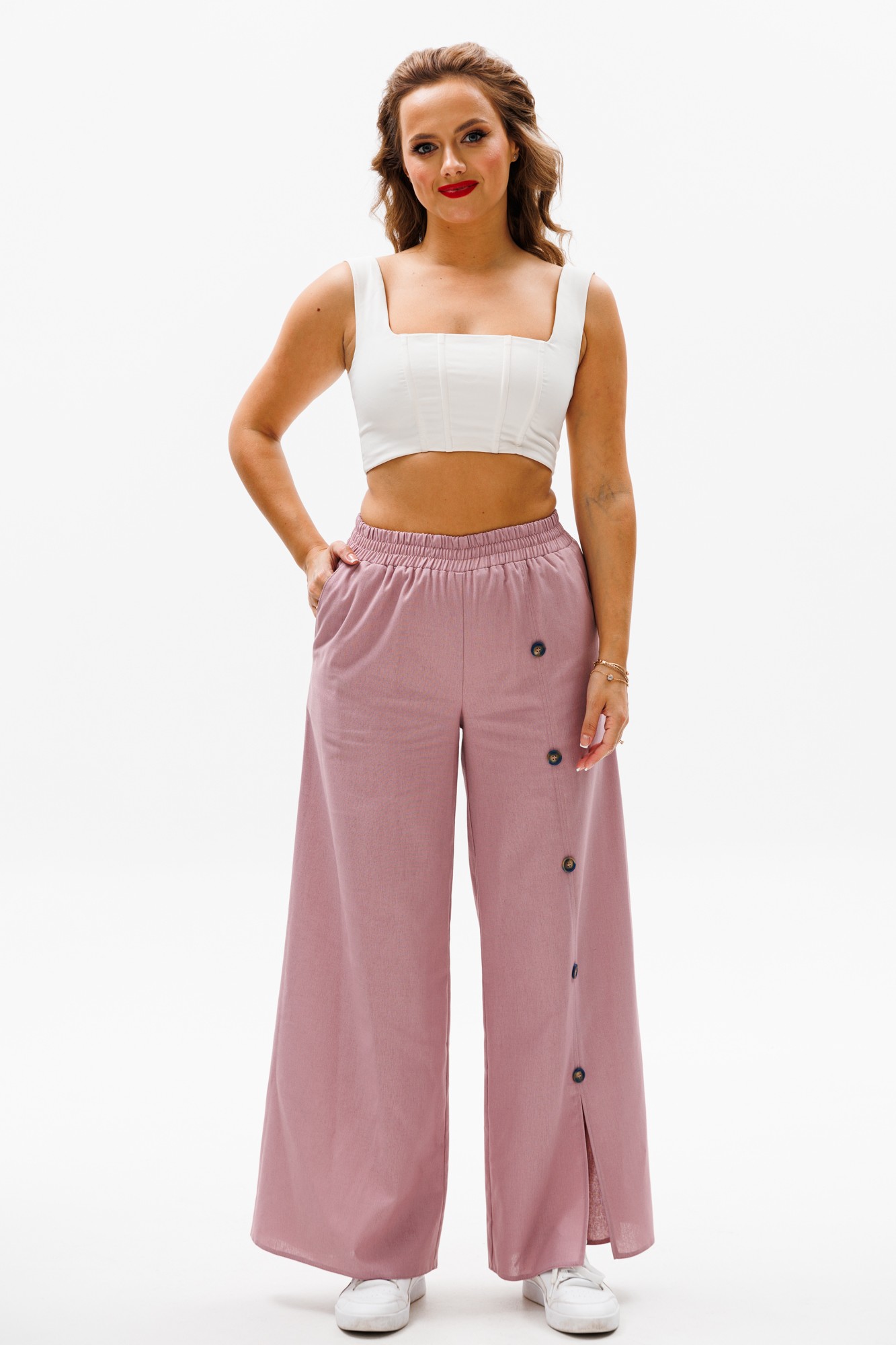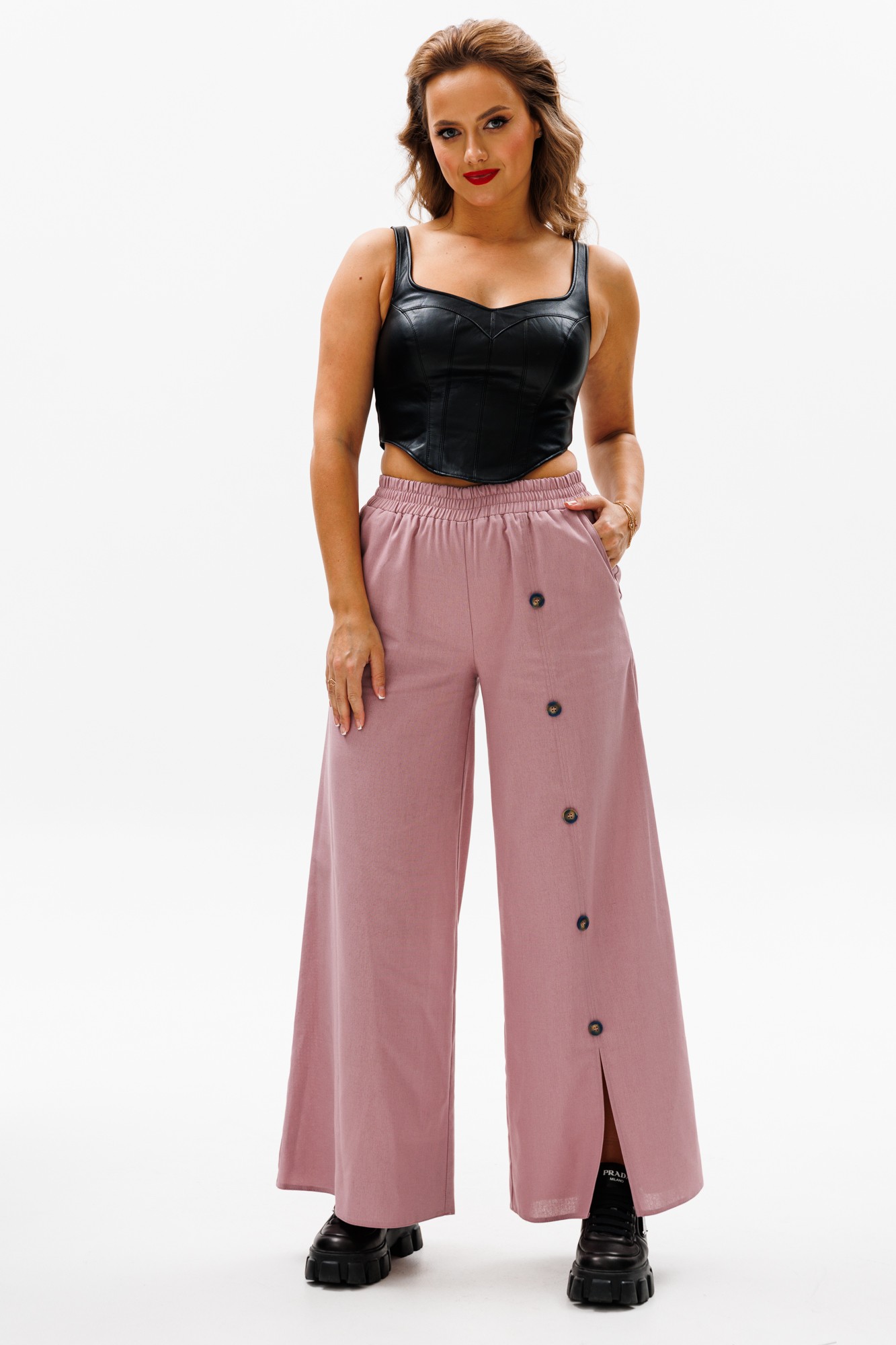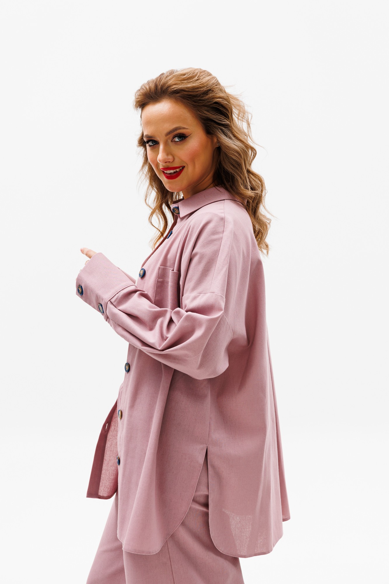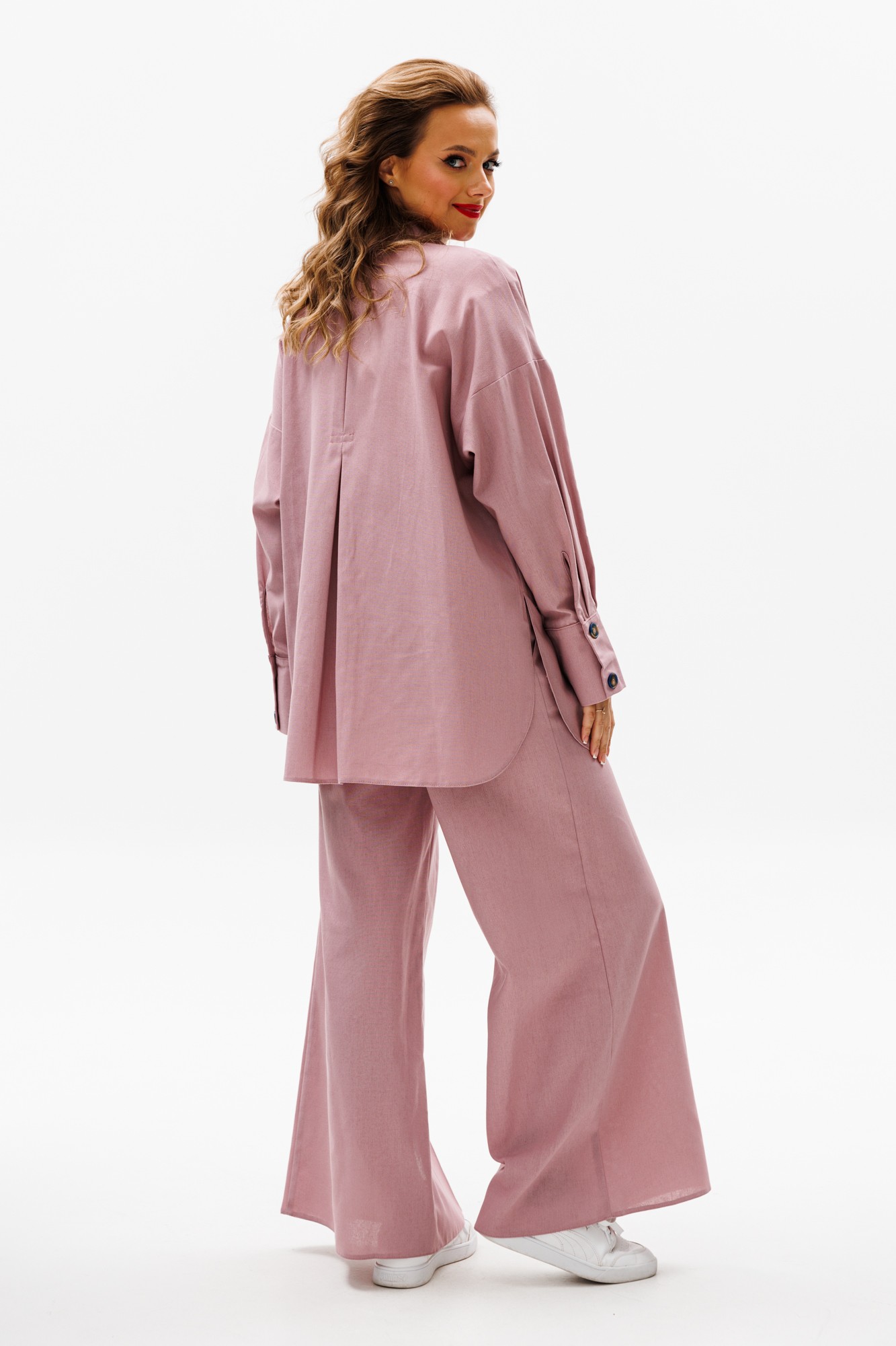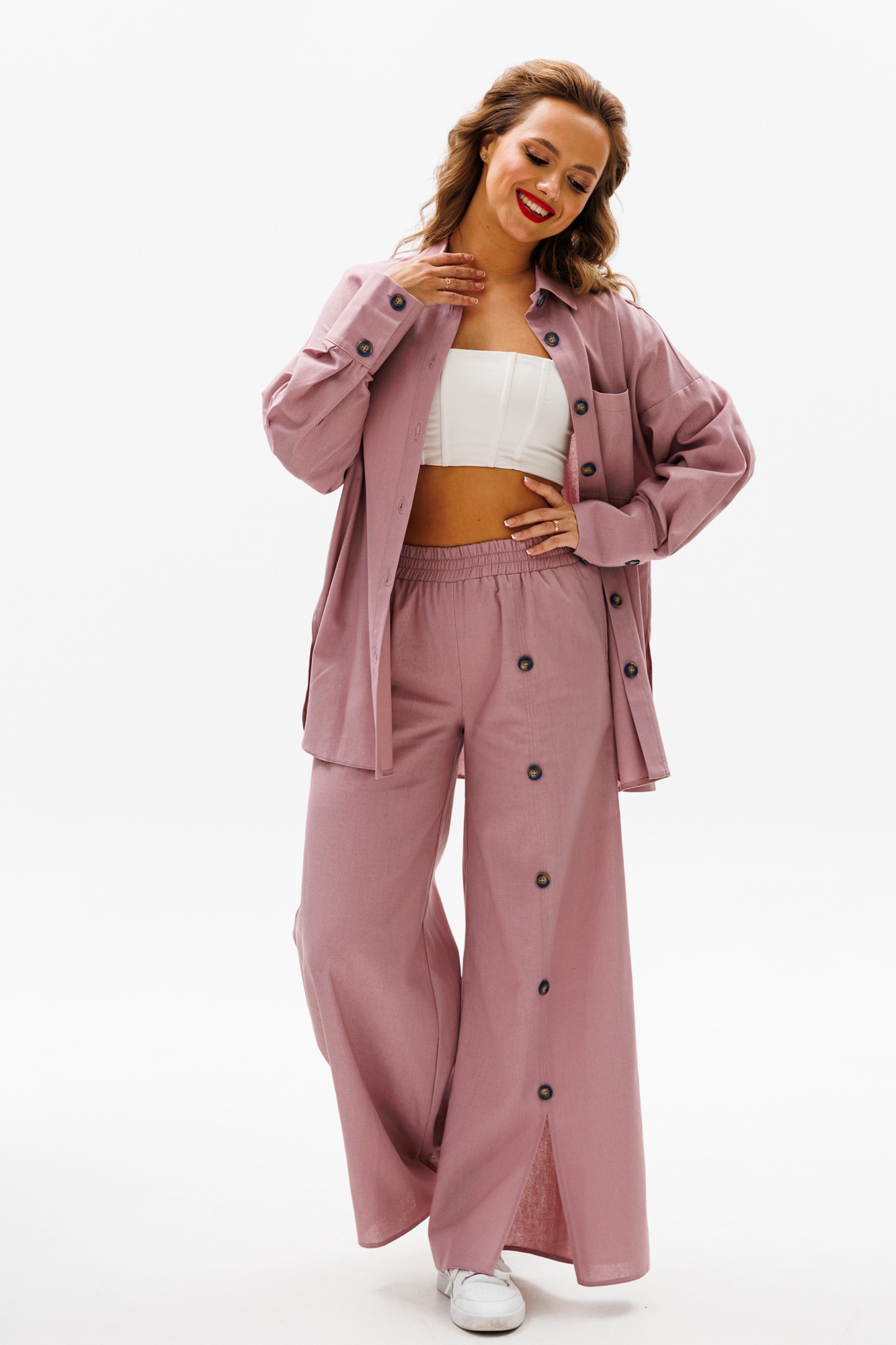 Комплект женский 2-х предметный ( блуза, брюки) из текстильной ткани. Блуза прямого силуэта со спущенным плечом. Рукав на высокой манжете, застежка на планку и пуговицы, воротник на стойке, по бокам разрезы и закругленные низа. С левой стороны полочки накладной карман. По спинке идет встречная складка. Брюки немного расширенные к низу от бедра, по передней части брюк с левой стороны идет разрез и пуговицы. Пояс на резинке, по бокам карманы.