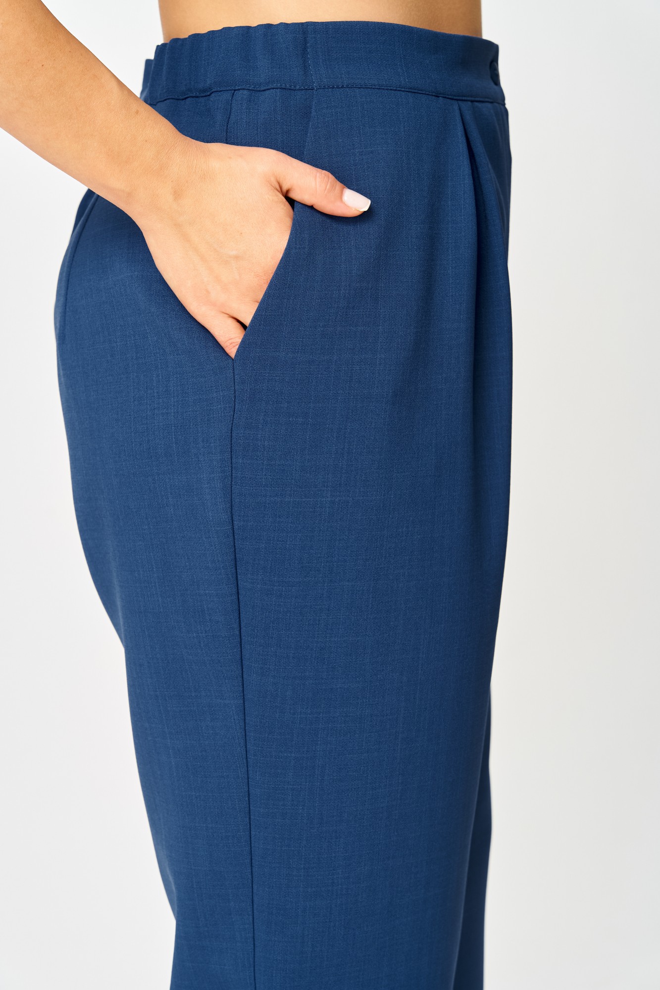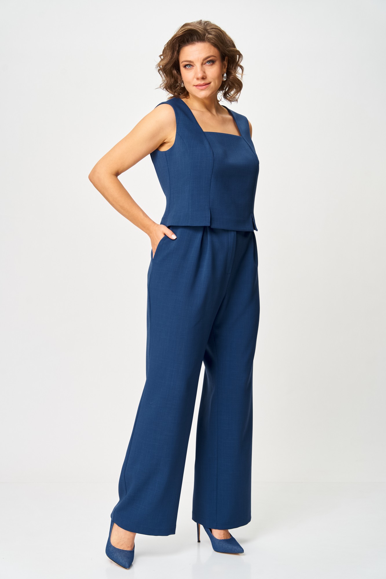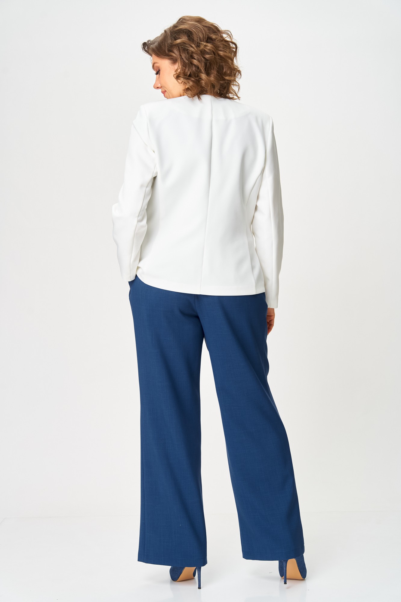 Костюм женский состоящий из топа, жакета и брюк выполнен из однотонной ткани двух контрастных цветов. Жакет прямого силуэта. Полочка жакета с притачными планками по борту и центральной застежкой встык на потайные крючки и декором из пуговиц. Полочка с вертикальными рельефами, отрезной нижней частью и клапанами. Горловина круглой формы. Спинка со средним швом и вертикальными рельефами. Рукав длинный, втачной, двухшовный. Жакет на подкладке. Топ полуприлегающего силуэта. Полочка топа с вертикальными рельефами, в нижней части которых обработаны разрезы. Горловина формы “каре”. Спинка топа со средним швом и вертикальными рельефами. В левом боковом шве обработана потайная молния. Брюки формы “палаццо”. По передней половинке выполнены наклонные карманы и по линии талии встречные складки. В среднем шве обработана застежка на молнию. По задним половинкам обработаны таллиевые вытачки. Брюки на притачном поясе с эластичной тесьмой и застежкой на петлю и пуговицу.