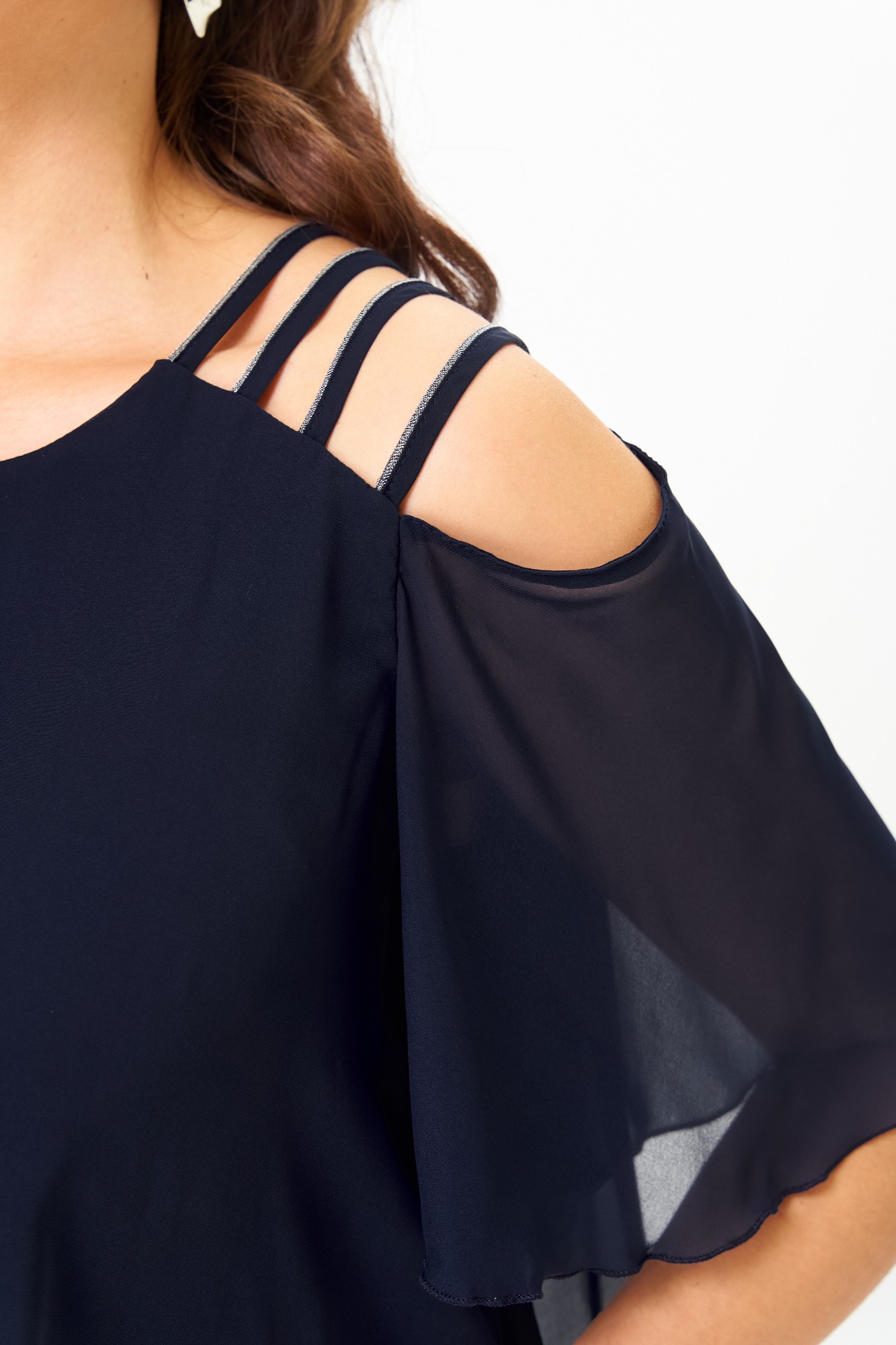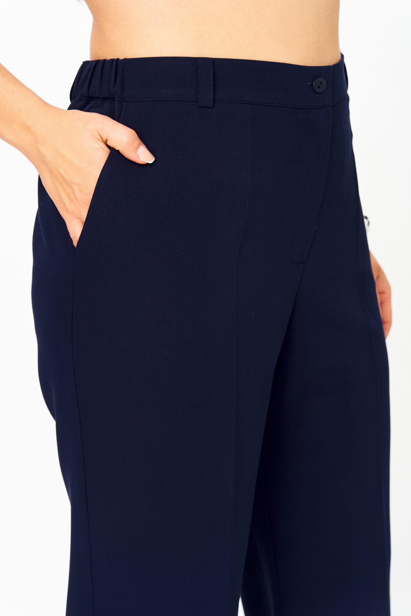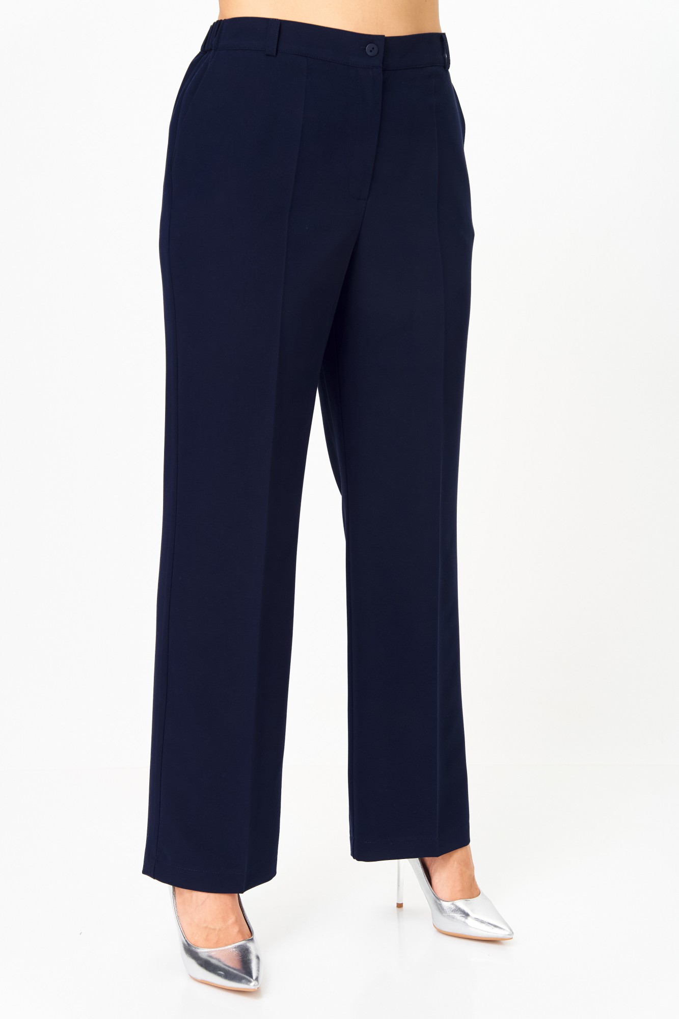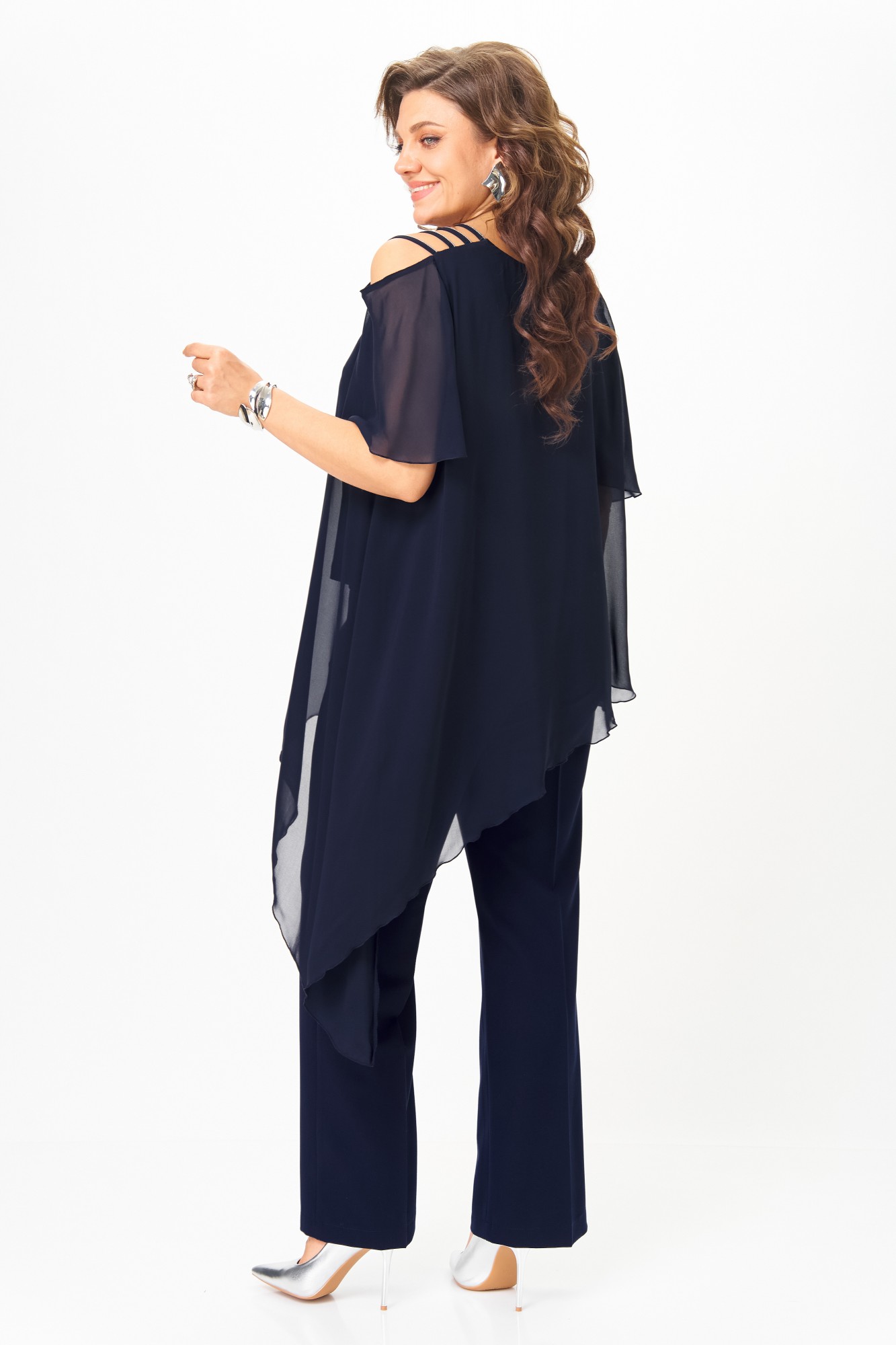 Комплект состоит из туники и брюк. Туника двухслойная, выполнена из однотонного полупрозрачного струящегося шифона (верхняя часть) и трикотажного однотонного полотна (нижняя часть). Брюки выполнены из костюмной однотонной ткани. Ткань брюк имеет механическое растяжение благодаря содержанию в ней эластана. Брючный костюм идеальный вариант на торжественные мероприятия. Туника А-образного силуэта с ассиметричным низом. Верхняя часть туники из шифона, полочка и спинка цельные, с круглой горловиной. Плечевой пояс на бретелях с декором из тесьмы с люрексом. Рукав в виде волана, длиной до локтя. Нижняя часть туники из трикотажного полотна, полочка с нагрудными вытачками, спинка цельная. Брюки полной длины, прилегающие в области бедер и свободные в колене и по низу. Брюки со стрелками. По передним половинкам выполнены наклонные карманы. В среднем шве передней половинки обработана застежка на молнию. По задней половинке обработаны таллиевые вытачки. По талии брюки на притачном поясе с эластичной тесьмой и застежкой на петлю и пуговицу. По поясу брюк обработаны шлевки под ремень.