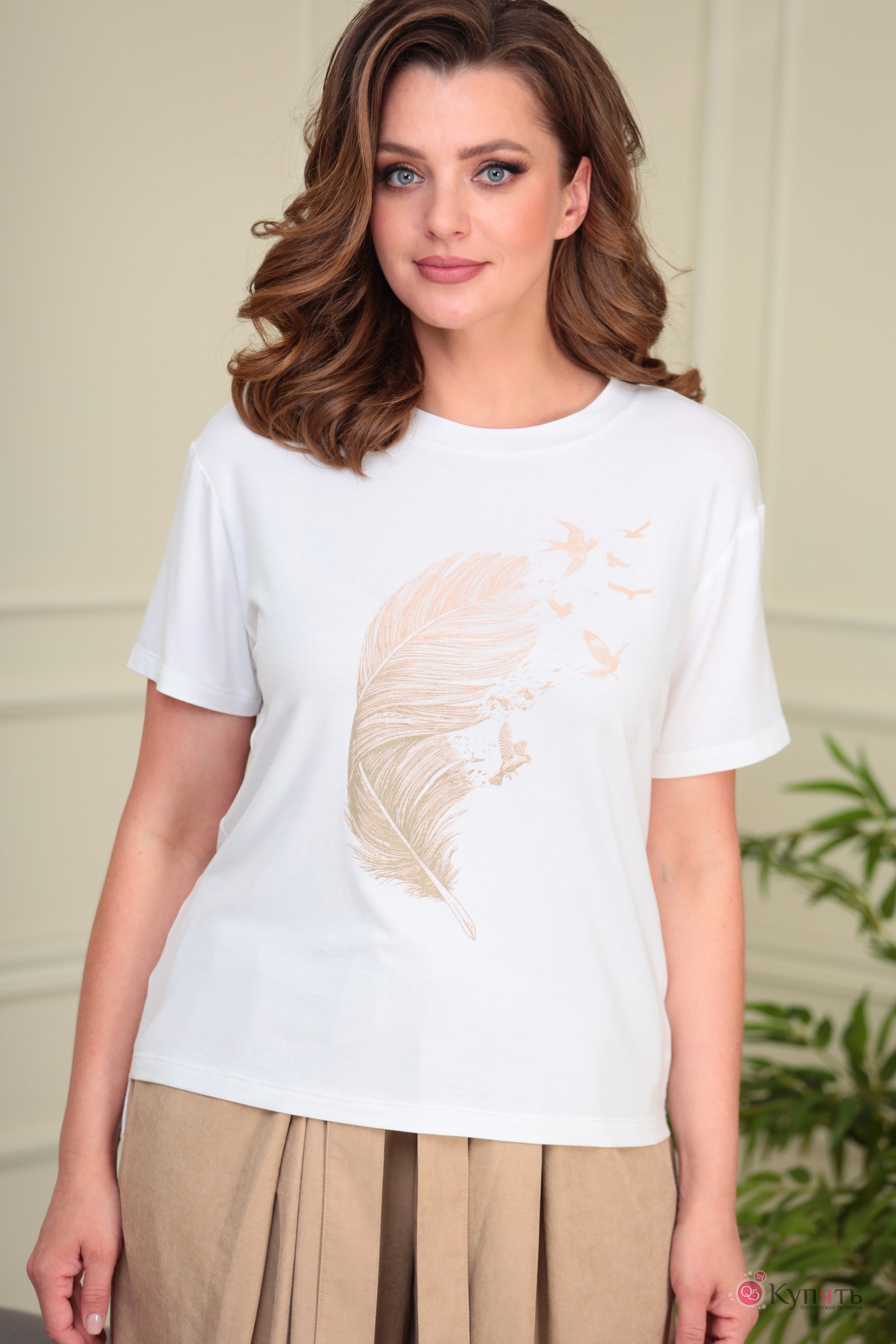 Костюм состоит из футболки и брюк. Футболка прямого силуэта выполнена из однотонного трикотажного полотна, с углубленной проймой. Полочка цельная, по центру которой выполнен принт. Горловина круглой формы, спинка цельная длиннее полочки. Рукав рубашечного типа, одношовный, короткий. Брюки выполнены из однотонной ткани. Брюки-кюлоты имеют широкие укороченные штанины, по передней половине по центру каждой штанины выполнена встречная складка, и карманы. Кюлоты по талии на призрачном поясе с эластичные тесьмой и настроченными шлевками, через которые пройдет съемный пояс-ремень.