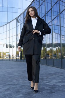 Костюм женский двойка, состоящий из удлиненного жакета и брюк, выполнен из смесовой хлопчатобумажной ткани.