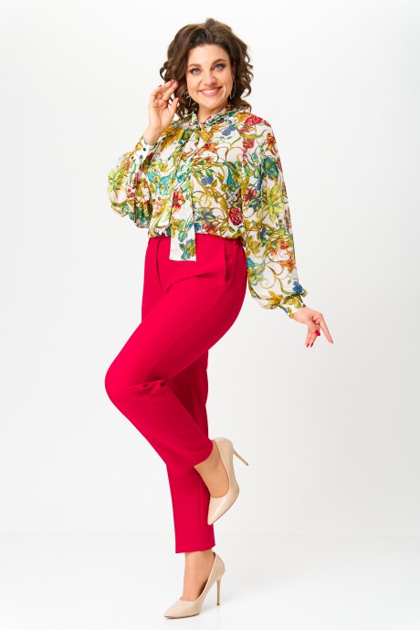 Комплект дополняет блузка шифоновая с синими и красными цветами, с объемными рукавами покроя реглан на манжетах, с планкой на пуговицах. V-образная горловина с воротником-стойкой с удлинёнными концами, которые завязываются на бант. Блузка прекрасно сидит на фигуре, прямой крой вещи вытягивает силуэт, скрывает несовершенства и подчёркивает достоинства.