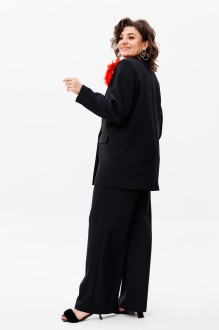 Прямой двухбортный жакет, брюки на резинке по спинке и с карманами.