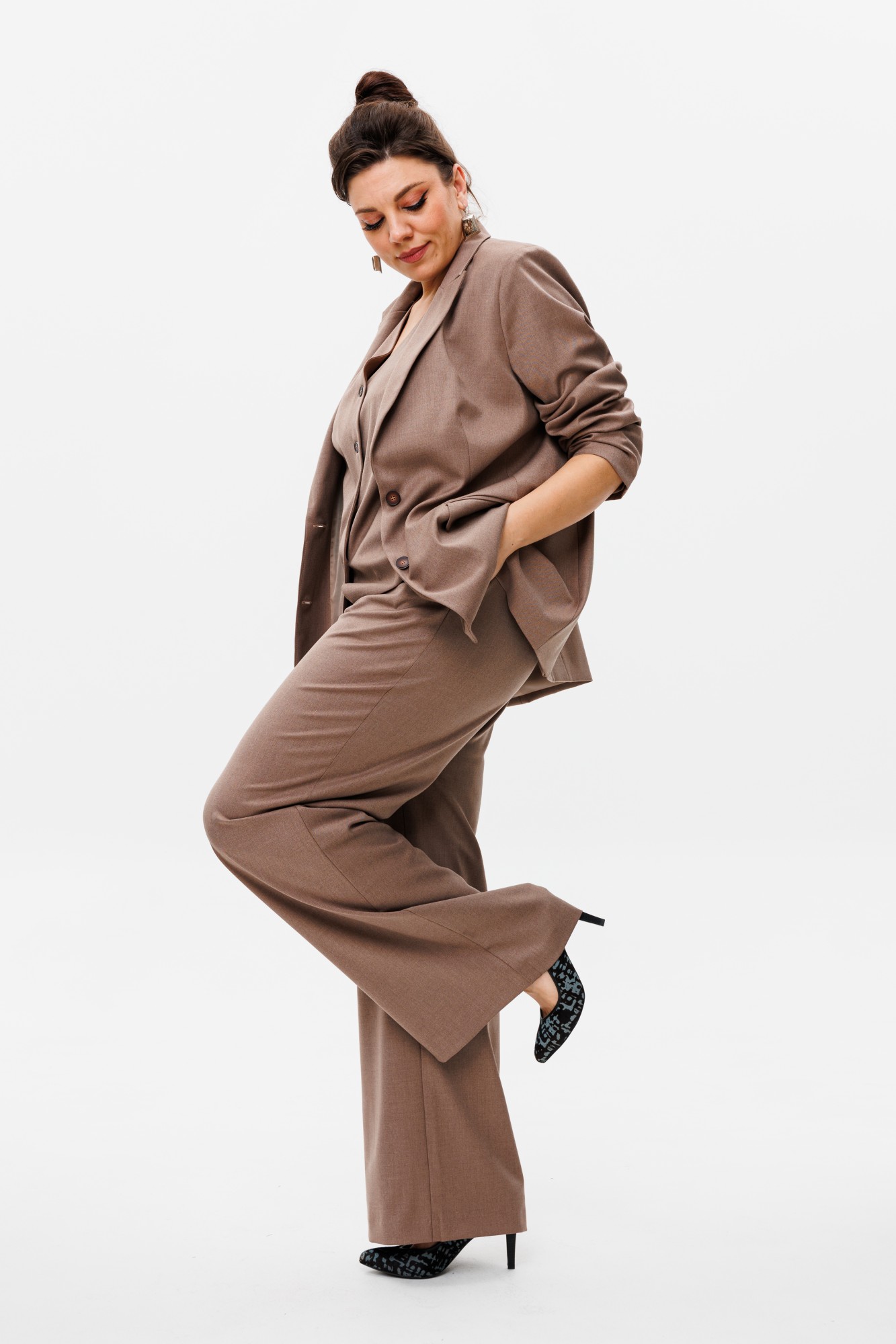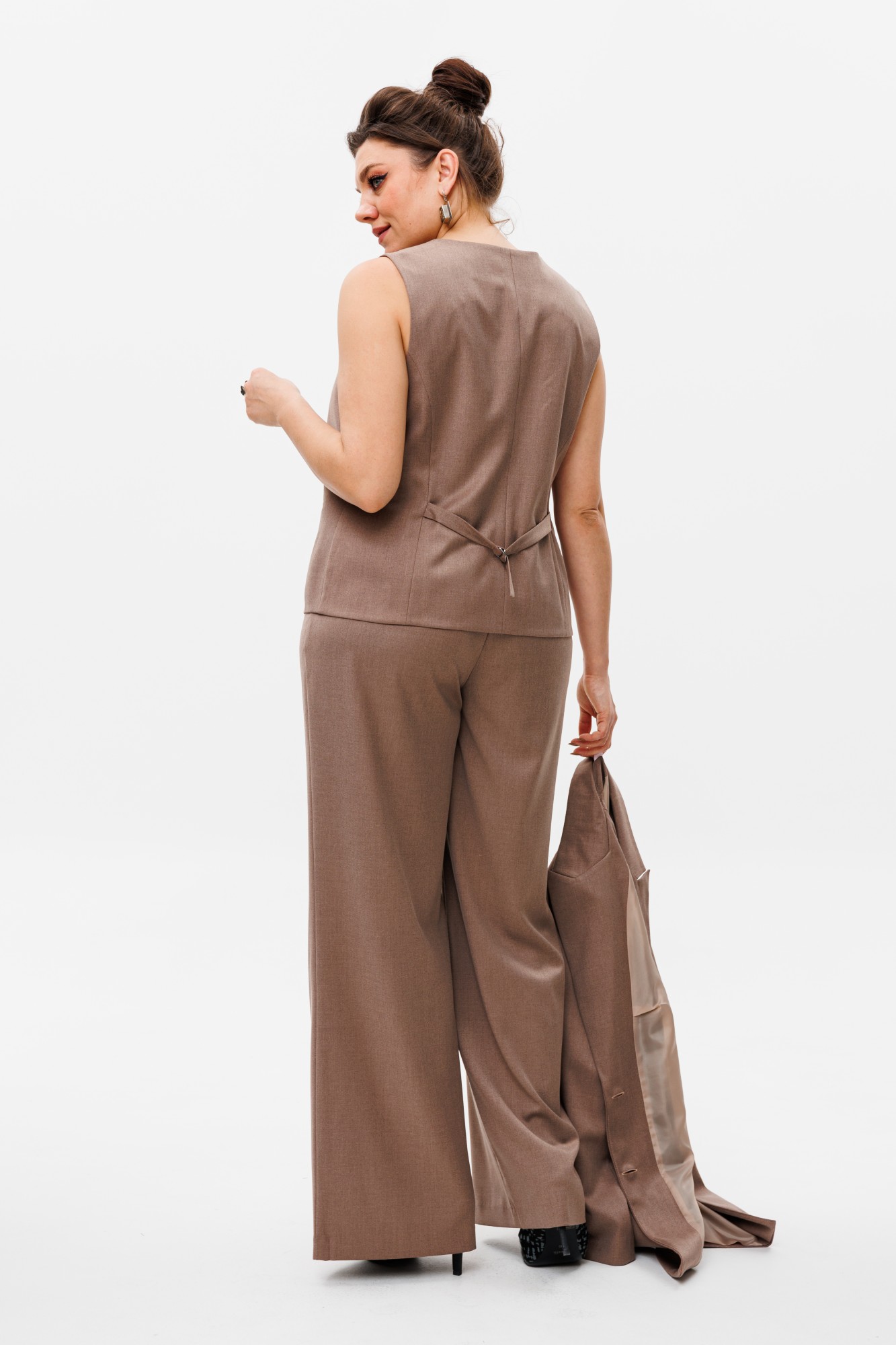 Этот костюм - это шик и универсальность. Жакет бойфренда сочетает в себе элегантность и комфорт, прямые брюки придают вам стройность и уверенность, а жилет завершает образ, добавляя нотку роскоши, брюки на резинке. Все это - актуальная классика, которая никогда не выйдет из моды.