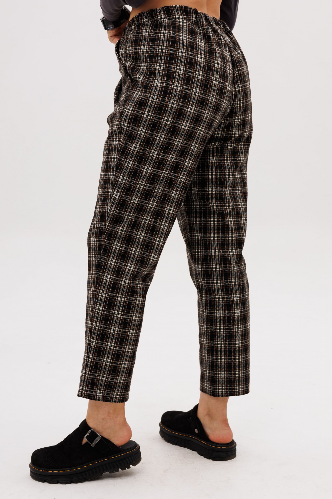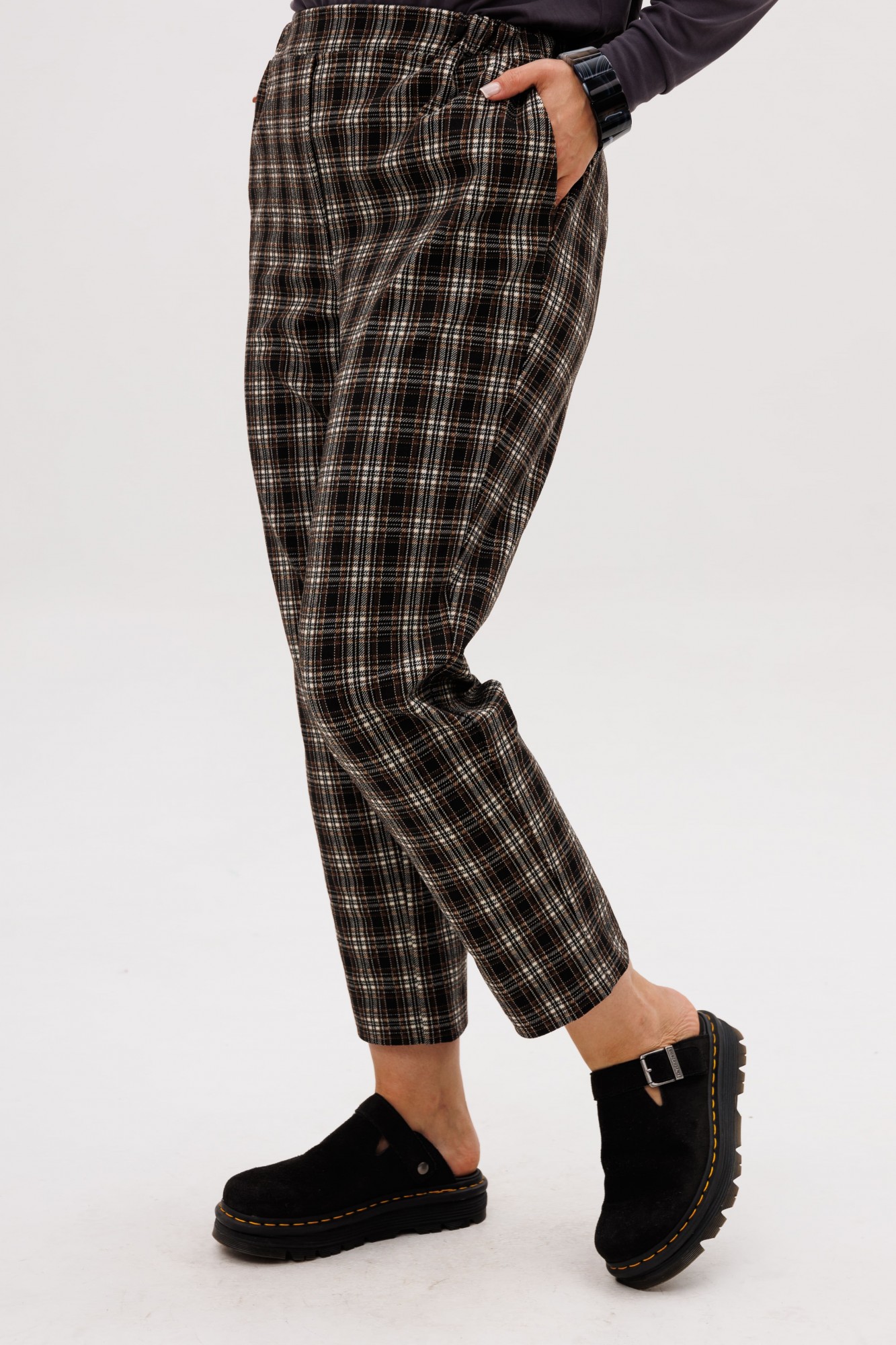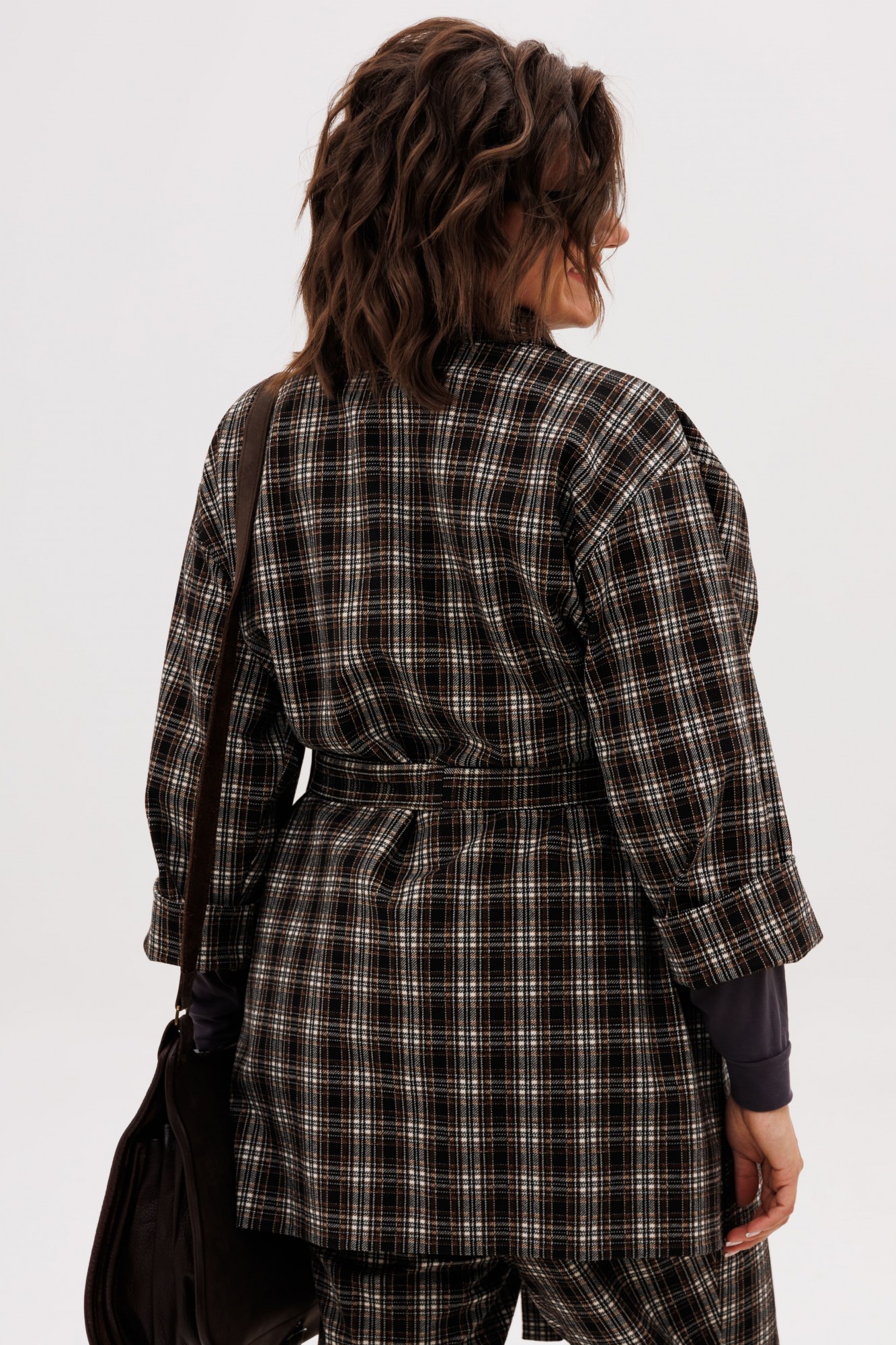 Костюм из утеплённого трикотажного полотна, выполненный в цвете «каштановая история» с классическим клетчатым принтом. Этот актуальный предмет гардероба обладает вневременной притягательностью, оставаясь стильным независимо от сменяющихся тенденций.