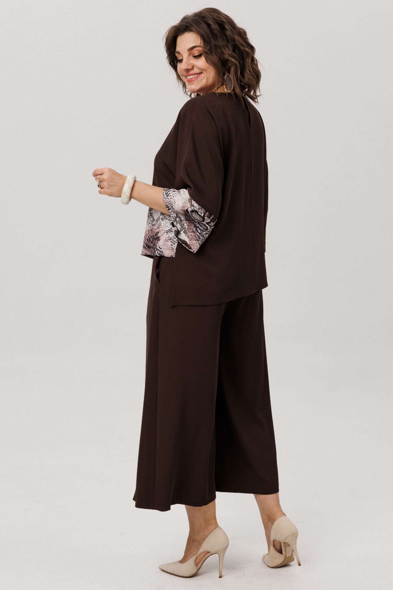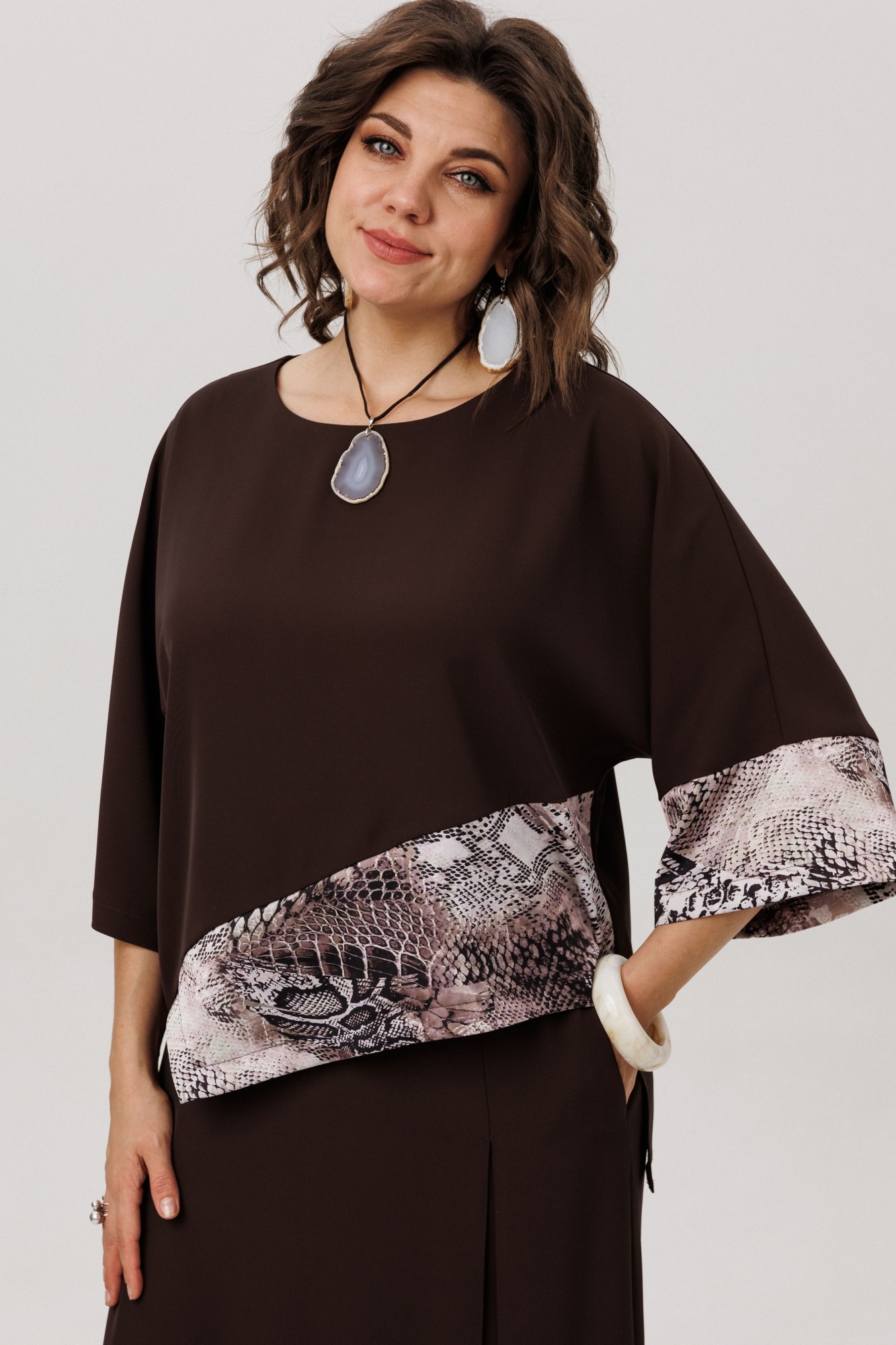 Сочетание строгого силуэта и лёгкой небрежности в цвете «древесная змея». Его основу составляет блузон шоколадного оттенка, оживлённый тонким змеиным узором. Он свободно обрисовывает фигуру, смягчая линии цельнокроеными рукавами. А его главная деталь - фигурный, словно волной очерченный низ, который придаёт статичному крою неожиданную динамику.
