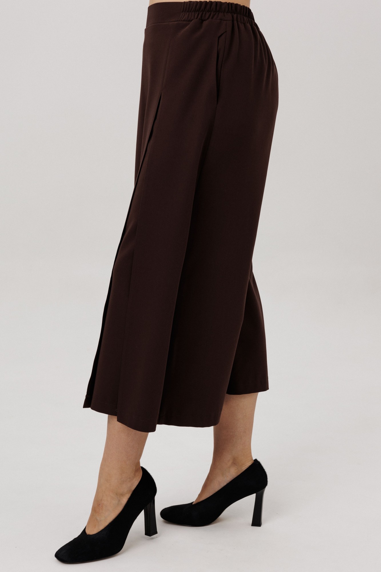 Низ костюма это юбка-брюки-кюлоты на высокой талии, струящиеся и расклешённые. Модель на запах с мягкими складками создаёт ощущение простора и лёгкости, а скрытые, фигурные карманы в швах берегут чистоту линий.
