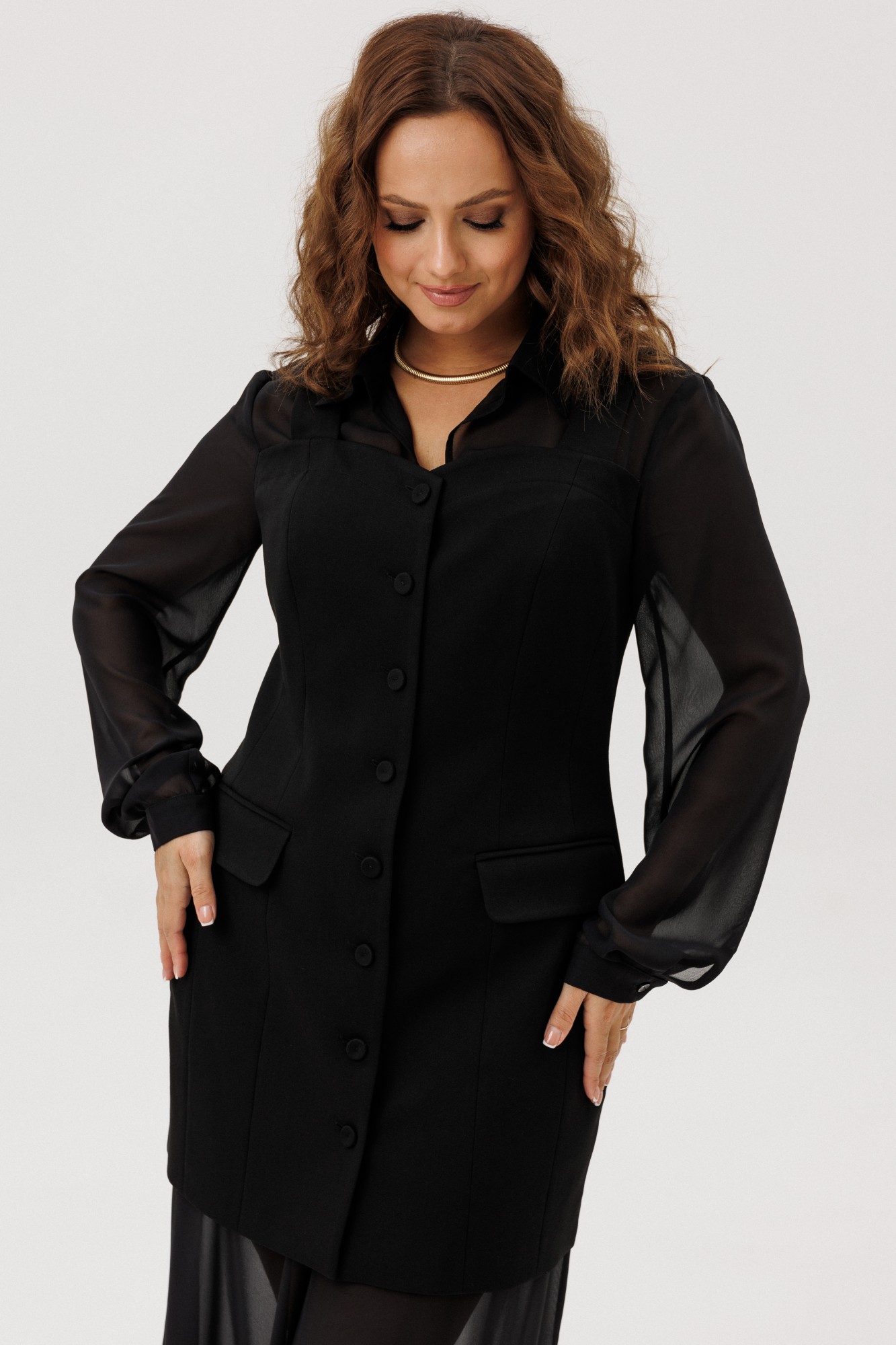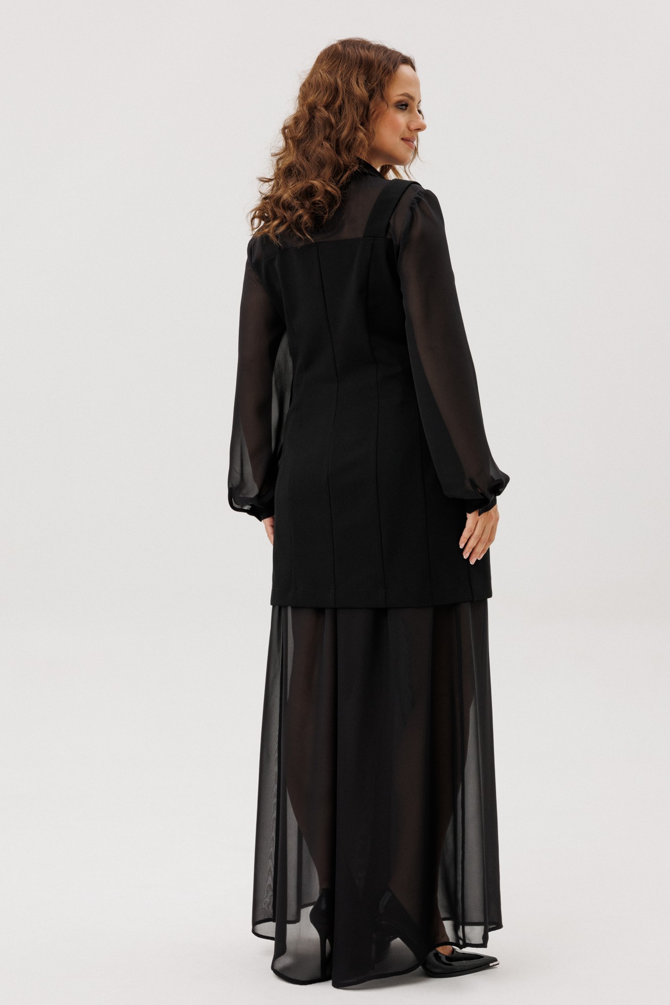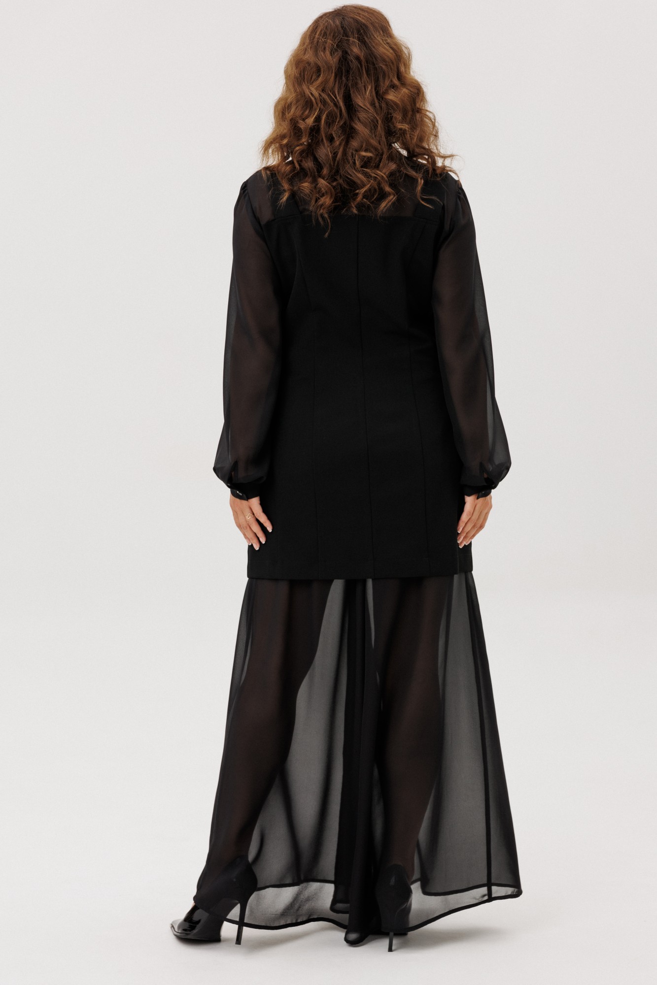 Костюм из жакета с имитацией рубашки и широких брюк. Жакет из костюмной ткани малого объема, приталенного силуэта с имитацией рубашки из шифона, на частичной подкладке по переду. На широких бретелях. Брюки широкие на подкладке. Застежка на потайную молнию в боковом шве, на поясе, по спинке резинка. Рост модели на фото 170 см.