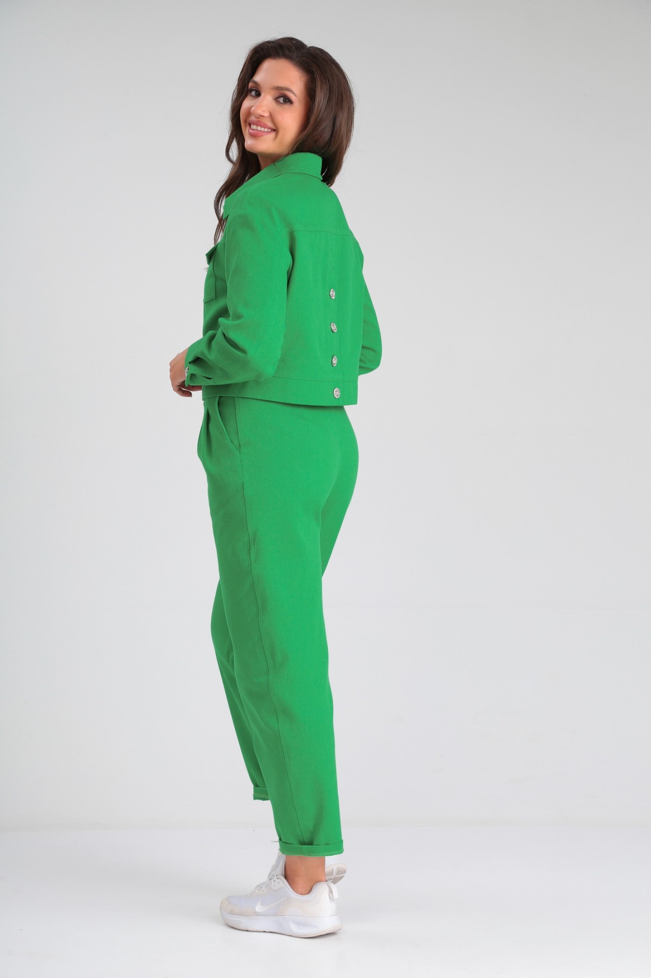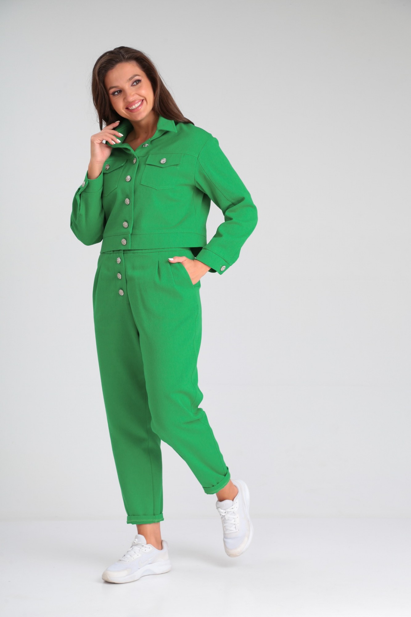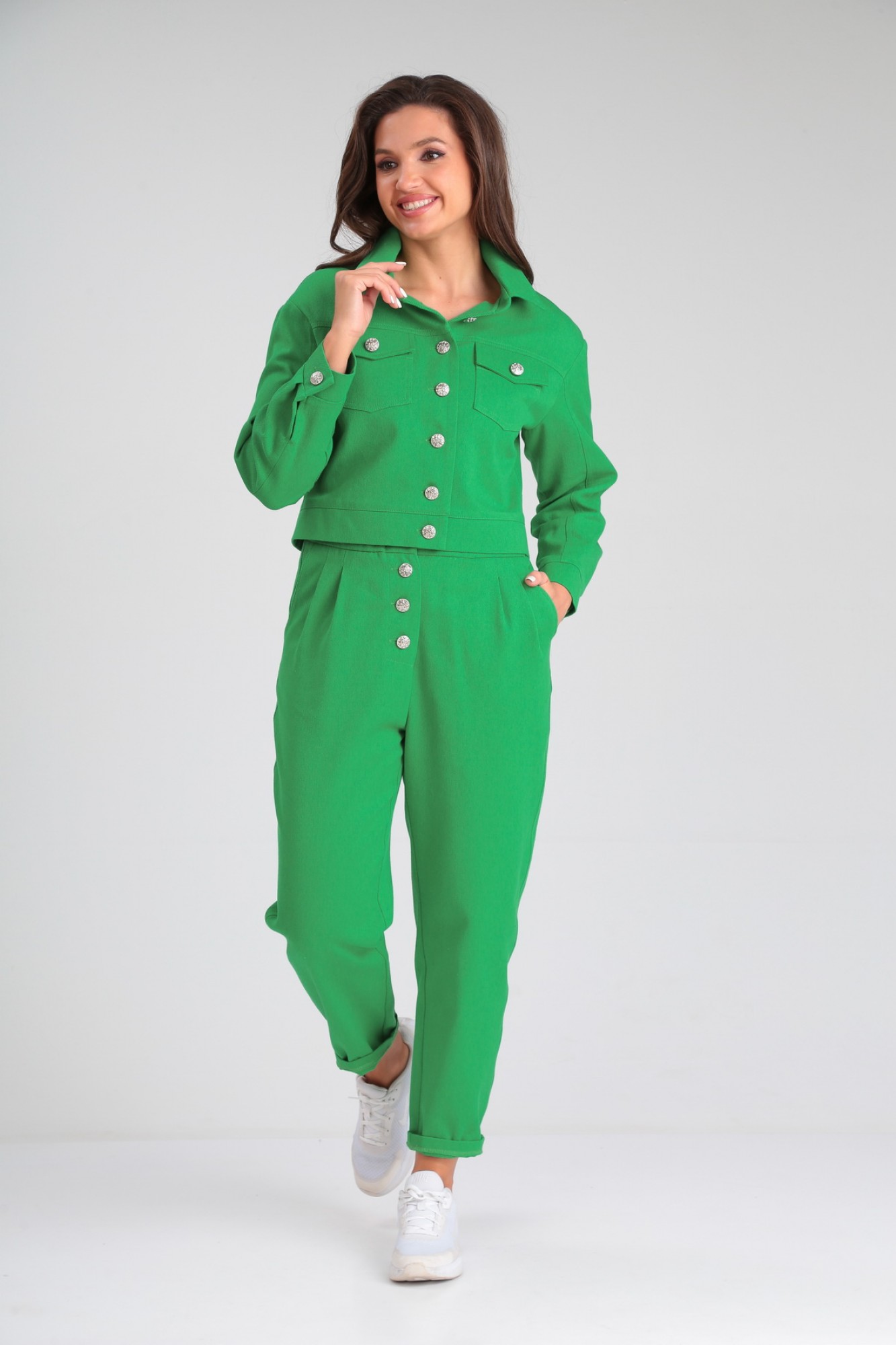 Модный костюм, состоящий из облегченной куртки и брюк, идеально подчеркнет вашу индивидуальность. Куртка прямого силуэта, слегка укорочена, с центральной застежкой на петли - пуговицы. По переду и спинке изделия выполнена кокетка. По передней полочке куртки расположены накладные карманы с клапанами, декорированные пуговицами. По спинке в среднем шве выполнена шлица с застежкой на петли-пуговицы. Рукав втачной трехшовный полной длины. Низ рукава обработан манжетой. По локтевому шву в нижней части рукава предусмотрен разрез. Комфортные брюки кроя «бананы», выполнены с высокой линией посадки, свободные вверху и слегка заужены к линии щиколотки, создадут элегантный образ для комфортных будней. Пояс притачной с эластичной тесьмой. Застёжка спереди типа «гульфик» на пуговицах. От верхнего среза брюк спереди к боковым швам выполнены косые входы во внутренние карманы.