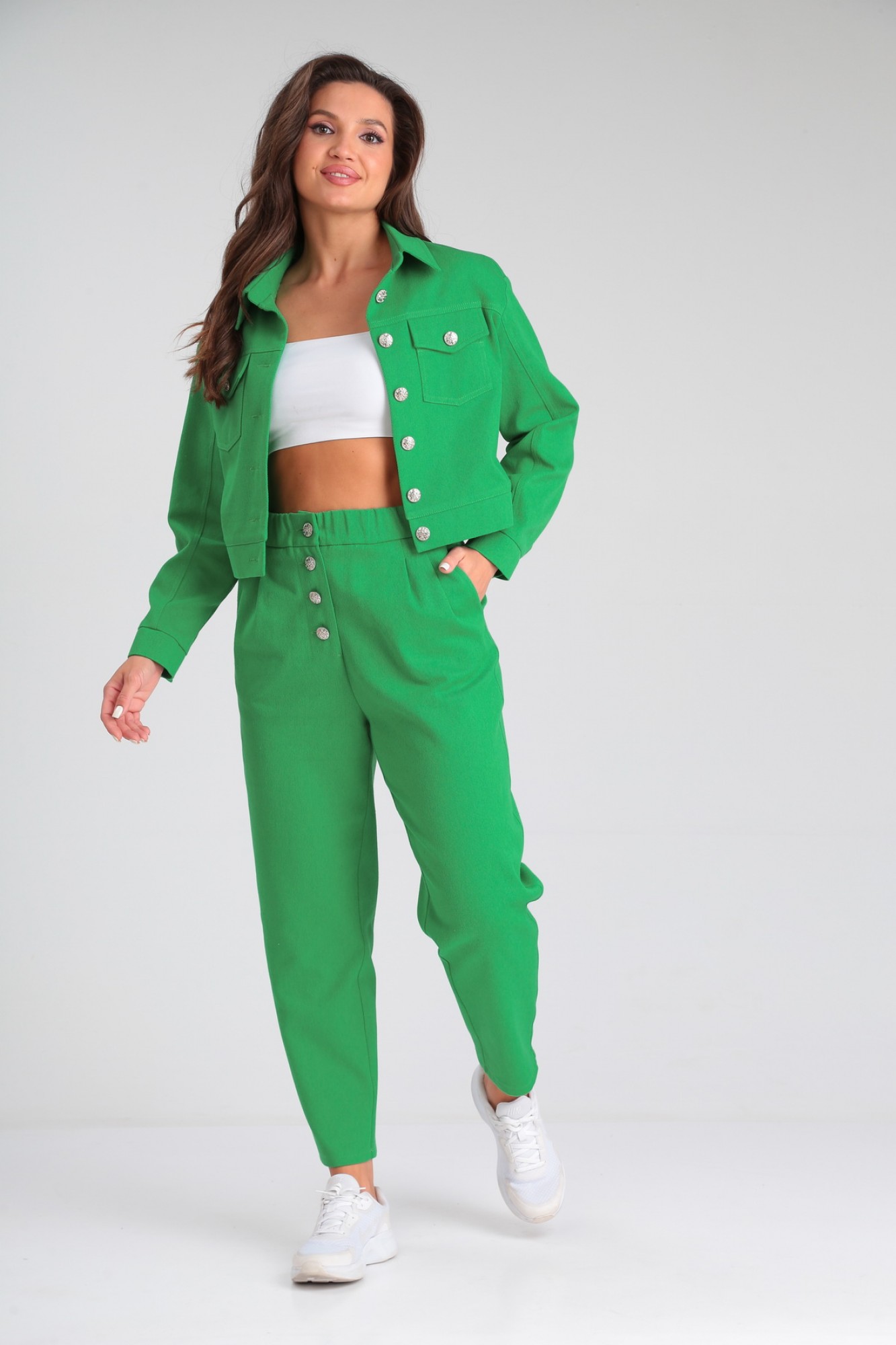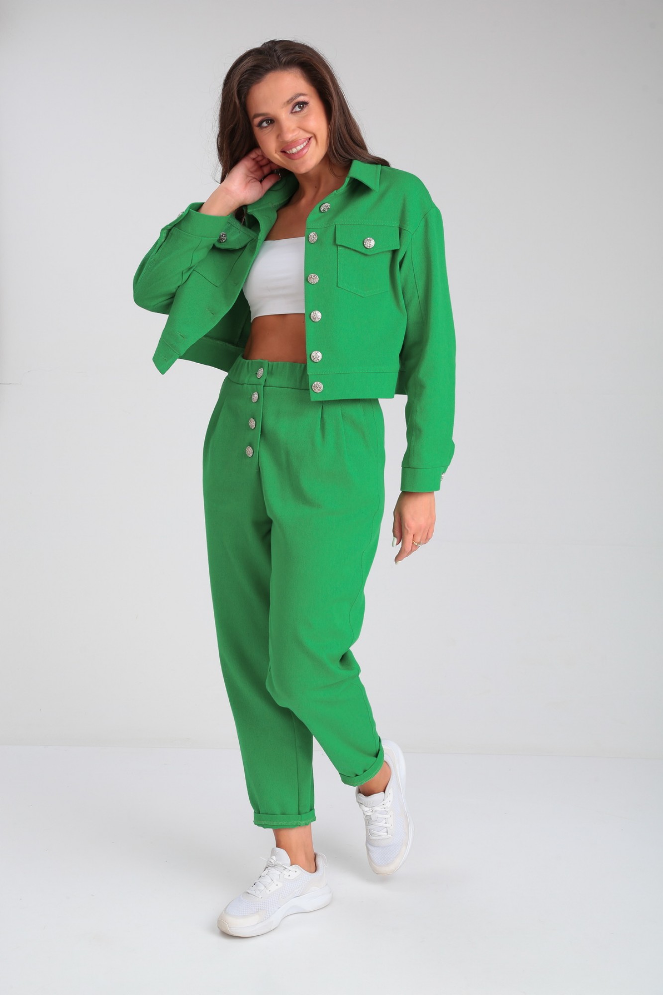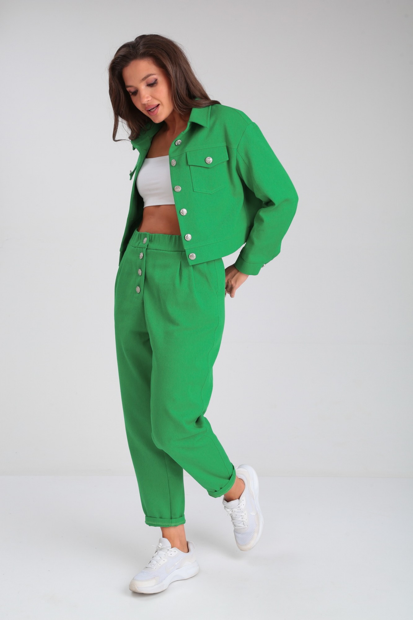 Модный костюм, состоящий из облегченной куртки и брюк, идеально подчеркнет вашу индивидуальность. Куртка прямого силуэта, слегка укорочена, с центральной застежкой на петли - пуговицы. По переду и спинке изделия выполнена кокетка. По передней полочке куртки расположены накладные карманы с клапанами, декорированные пуговицами. По спинке в среднем шве выполнена шлица с застежкой на петли-пуговицы. Рукав втачной трехшовный полной длины. Низ рукава обработан манжетой. По локтевому шву в нижней части рукава предусмотрен разрез. Комфортные брюки кроя «бананы», выполнены с высокой линией посадки, свободные вверху и слегка заужены к линии щиколотки, создадут элегантный образ для комфортных будней. Пояс притачной с эластичной тесьмой. Застёжка спереди типа «гульфик» на пуговицах. От верхнего среза брюк спереди к боковым швам выполнены косые входы во внутренние карманы.