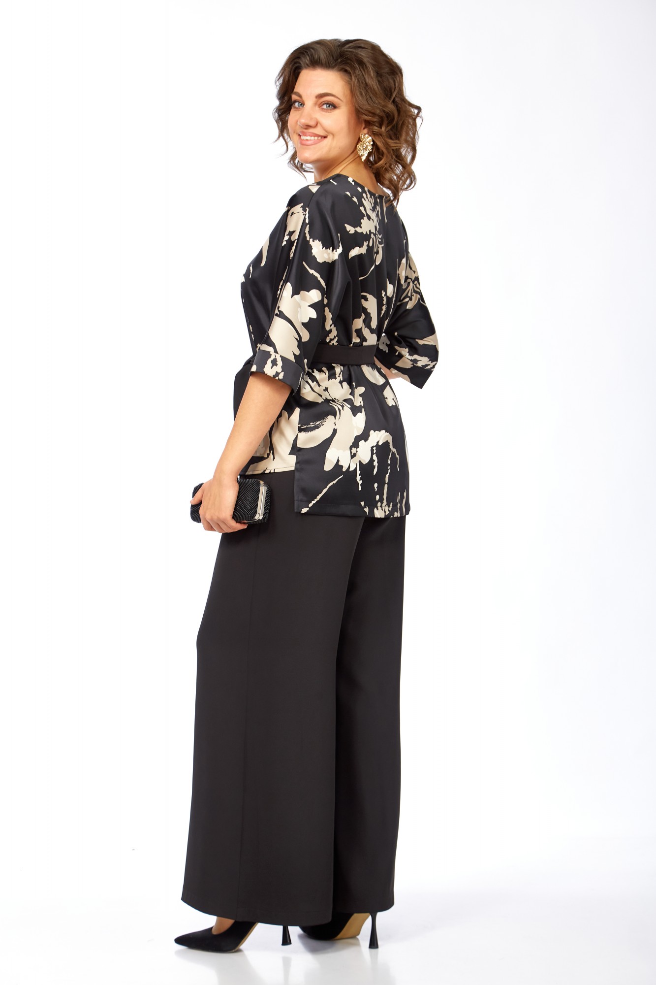 Нарядный женский комплект состоит из свободной блузы и широких брюк "палаццо", выполнен из двух видов ткани.