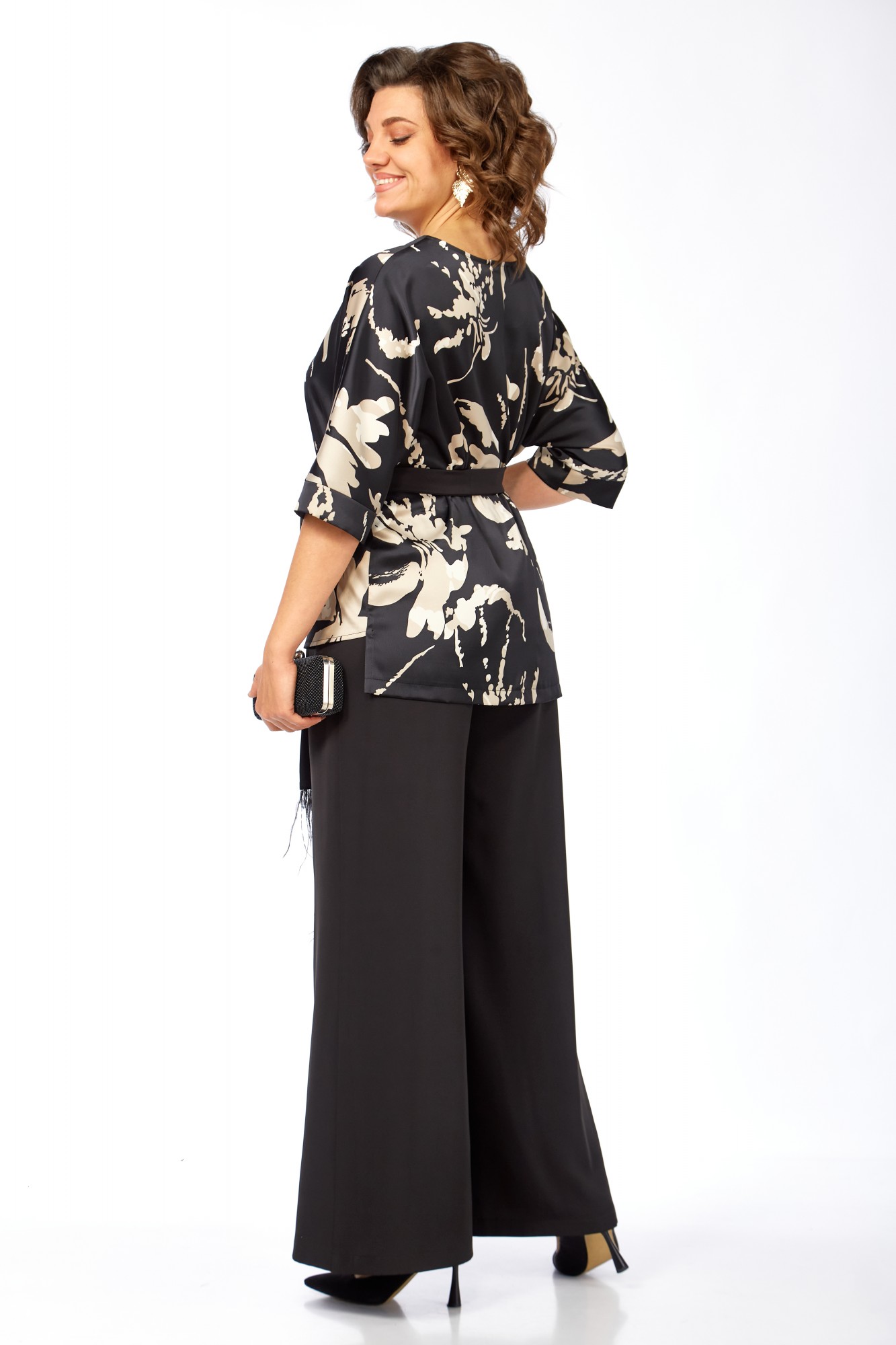 Комплект дополнен поясом-завязкой из ткани брюк с бахромой из перьев на концах.
