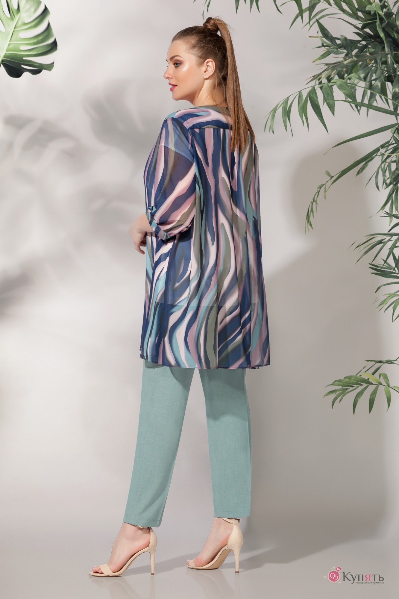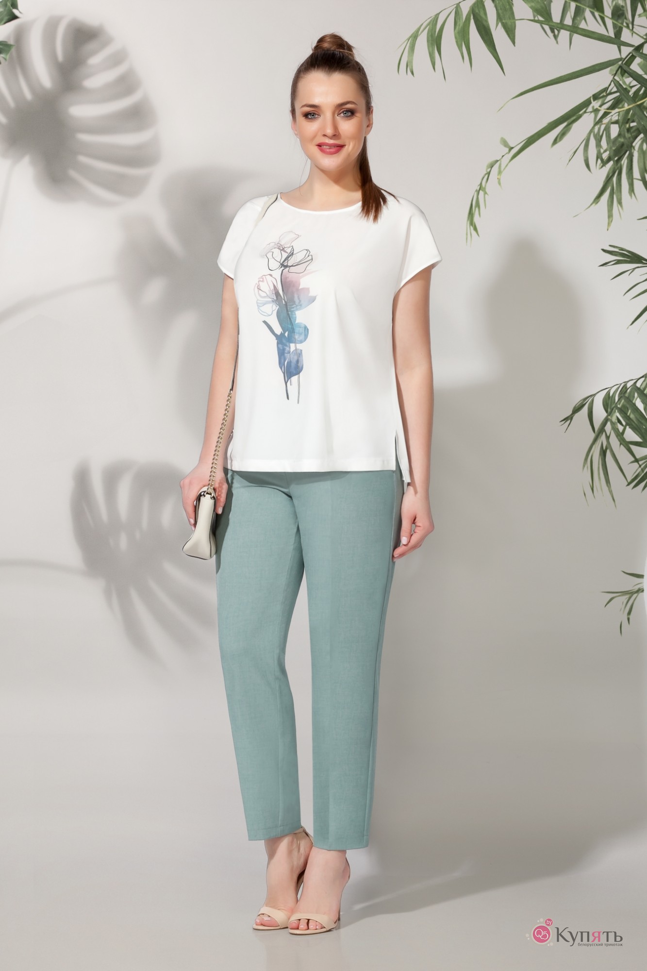 Костюм, состоящий из блузона, брюк и топа из искусственного шёлка! Блузон распашной из шифона, прекрасно садится на любую фигуру, рукав 3/4, втачной одношовный! Низ рукава оформлен притачной манжетой. Топ выполнен из искусственного шёлка, линия плеча спущена, облегание достигнуто за счёт нагрудной вытачки. По переду топа печать! Брюки выполнены из льна вишера, заужены к низу, верх брюк обработан притачным поясом с резинкой.