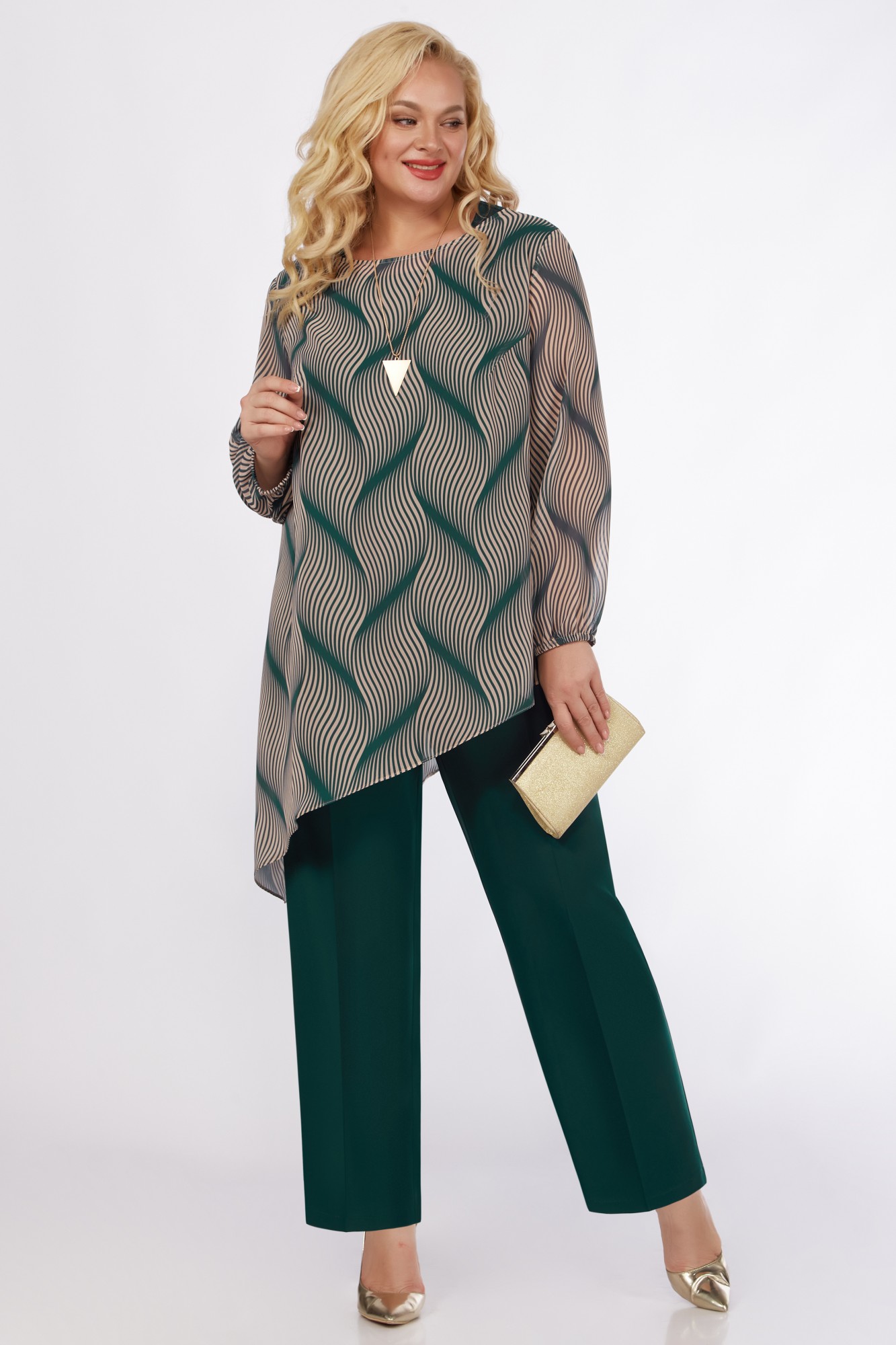 Комплект женский трёхпредметный , состоит из блузы и брюк, выполненных из шелковистой плательно-костюмной ткани и туники , выполненной из шифона.
